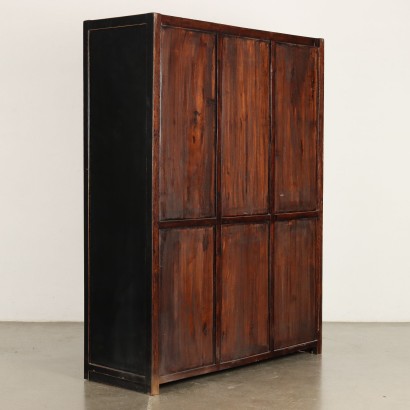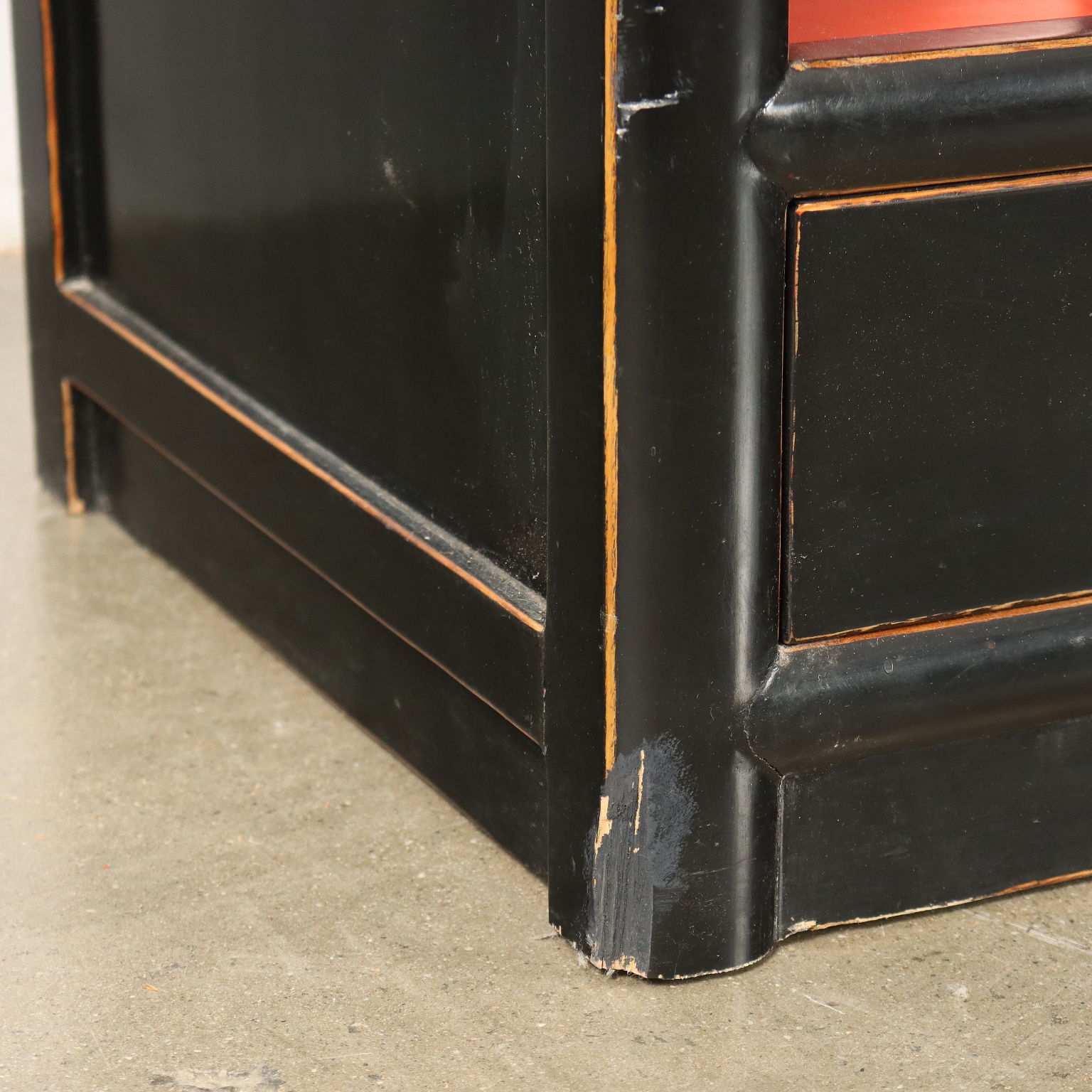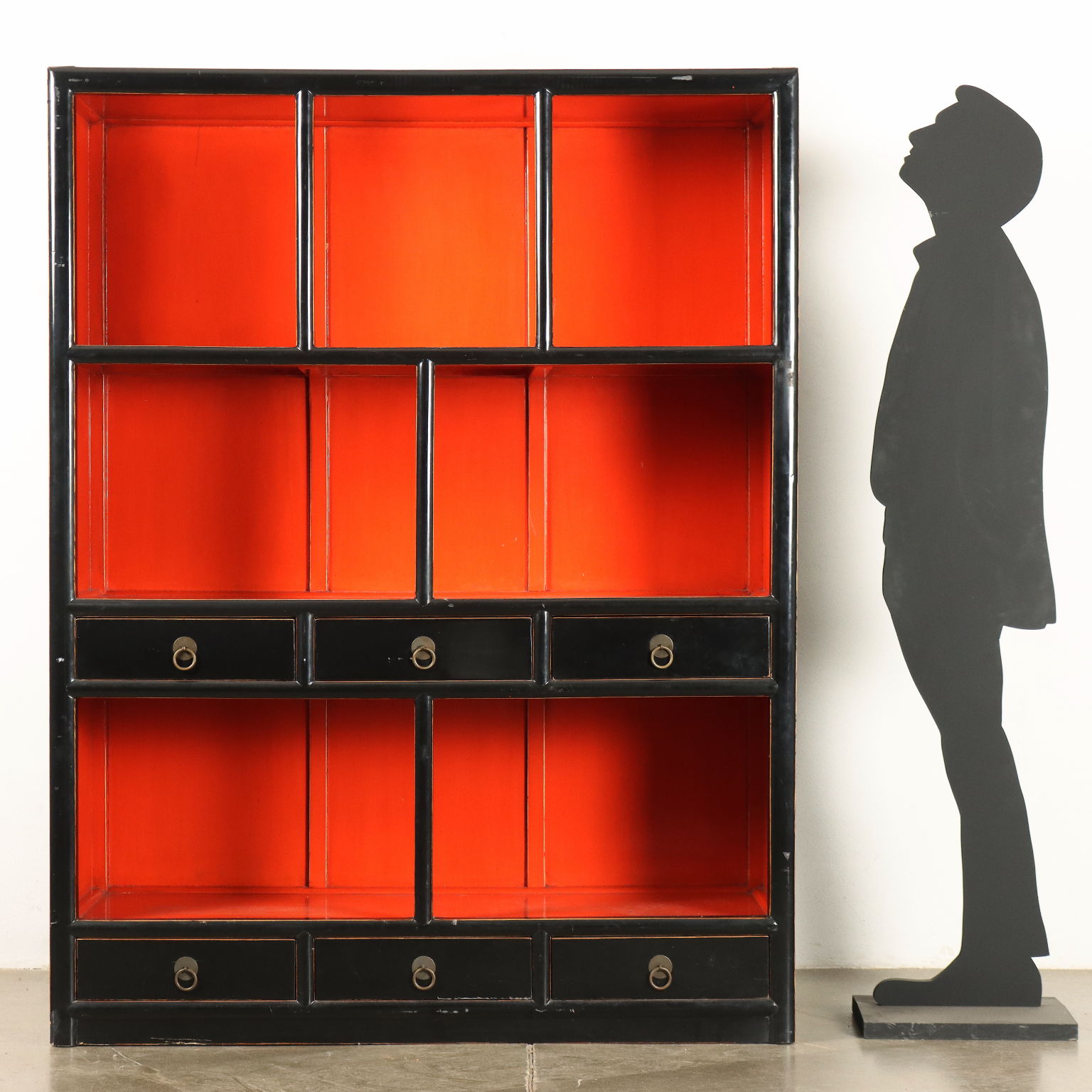Librería con compartimentos abiertos y doble hilera de cajones; Totalmente lacado en rojo y negro.