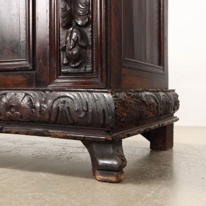 Descripción Arcón neorrenacentista elaborado con piezas antiguas, como el marco inferior tallado; montantes tallados con cariátides.