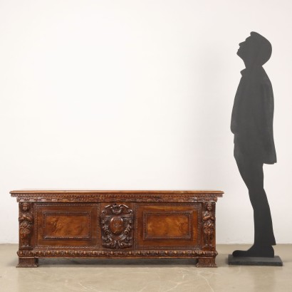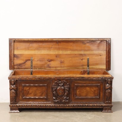 Arcón de nogal sostenido por pies de ménsula, el frente está tallado con dos cariátides aladas laterales para enmarcar dos paneles con marcos de hojas sucesivas y geométricas, en el centro está tallado un escudo que representa un león rampante portando una espada y con tres estrellas y tres lirios en la cabeza. La banda inferior es vainosa, mientras que la superior es foliácea, tapa con marco dentado en el frente.