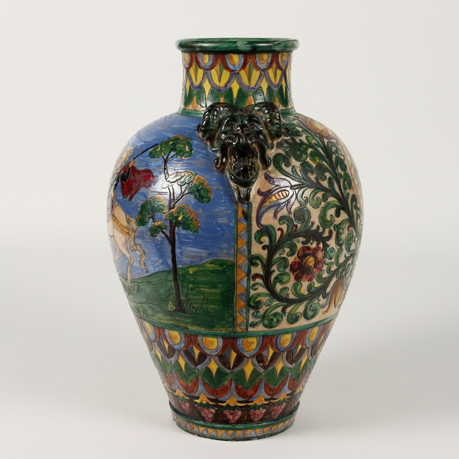 Gran jarrón de cerámica rayada y pintada. En el vientre, San Jorge y el dragón y un redondel con antifaz rodeado de decoraciones con motivos vegetales. Motivos repetidos de banda ancha en base y cuello. Tomadas con cabezas de carácter mitológico. Bajo la marca base de fabricación italiana.