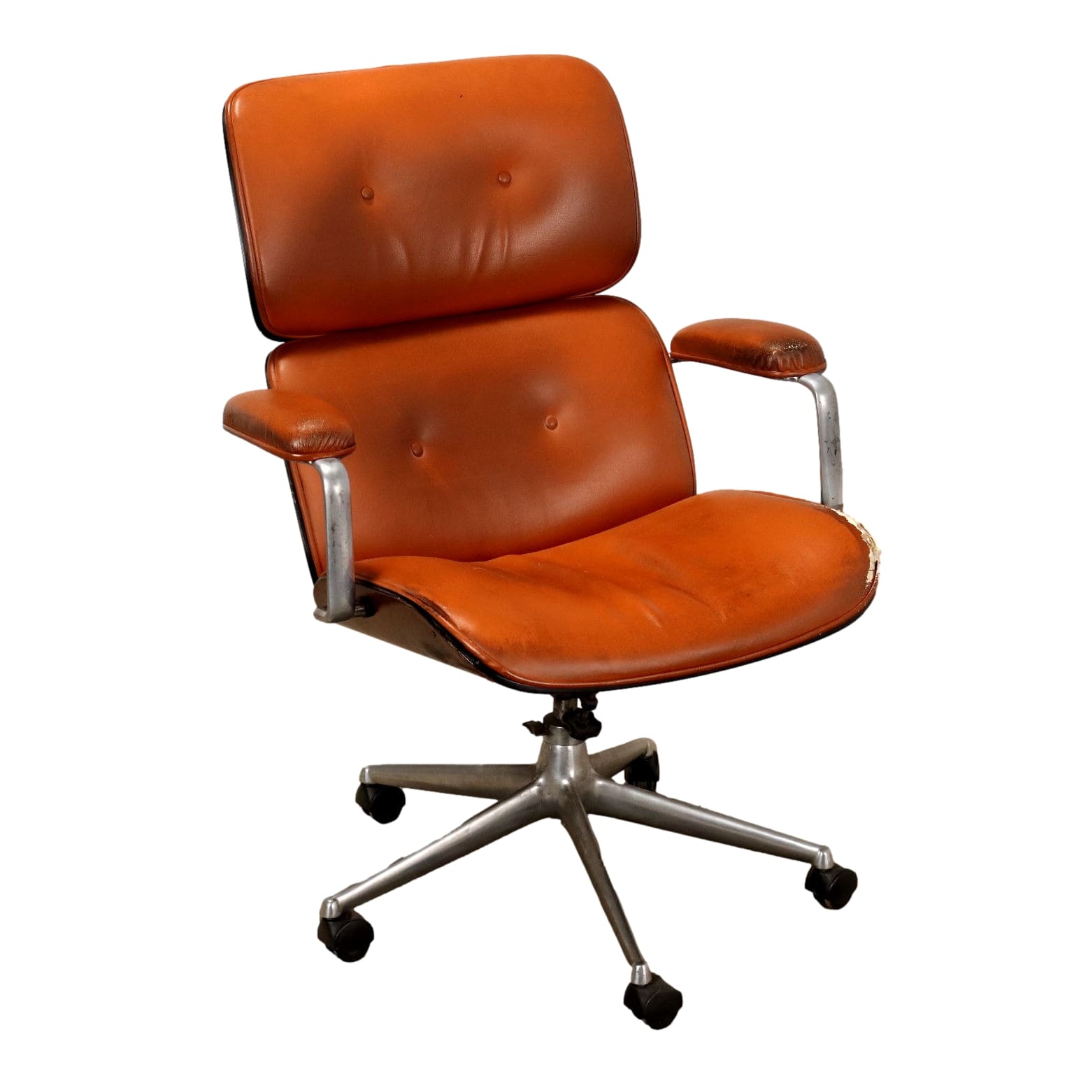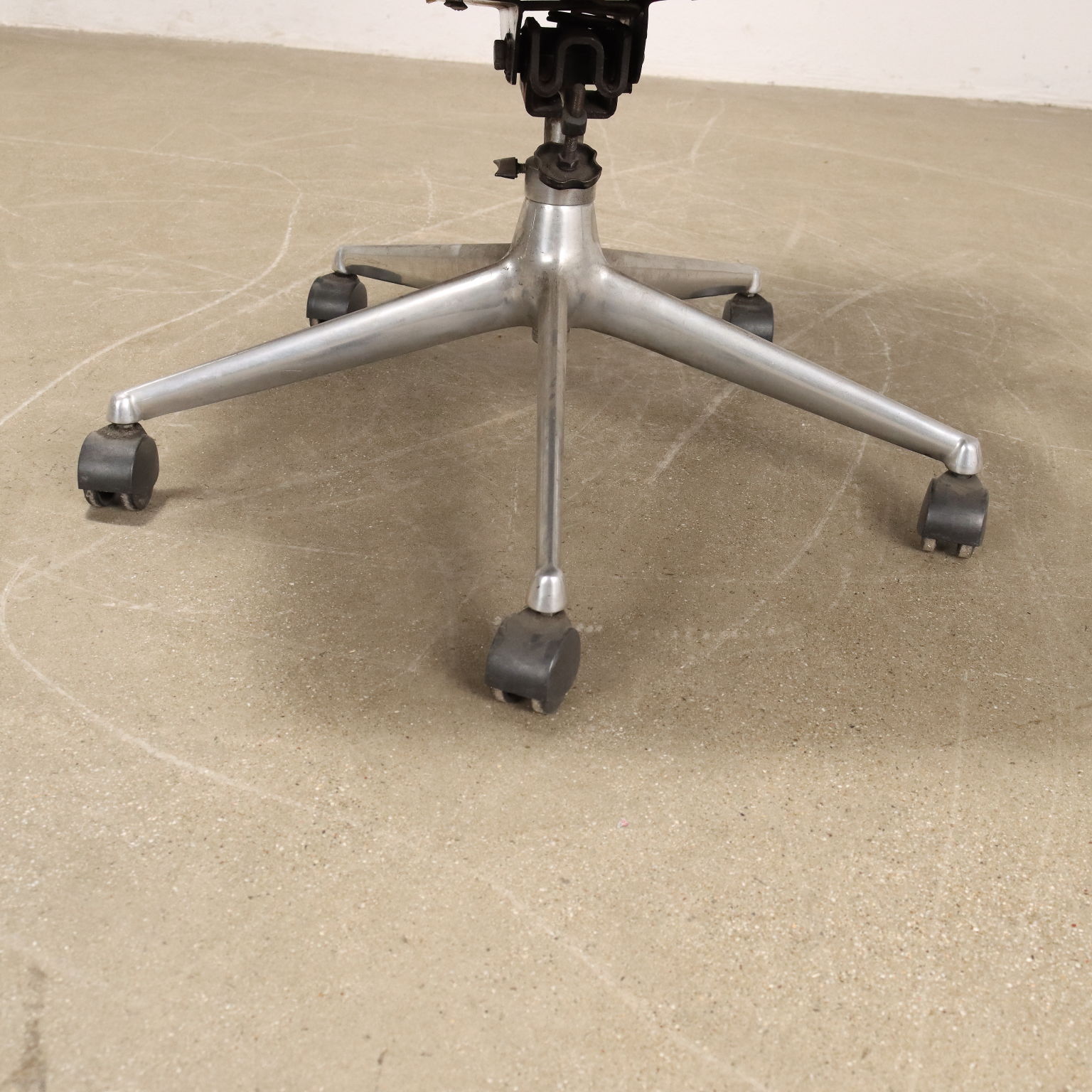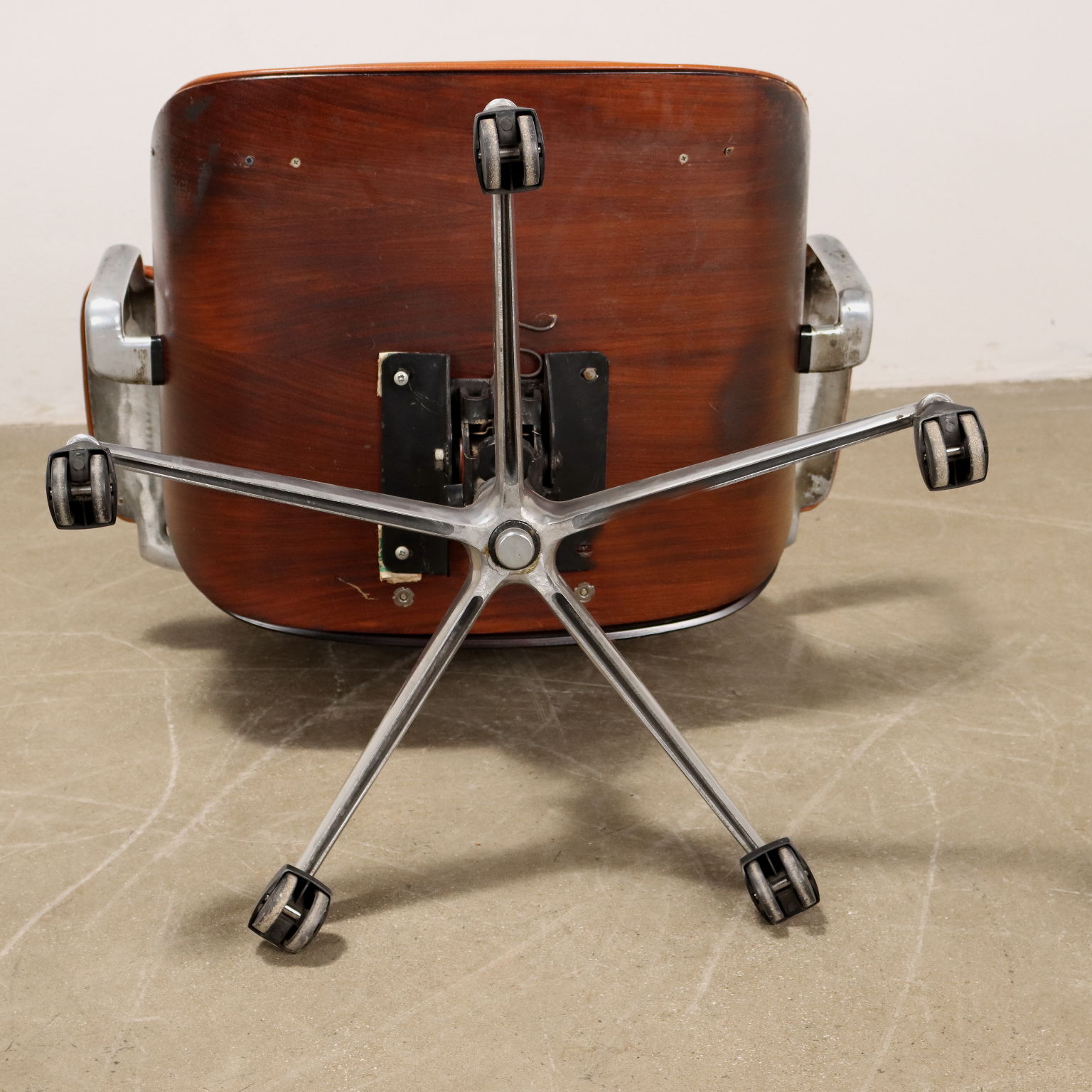 Poltrona da ufficio con braccioli e base in alluminio a cinque razze con rotelle, scocca della seduta e dello schienale in compensato curvato, imbottitura e rivestimento originali in espanso e skai.