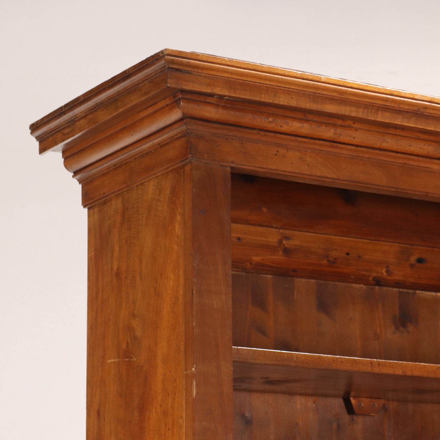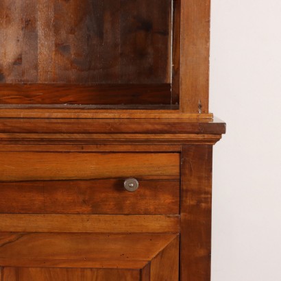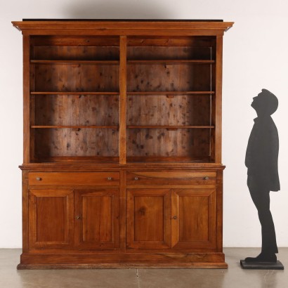 Librería realizada con madera antigua, cuerpo inferior con dos pares de puertas y dos cajones en la banda, balda abierta de dos cuerpos y baldas; en nuez.