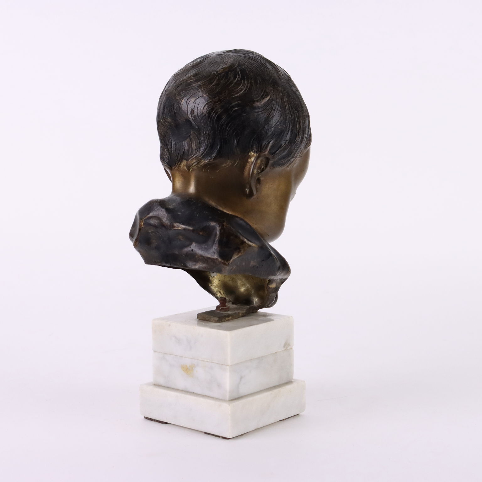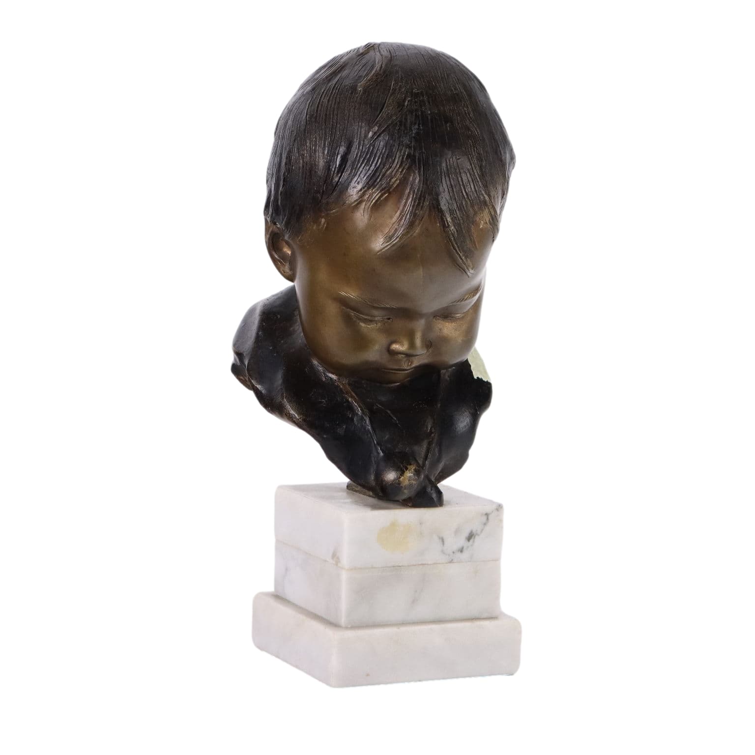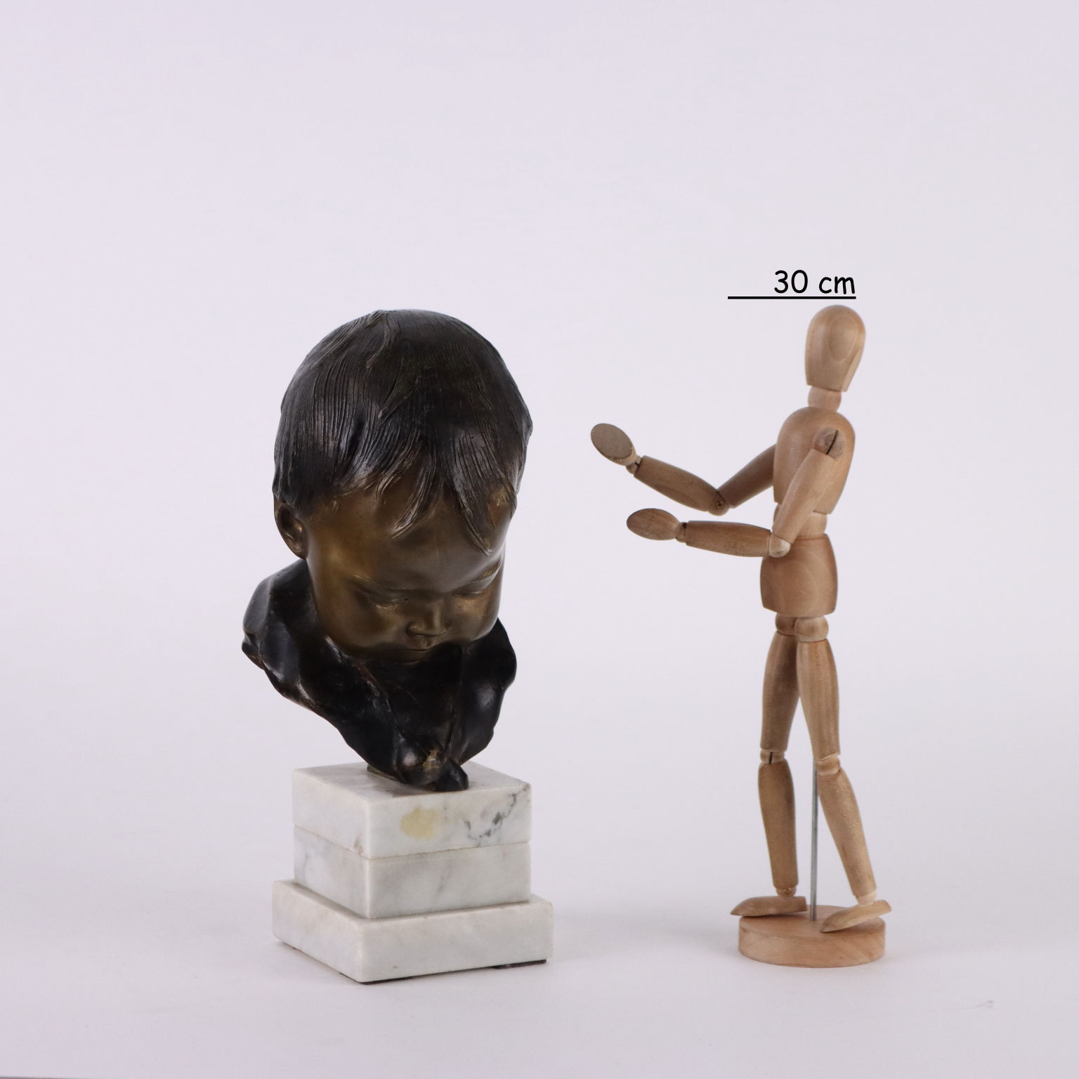 Escultura de bronce sobre base de mármol que representa la cabeza de un niño. Detrás de la firma del autor.