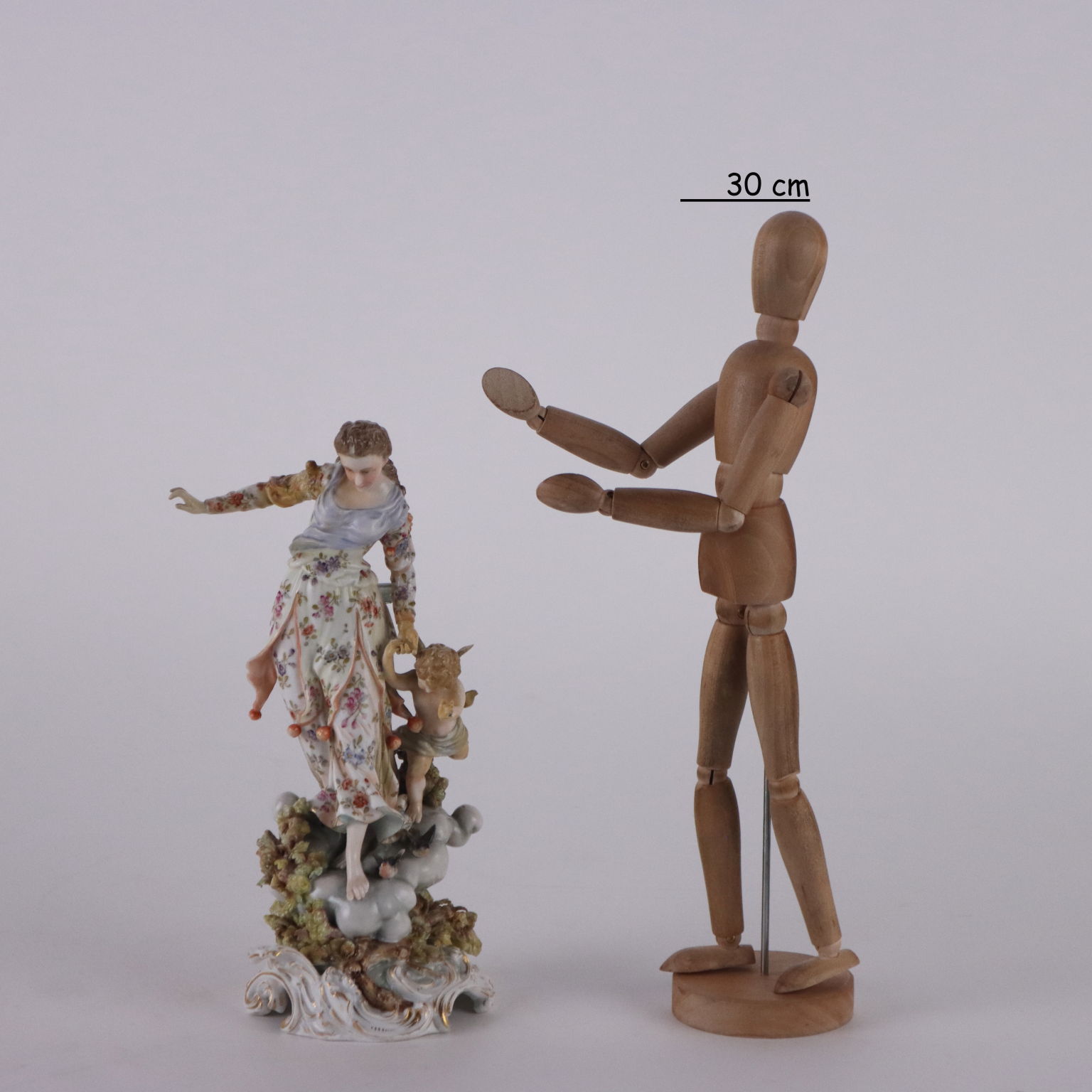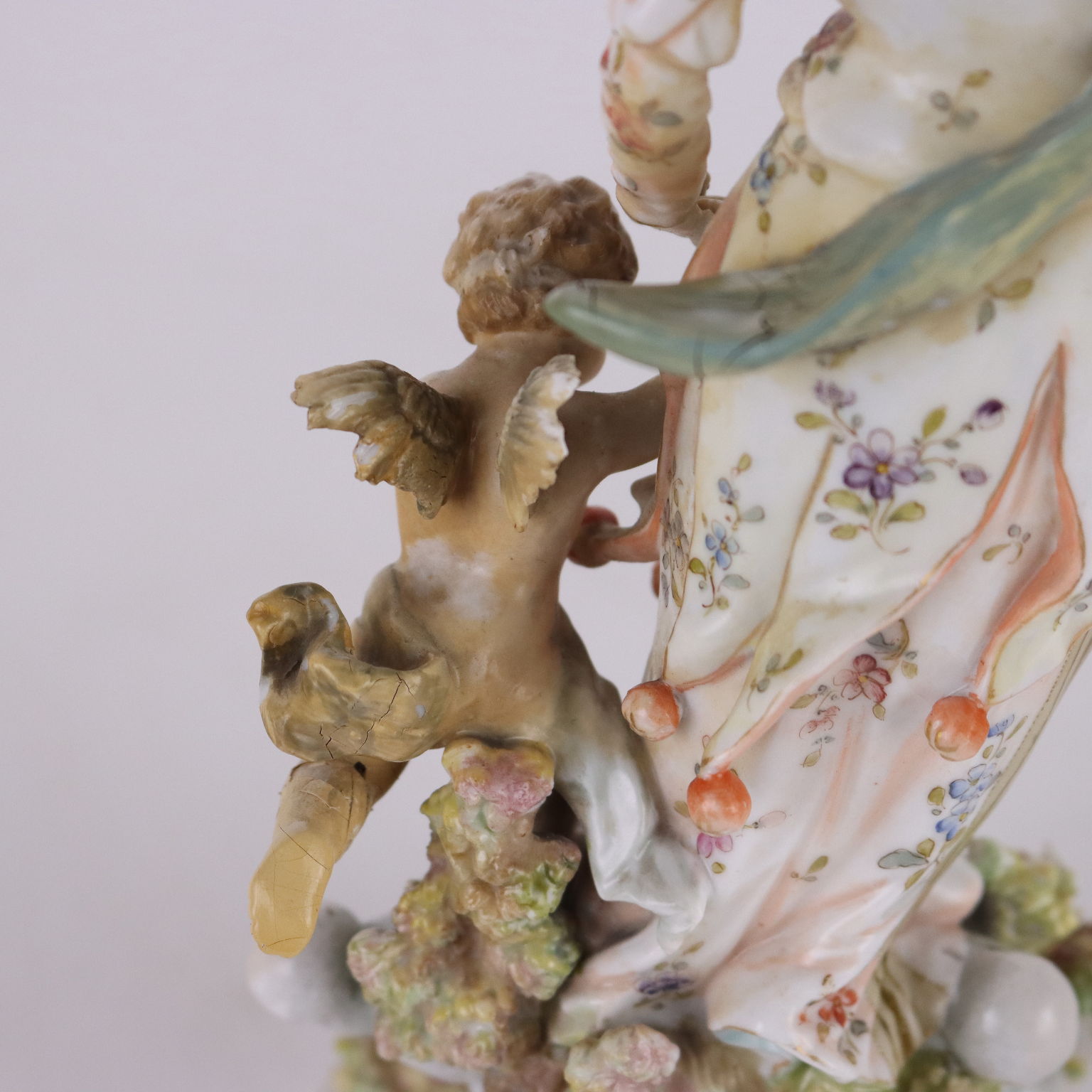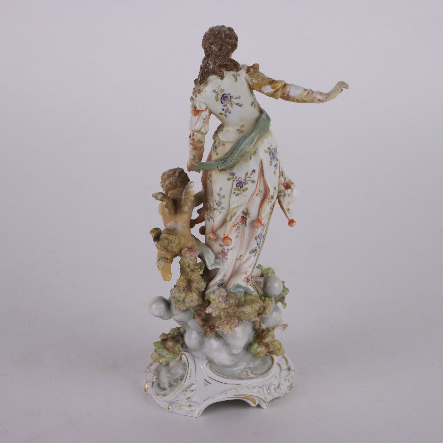 Estatua de porcelana policromada, figura alegórica de estilo neoclásico con putto. Extremadamente elegante en estilo y vestimenta. Marca de fabricación bajo la base que data de la época de Richard Eckert & Co.