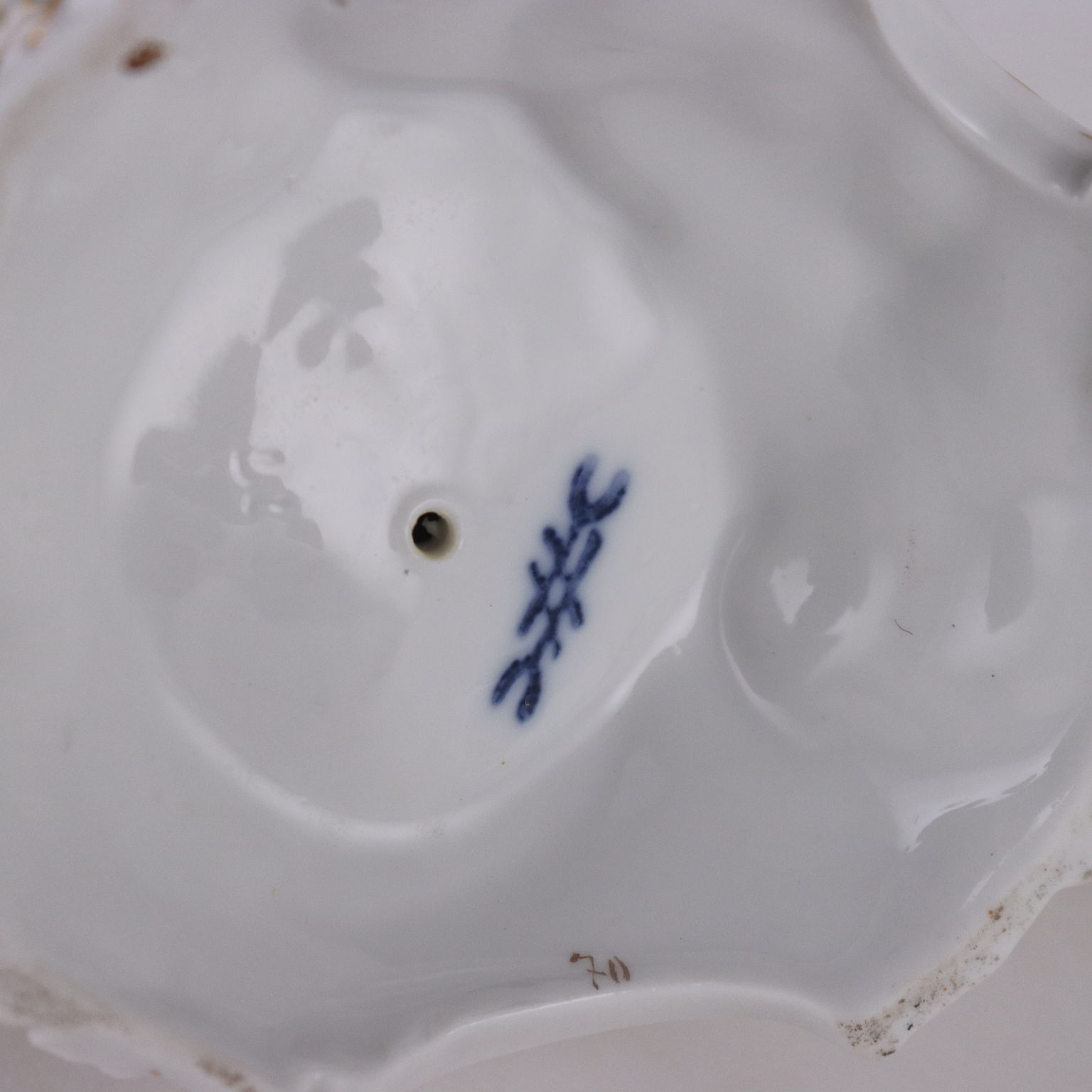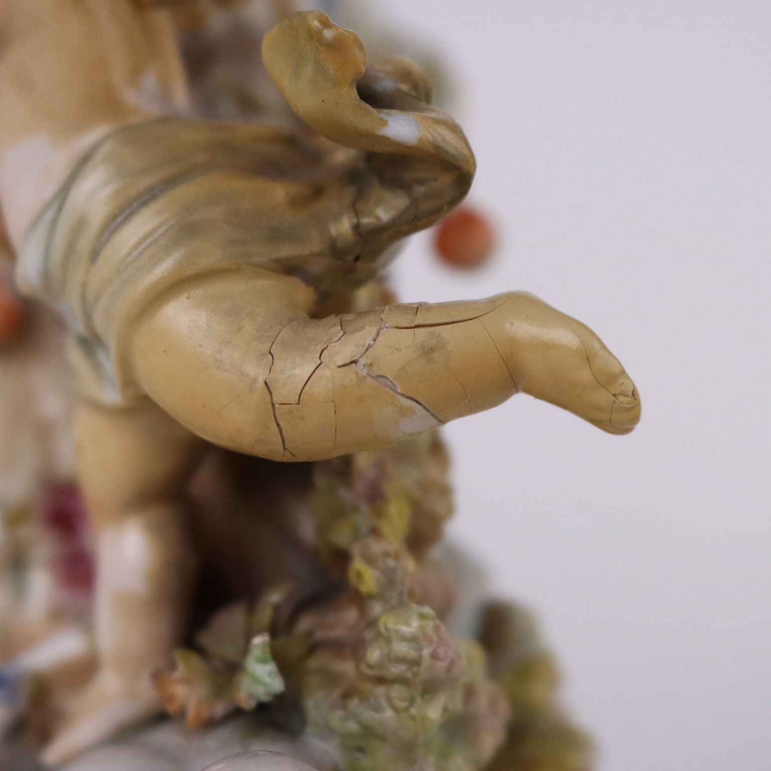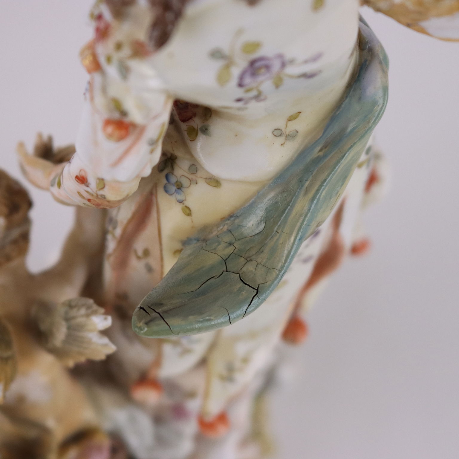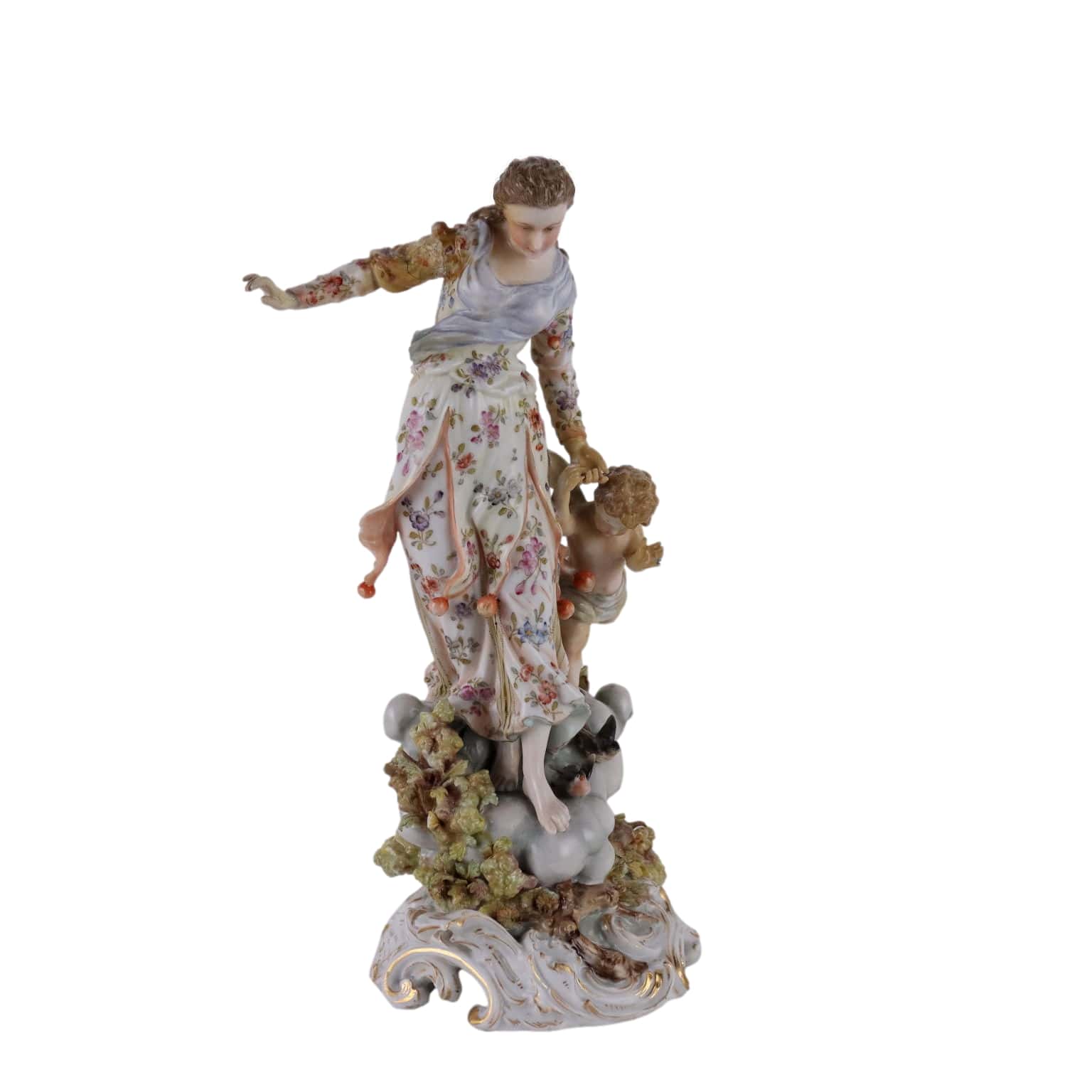 Estatua de porcelana policromada, figura alegórica de estilo neoclásico con putto. Extremadamente elegante en estilo y vestimenta. Marca de fabricación bajo la base que data de la época de Richard Eckert & Co.