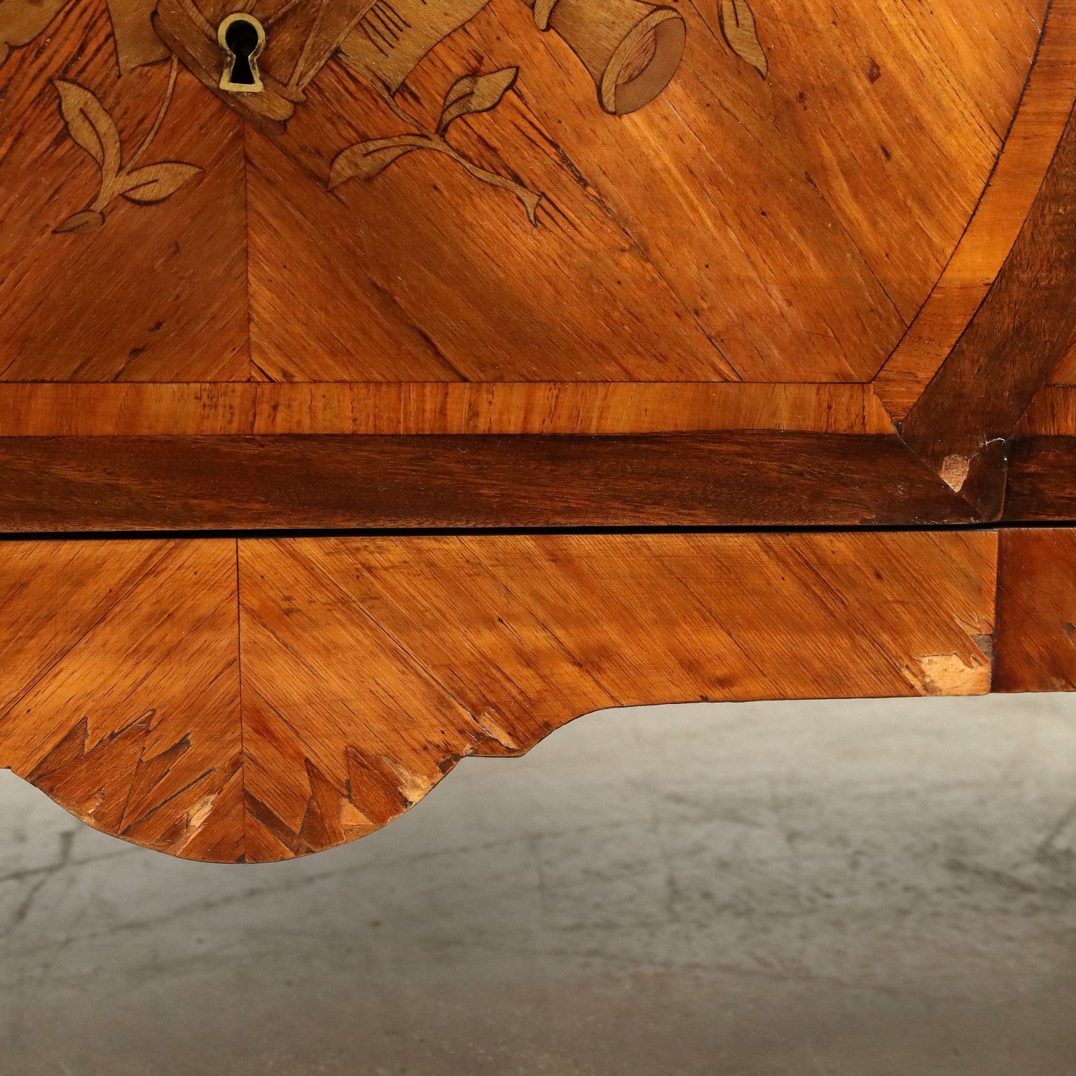 Cómoda de estilo sostenida por pies ondulados, en el frente quebrado tiene tres cajones; con incrustaciones de diversas esencias con motivo de marquetería y reserva central con panoplia de instrumentos musicales. Adornada con aplicaciones y zapatos de bronce dorado, la tapa perfilada es de mármol; interior de roble.