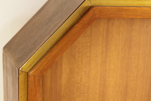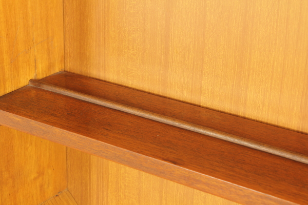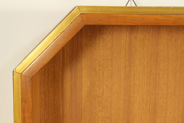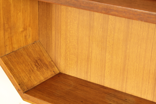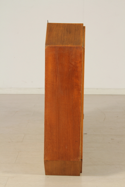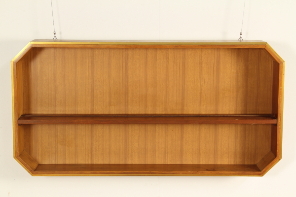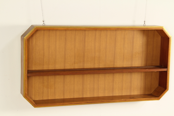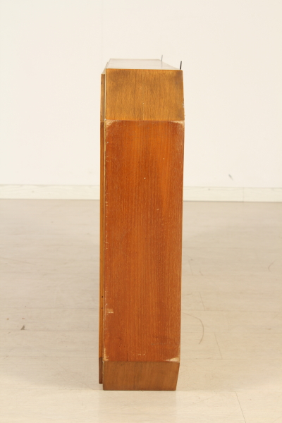 Expositor; madera rechapada madera de teca. Buen estado, muestra poco signos de desgaste.