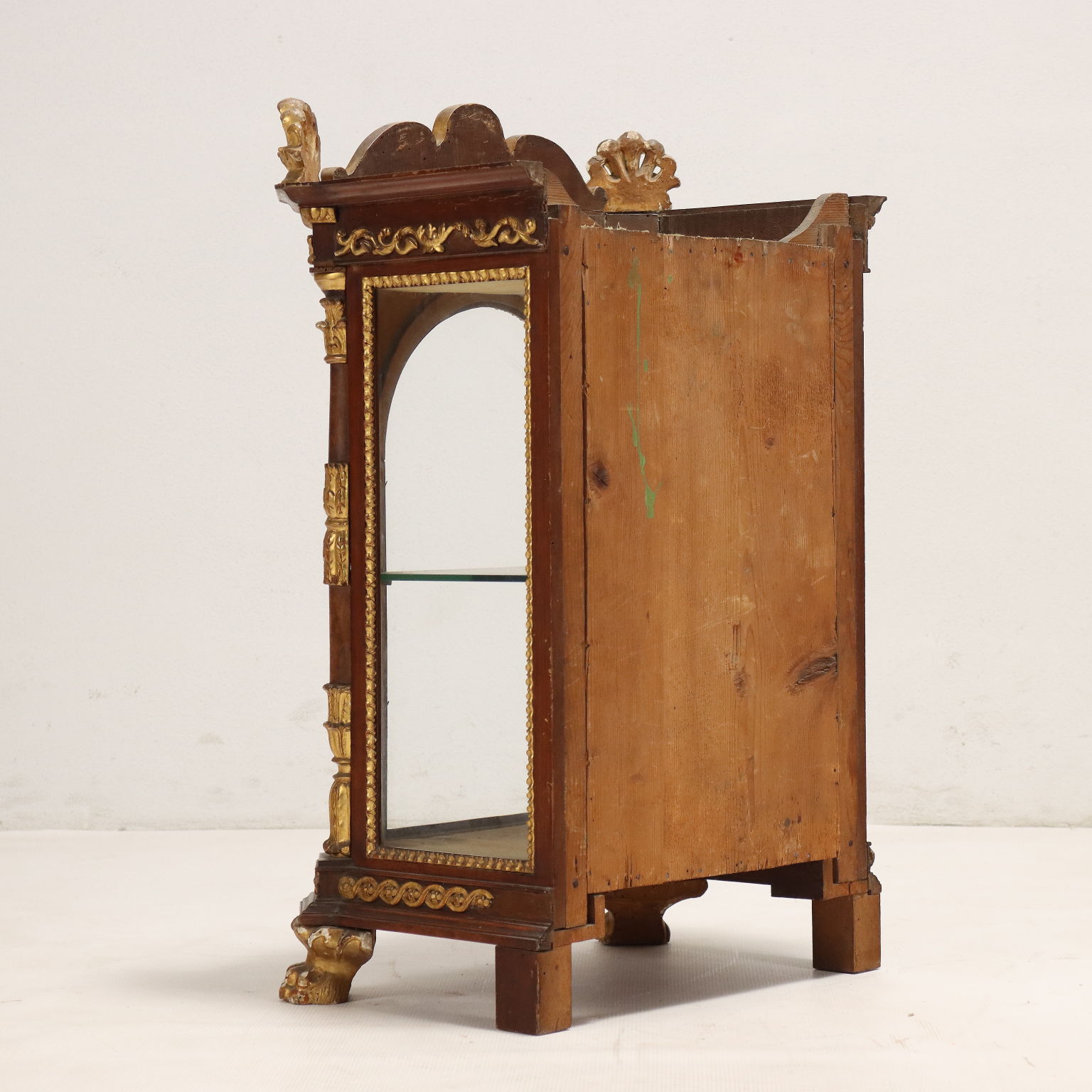 Vitrina de restauración en madera de nogal y abeto adornada con elementos tallados y dorados, patas de león, interior de terciopelo. Falta cristal de puerta. Italia, principios del siglo XIX.