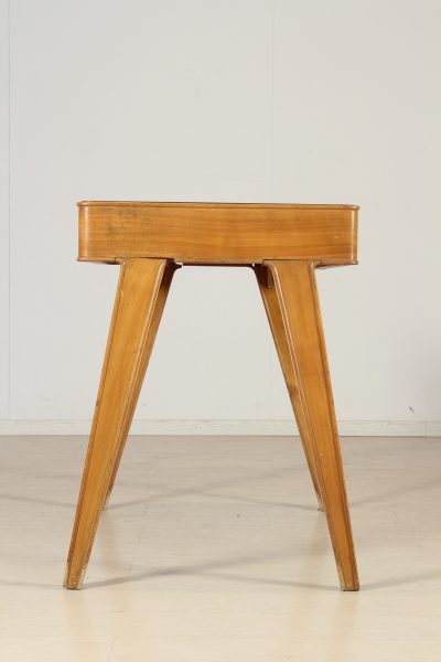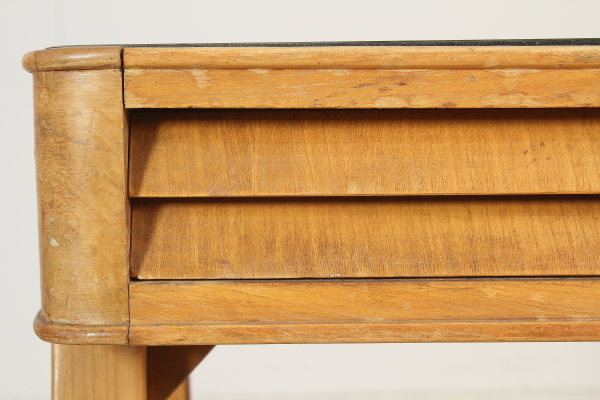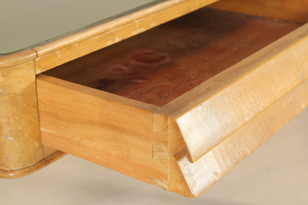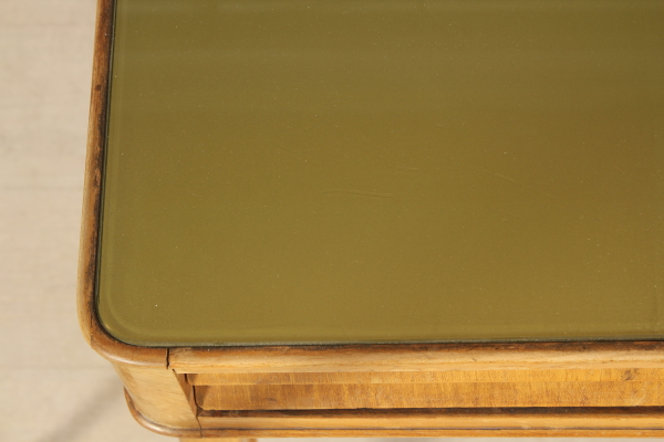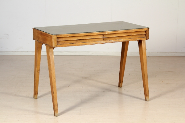 Escritorio; Vidrio madera, roble barnizado atrás. Feria de condición, tiene algunos signos de desgaste.