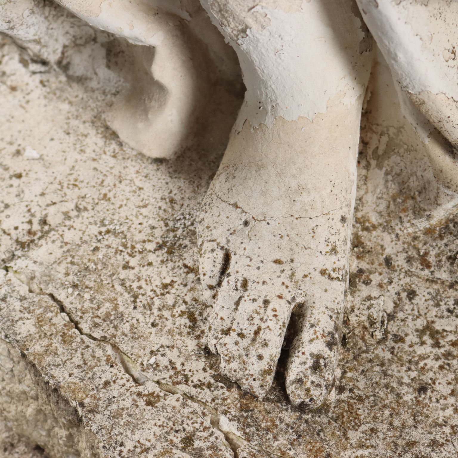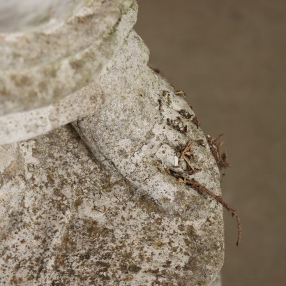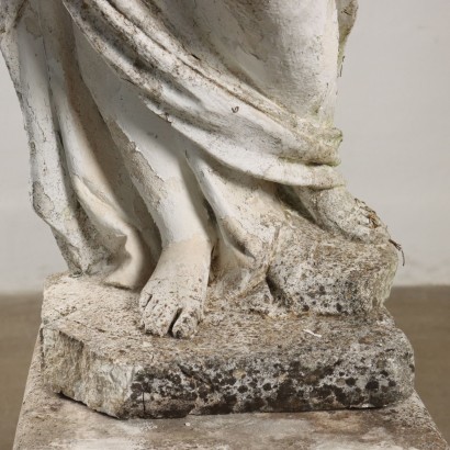 Estatua de jardín en arenilla que representa la alegoría del otoño, Italia, principios del siglo XX. La figura femenina, vestida al estilo antiguo, sostiene una cornucopia llena de hojas y frutos. Apoyado sobre un capitel decorado con volutas y elementos fitomorfos. Falta la esquina de la base de la estatua.