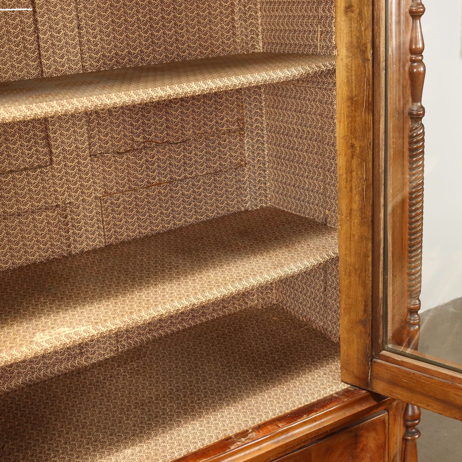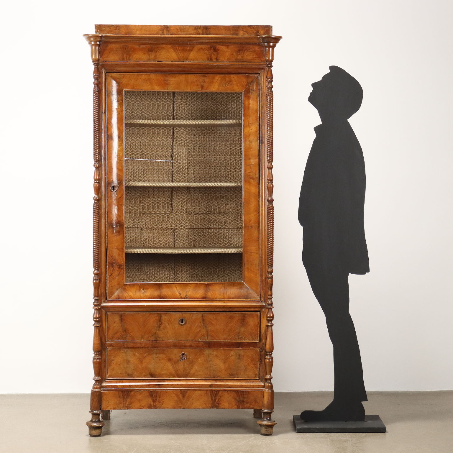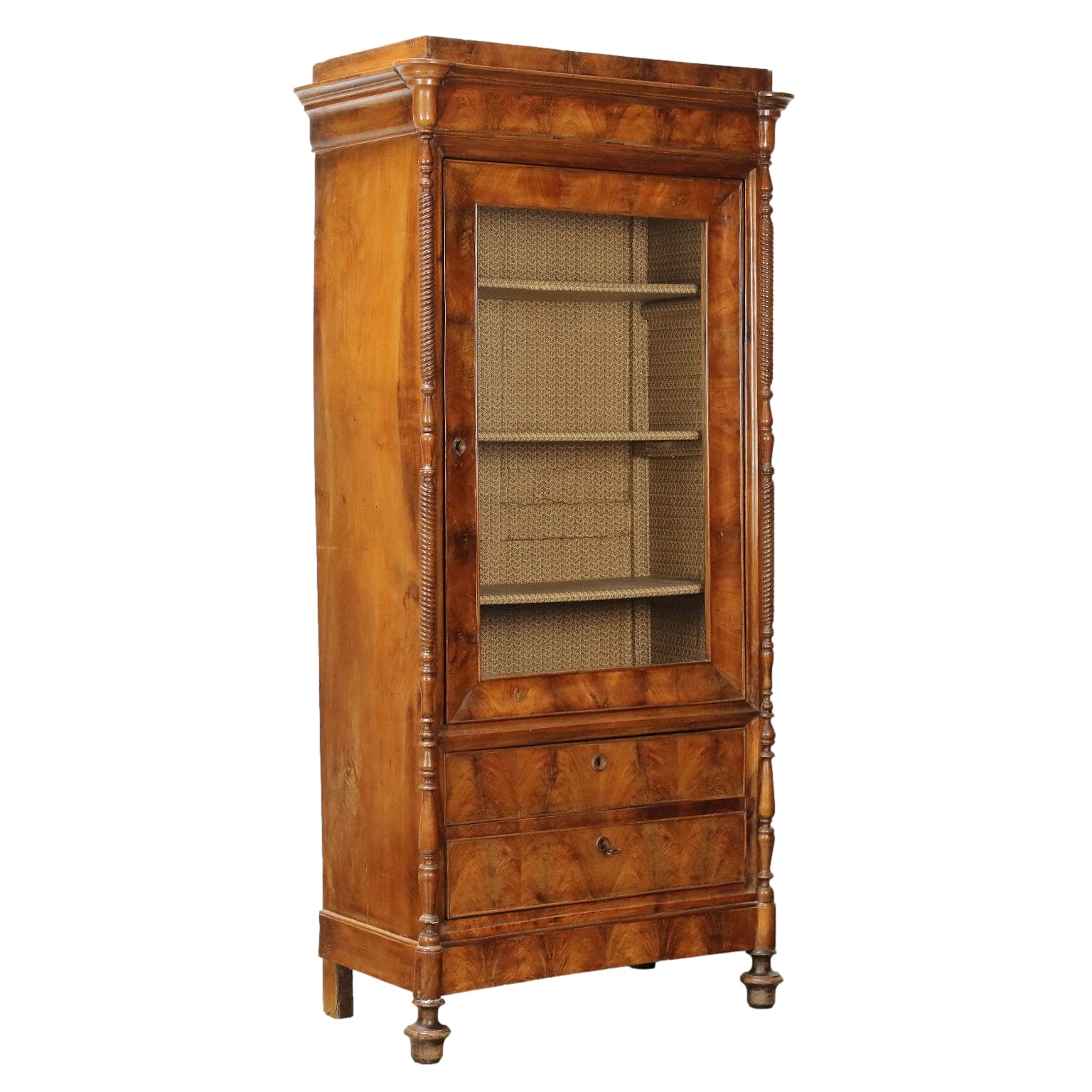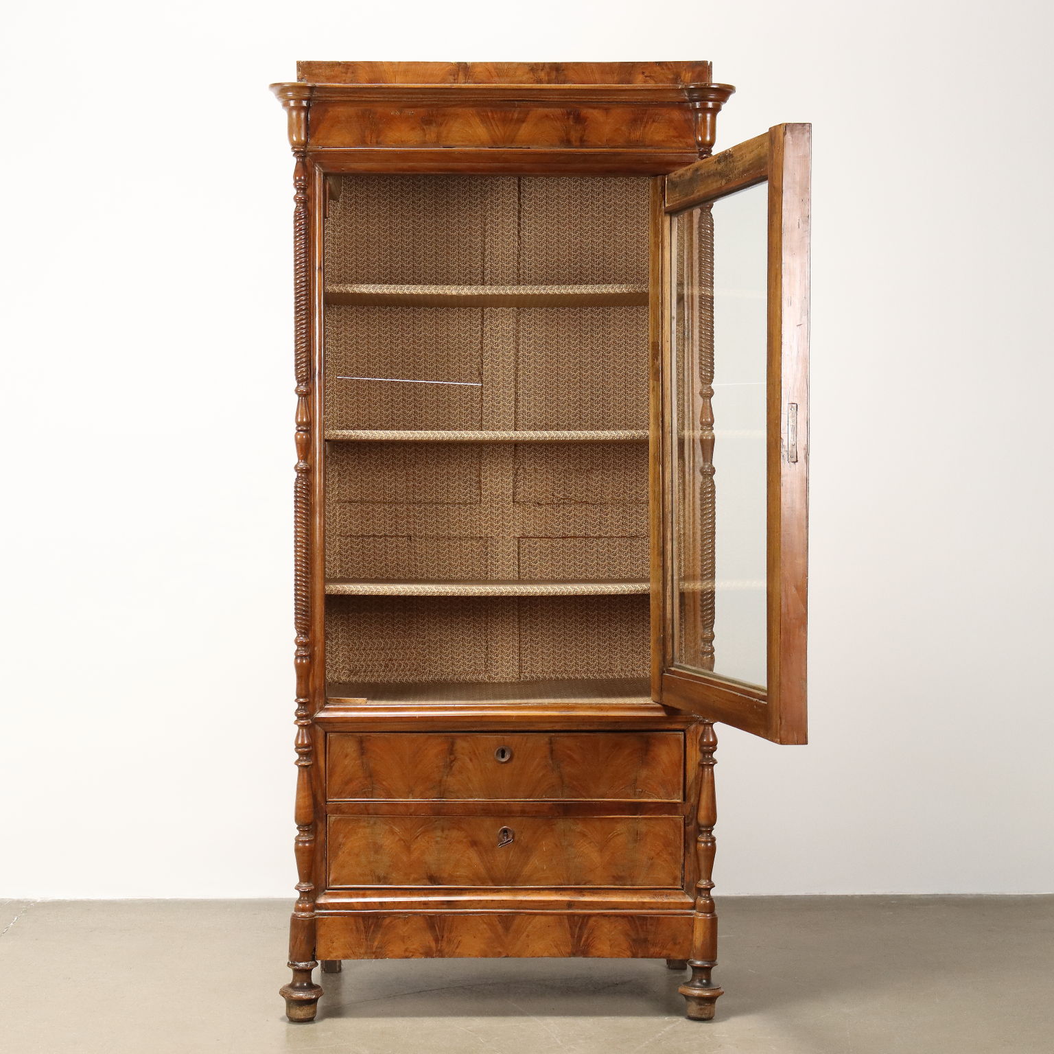 Vitrina de nogal y pedules Louis Philippe de nogal, Italia, mediados del siglo XIX. La vitrina, originalmente un armario cuya puerta ha sido modificada, está equipada con un par de cajones en la parte inferior. Los montantes, torneados y adornados con un motivo retorcido, terminan en pies de peonza que giran. Interior de álamo.