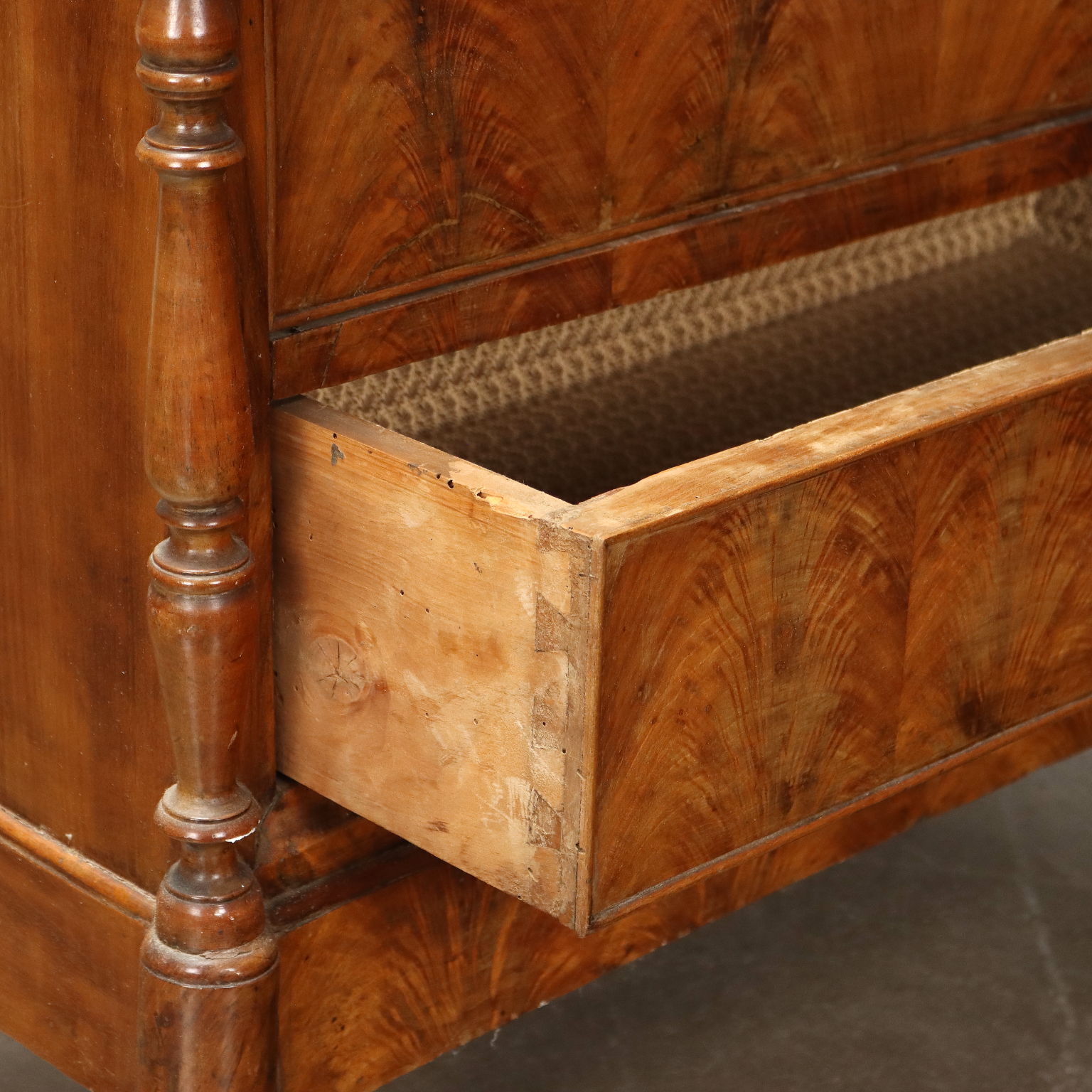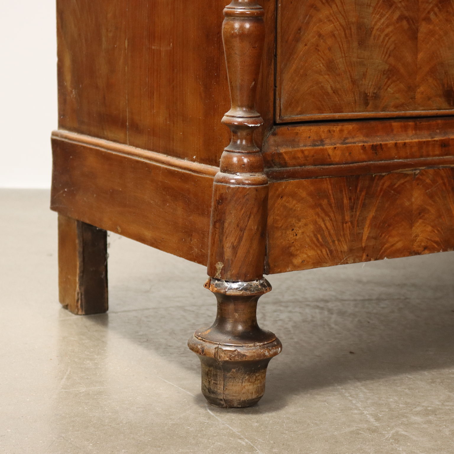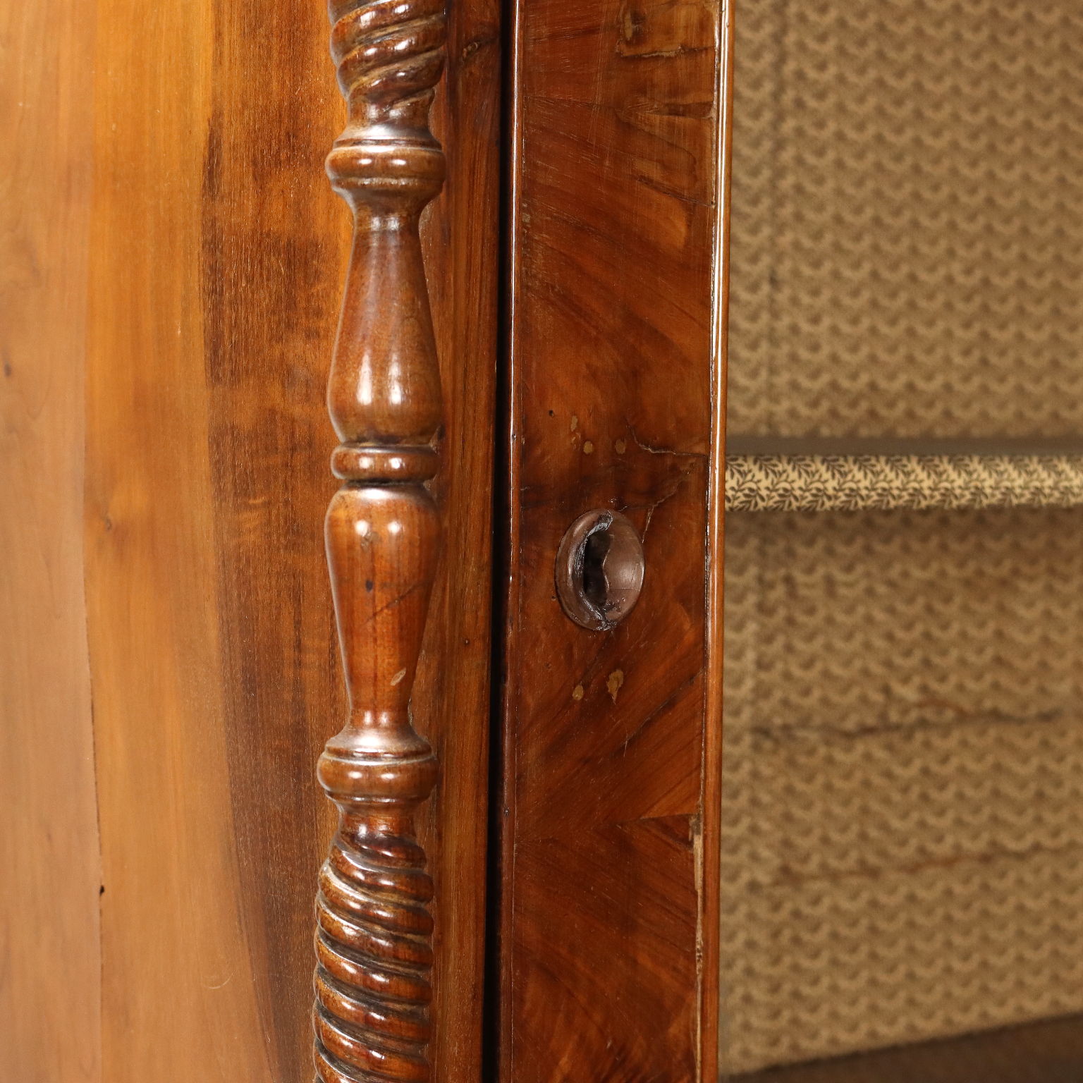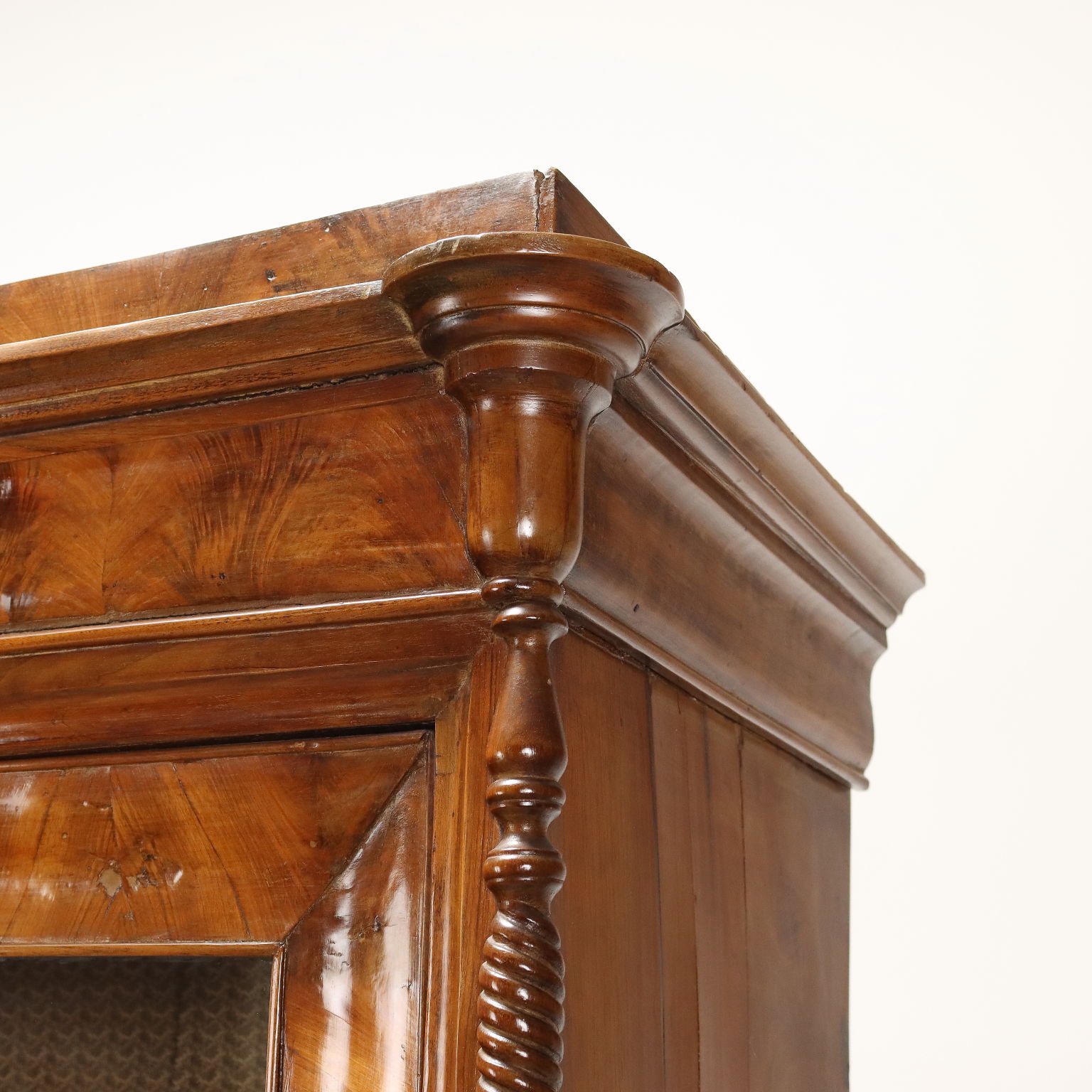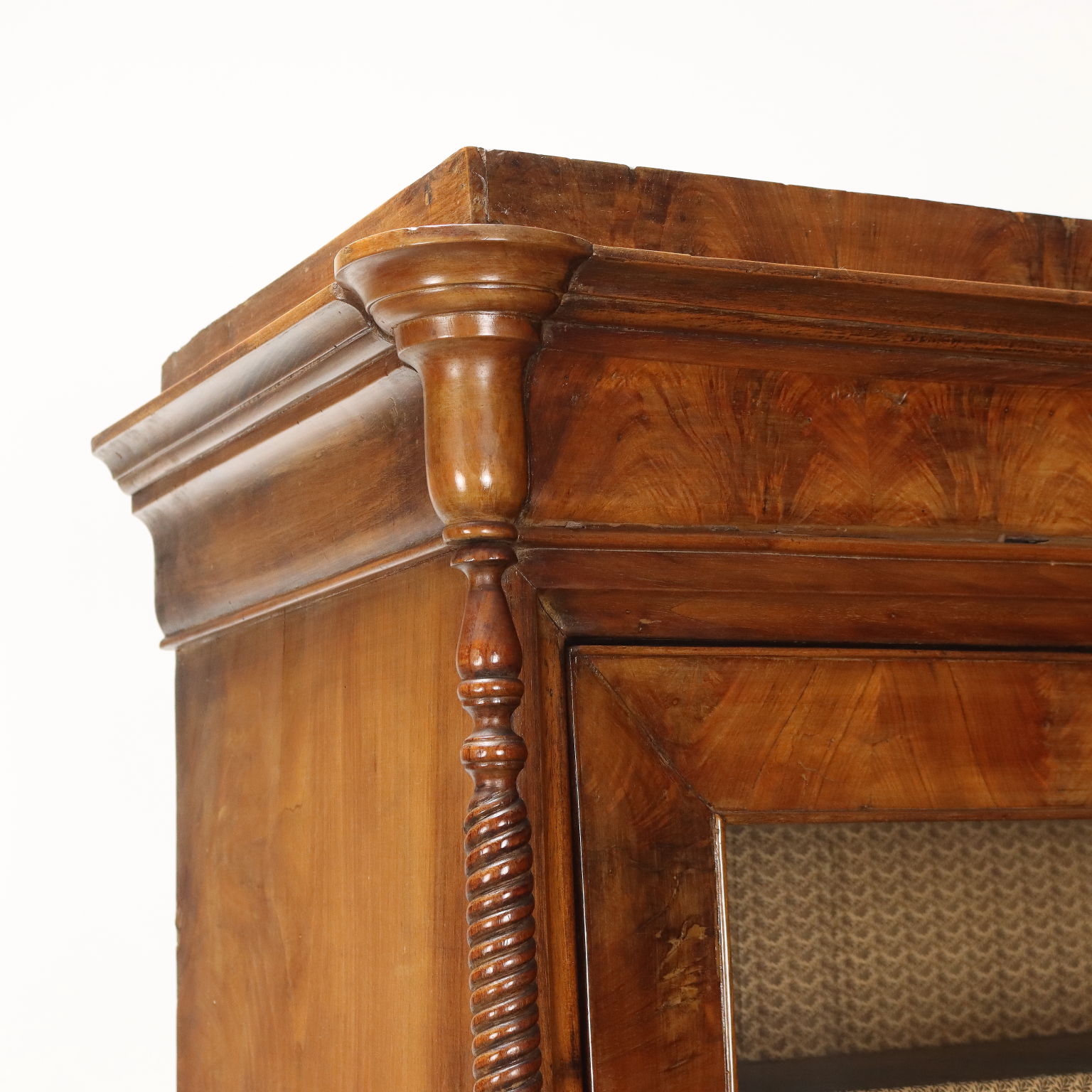 Vitrina de nogal y pedules Louis Philippe de nogal, Italia, mediados del siglo XIX. La vitrina, originalmente un armario cuya puerta ha sido modificada, está equipada con un par de cajones en la parte inferior. Los montantes, torneados y adornados con un motivo retorcido, terminan en pies de peonza que giran. Interior de álamo.