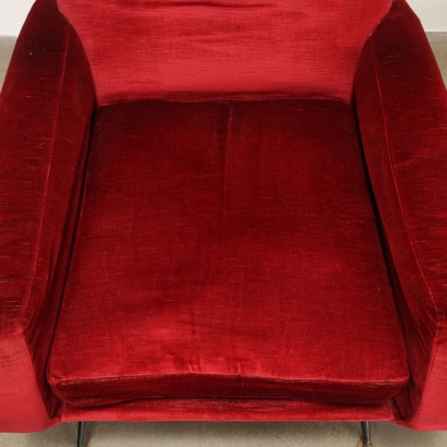 Par de sillones; acolchado de espuma, revestimiento de terciopelo (original de la época), patas de metal esmaltado, con terminal de latón.