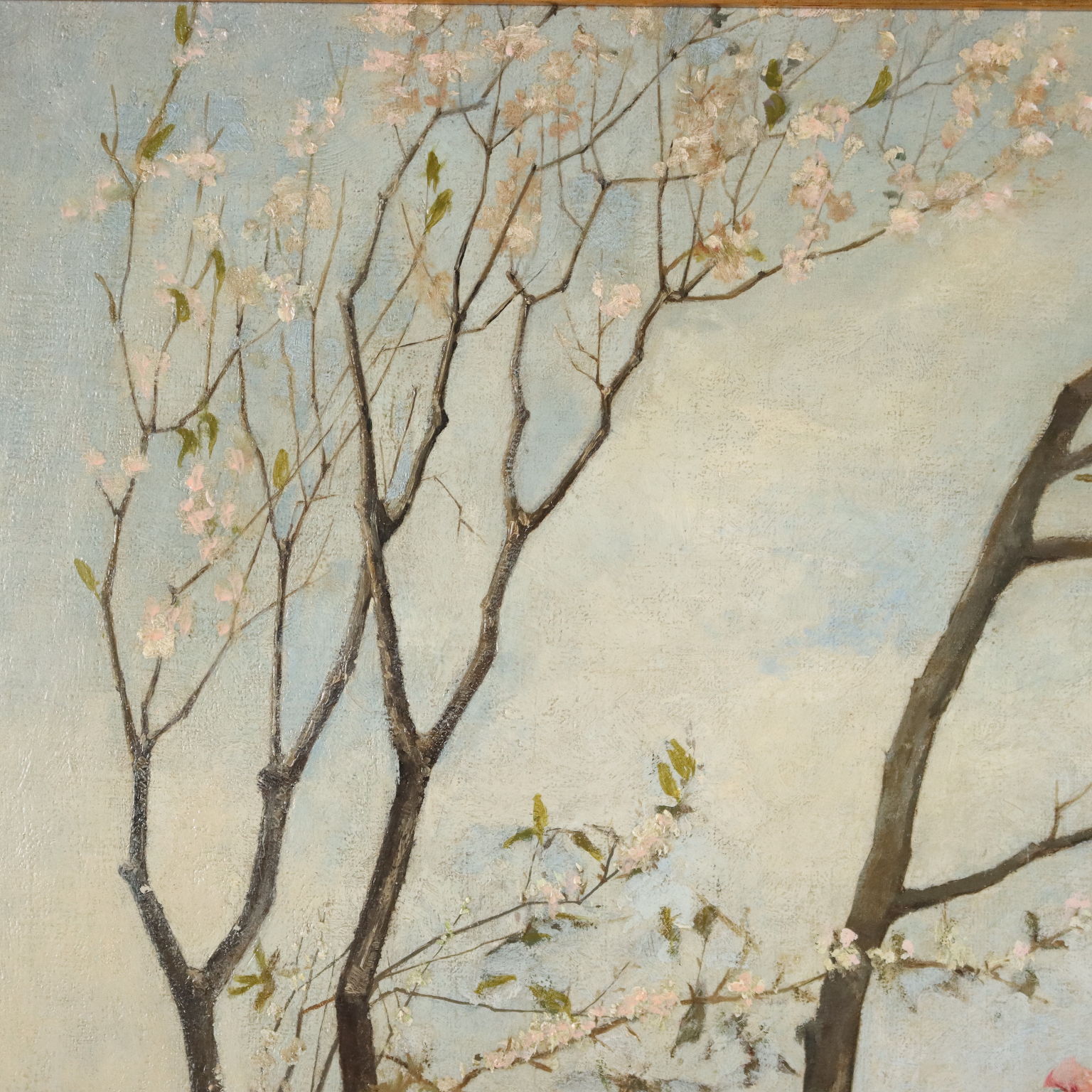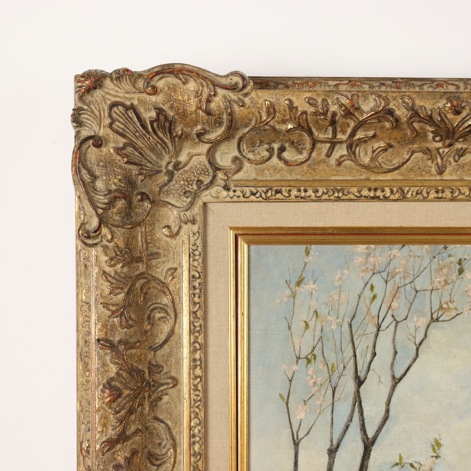 Óleo sobre lienzo. Firmado y fechado abajo a la derecha, con inscripción adicional "Baden"(¿ubicación?). La escena muestra a una joven pareja vestida con ropas populares del siglo XVIII, sentada en un banco bajo un árbol en flor, junto a un camino rural: el chico hace que la chica intente tocar la flauta dulce, una bonita estrategia de cortejo. No existen indicaciones biográficas del artista, de origen germánico por el nombre y lugar indicado. La pintura se presenta en un marco de época.
