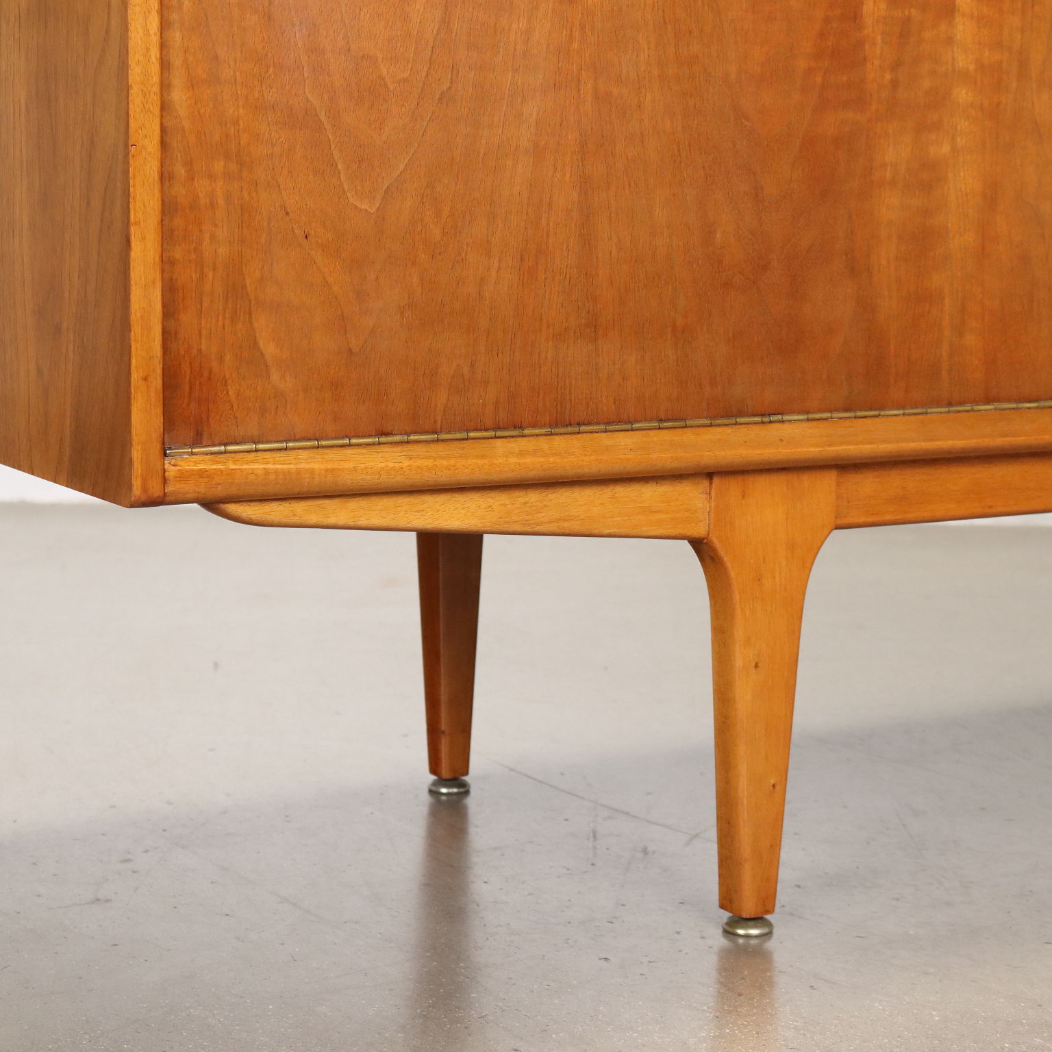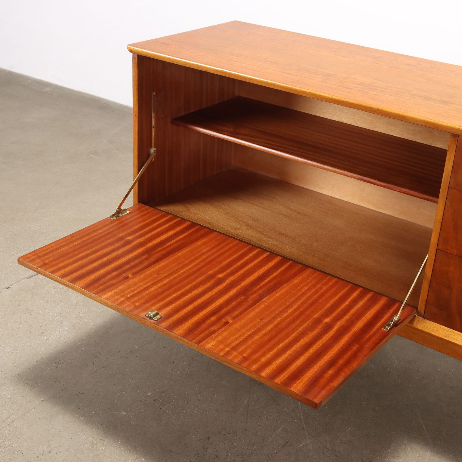 Descripción Aparador con solapa, apertura abatible y cajones visibles. Madera chapada en teca. Completamente restaurado.