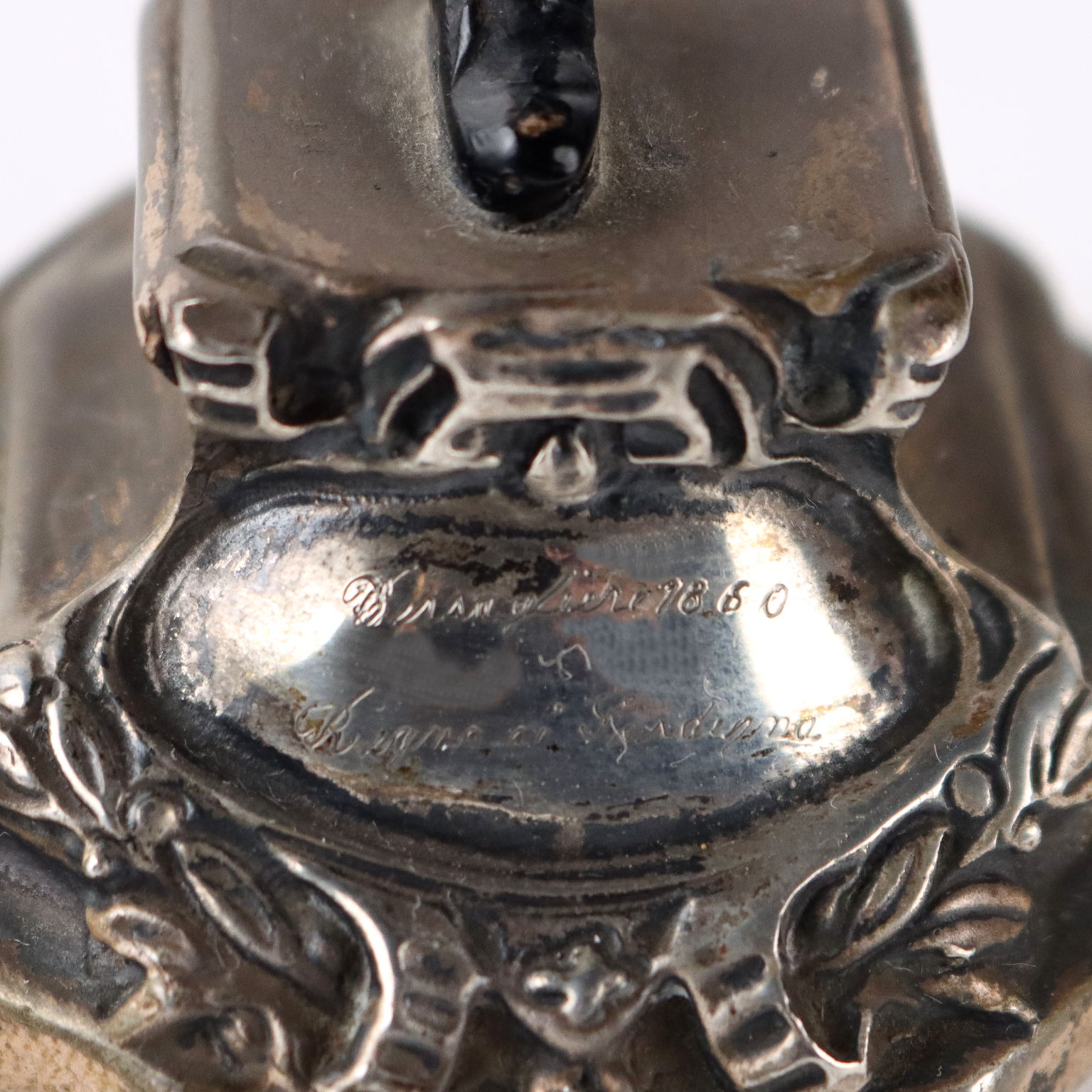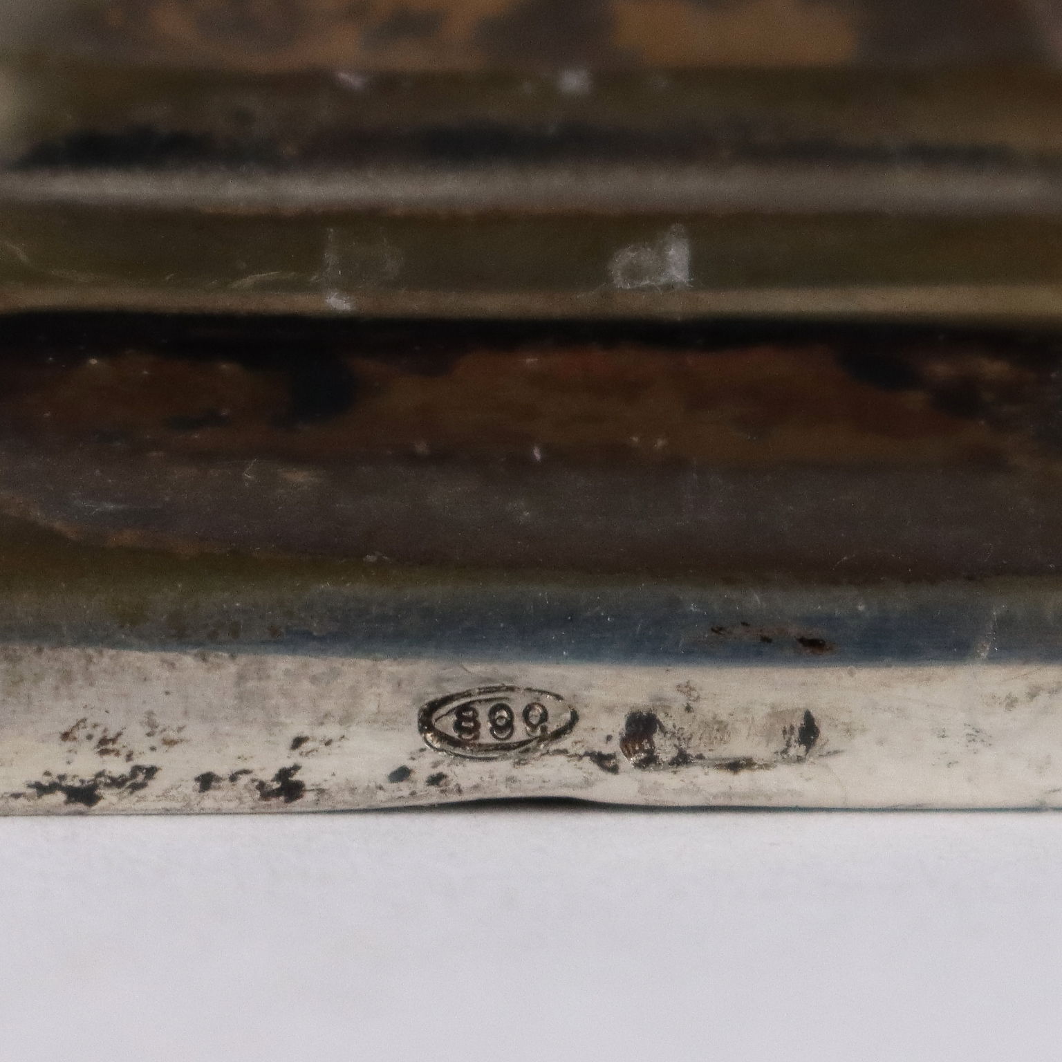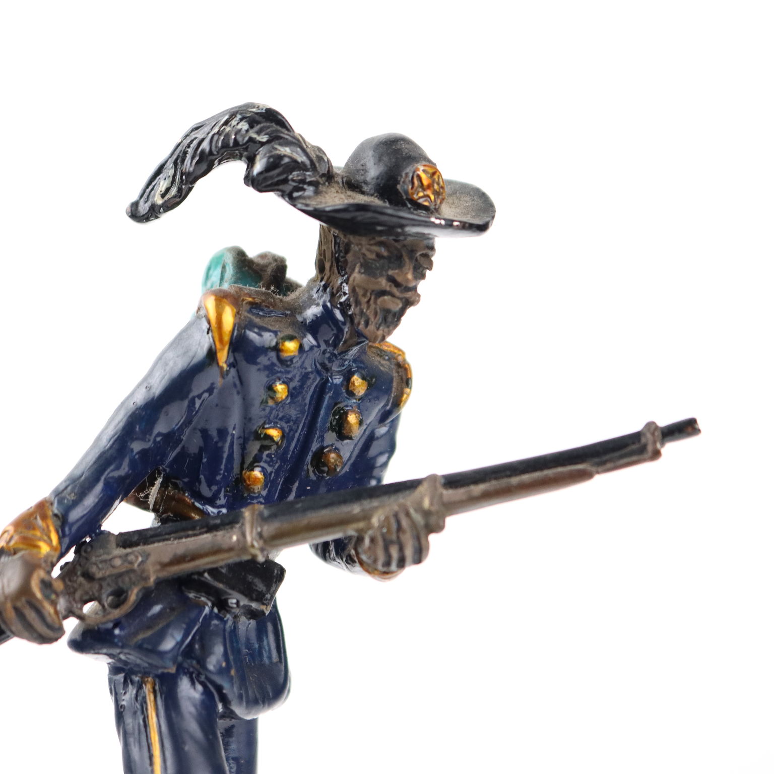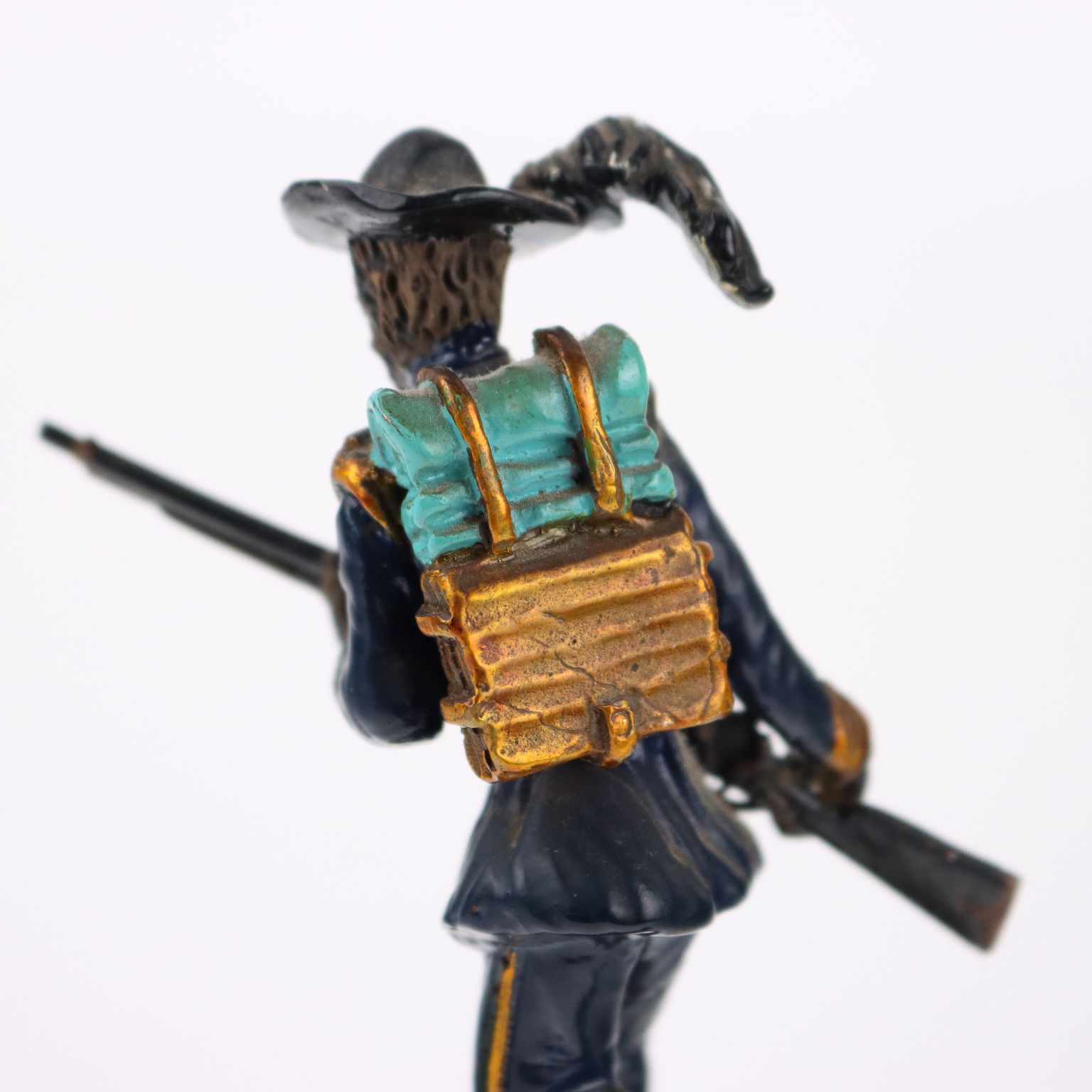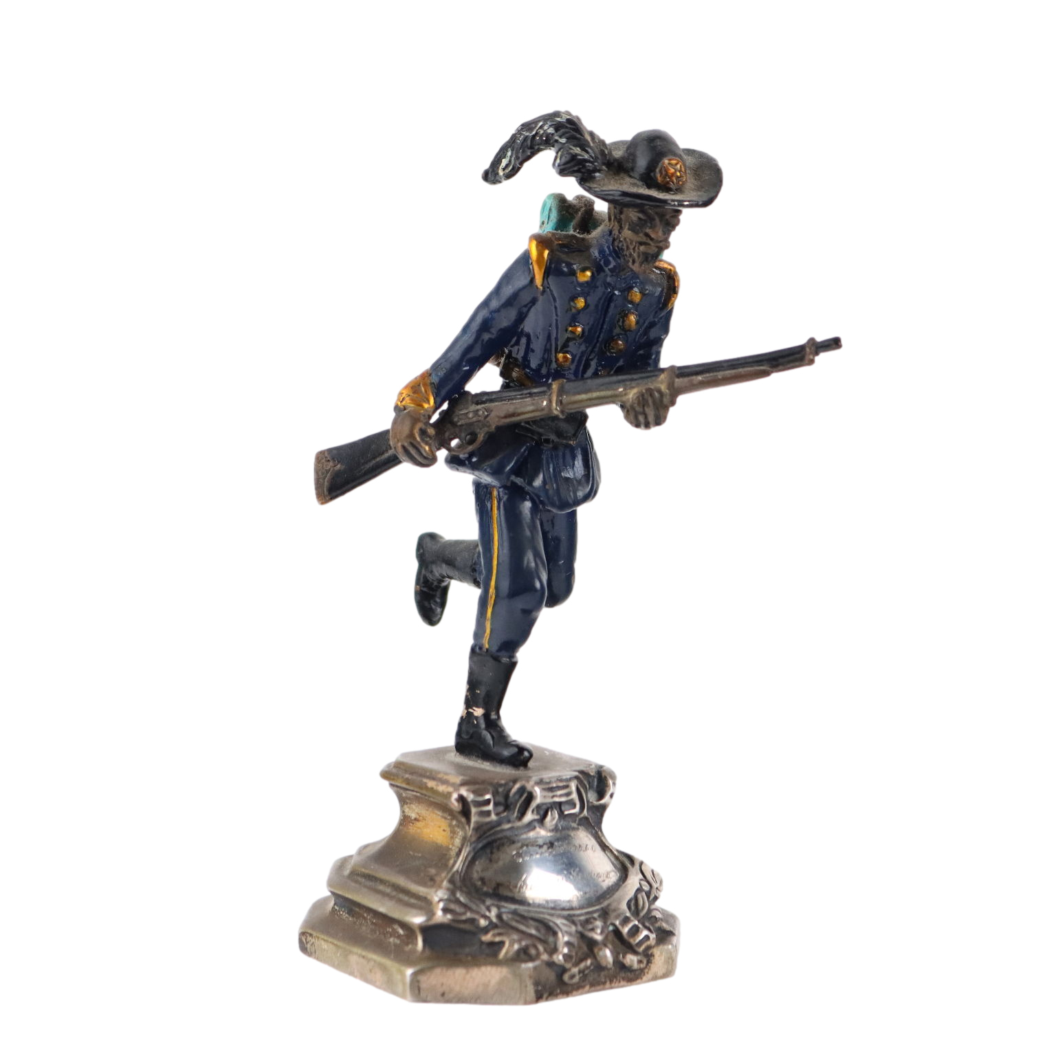 Bersagliere de plata esmaltada sobre base cincelada. En el frente grabado con la inscripción "Bersagliere 1860 Reino de Cerdeña". Marcas plateadas grabadas en la parte posterior de la base. Marca de platero apenas legible. Aproximadamente 310 gramos.