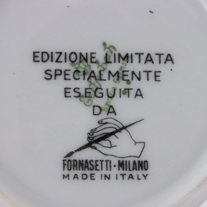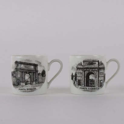 Seis tazas de café y platillos de porcelana, serigrafiados con las seis puertas de Milán. Bajo las bases la marca de fabricación.