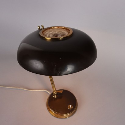 Lámpara de sobremesa con pie regulable en inclinación y casquillo regulable con articulaciones, de latón y aluminio esmaltado.