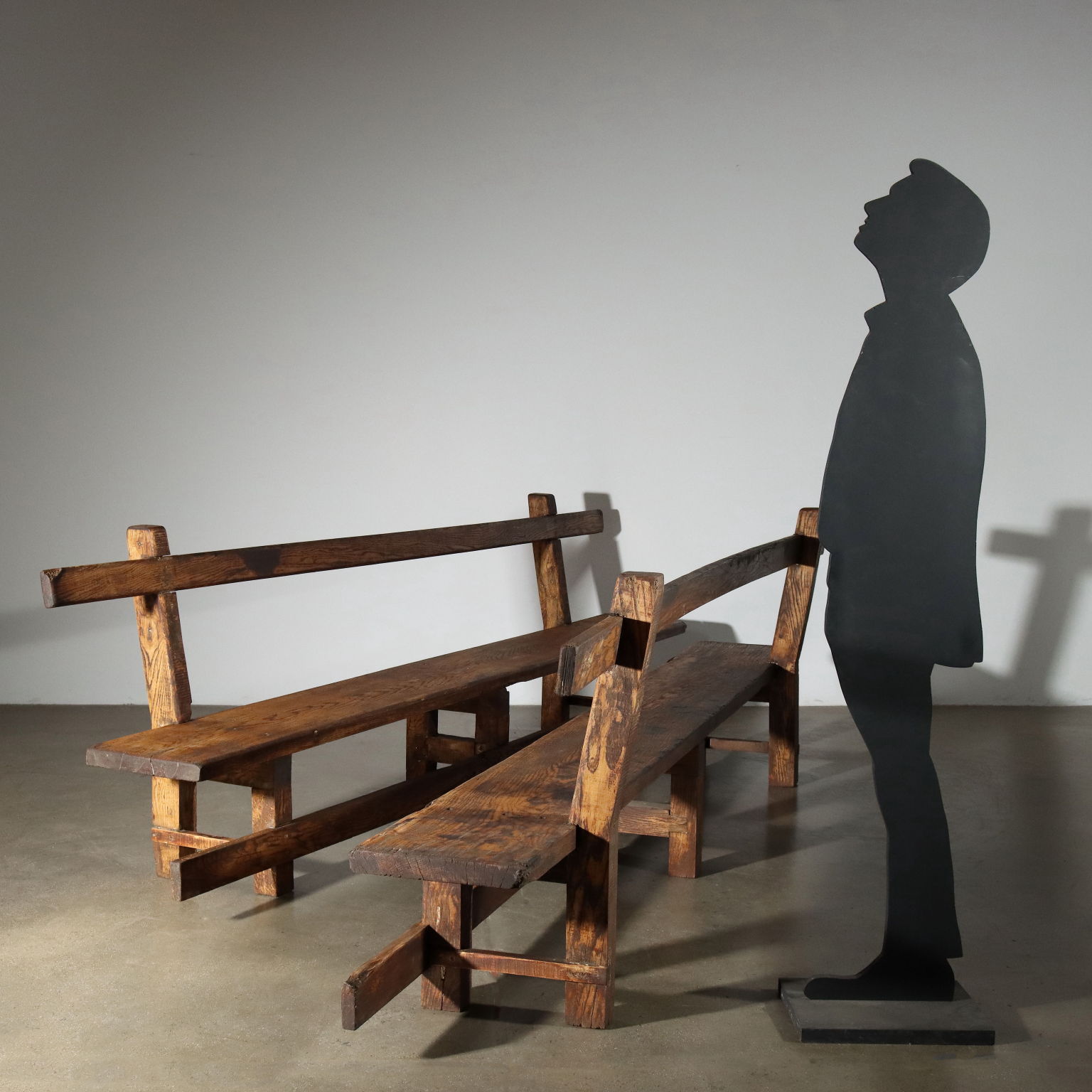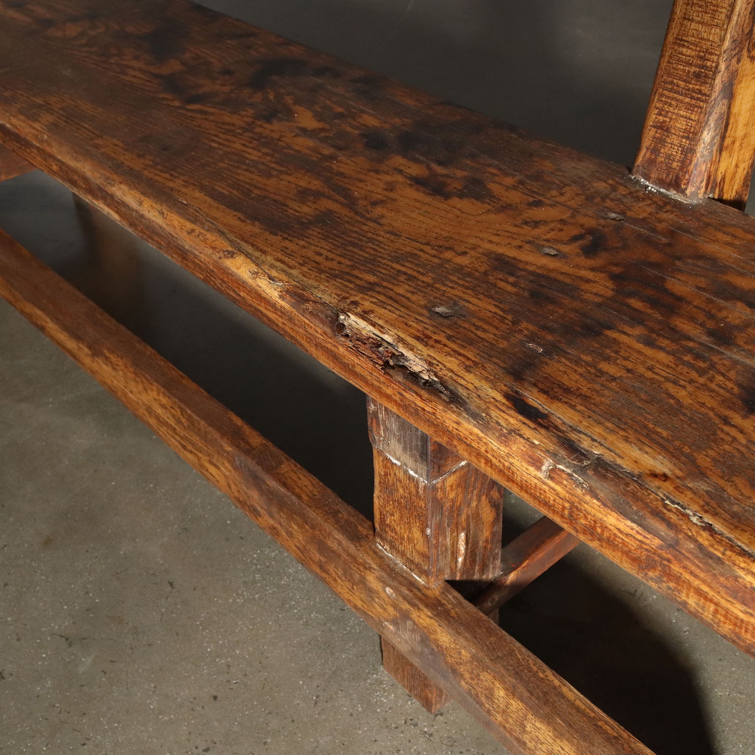 Pareja de bancos fabricados en madera de castaño de las primeras décadas del siglo XX, estructura de caballete sujeta con clavos de madera. Los bancos fueron restaurados con una opción conservadora, dejando rastros negros del tanino que emergieron en puntos donde probablemente se derramó líquido y rematados con pinturas naturales.