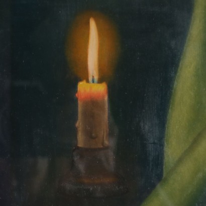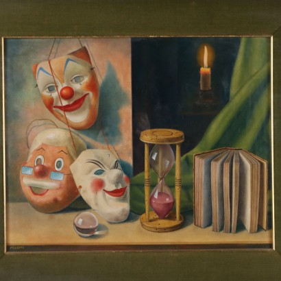 Óleo sobre madera prensada. Firmado abajo a la izquierda. Etiqueta del artista con título en el reverso. Animada composición con tres máscaras, dos que hacen referencia a la commedia dell'arte mientras que la tercera parece más bien una máscara de carnaval (¿Maestro Geppetto?), junto a un reloj de arena, una vela y un libro. La producción de Olmedo Mezzoli tiene como objetivo volver a proponer las figuras del mundo clásico en clave moderna. Trabajar en marco.