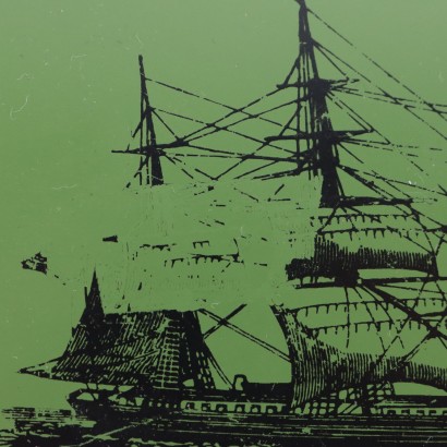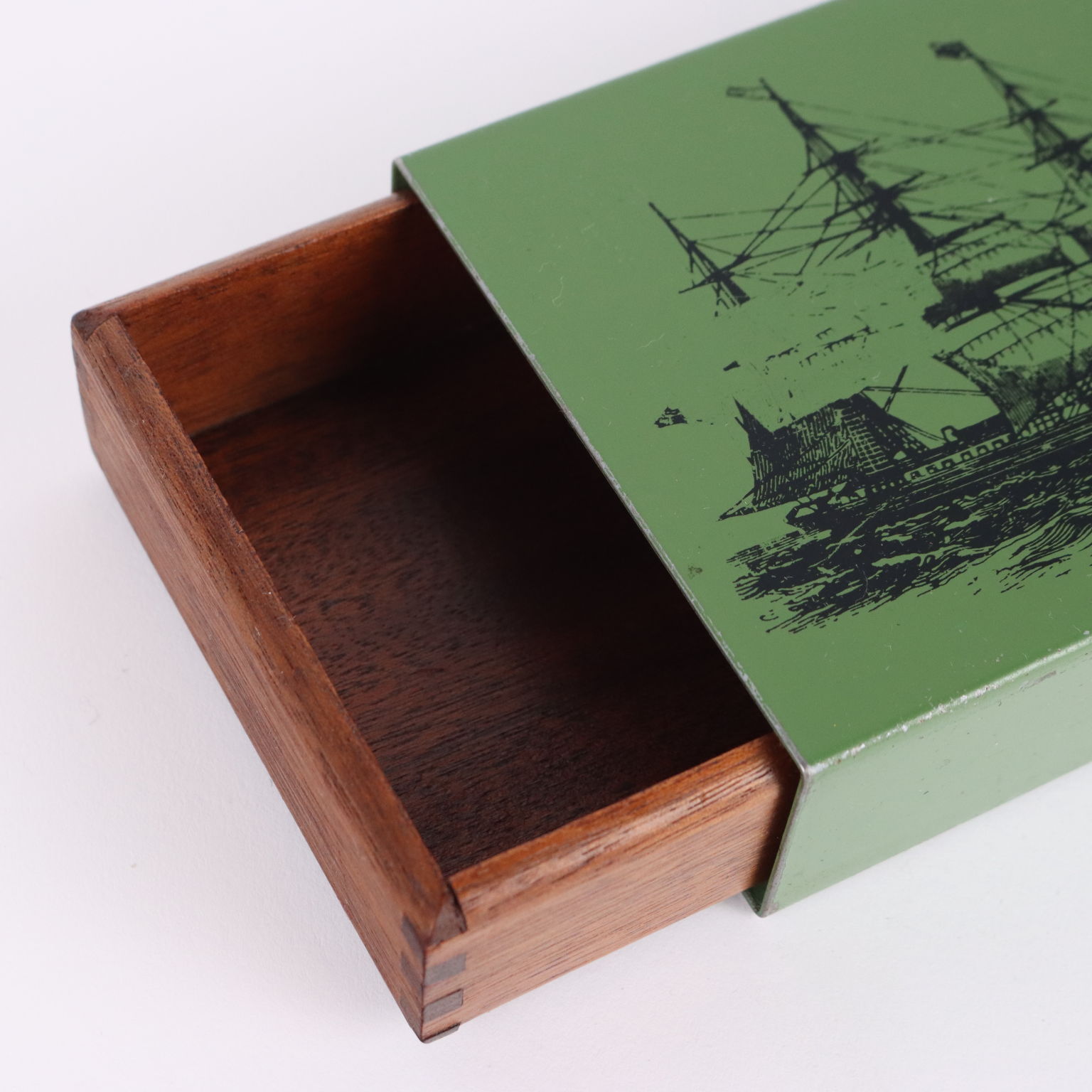 Caja de madera y metal esmaltado en verde. Decoración serigrafiada con velero.