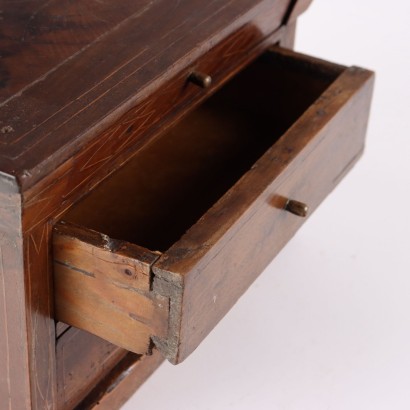 Cómoda modelo barroco en madera de nogal. Tres cajones, uno de los cuales está debajo de la tapa. Forro interior en terciopelo y pasamanería.