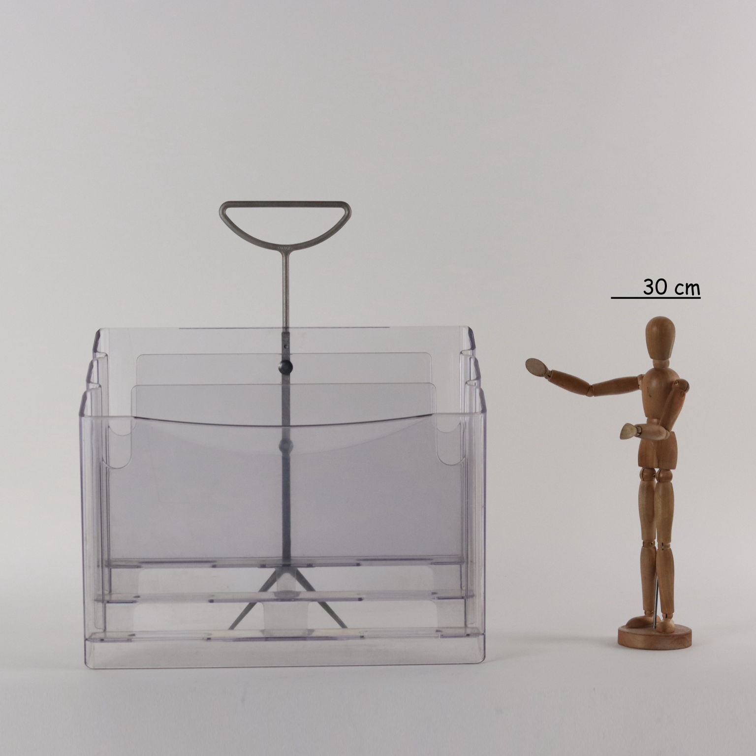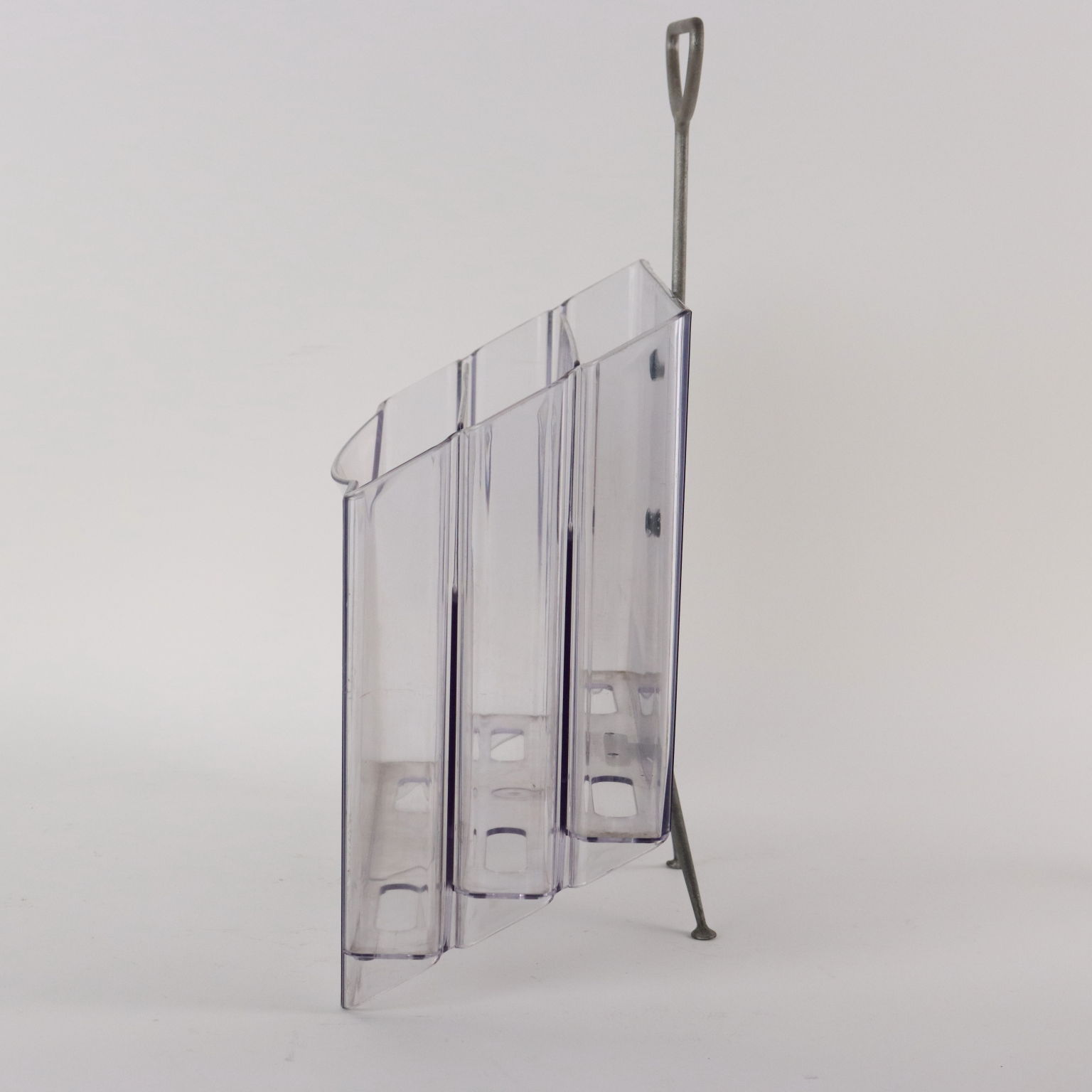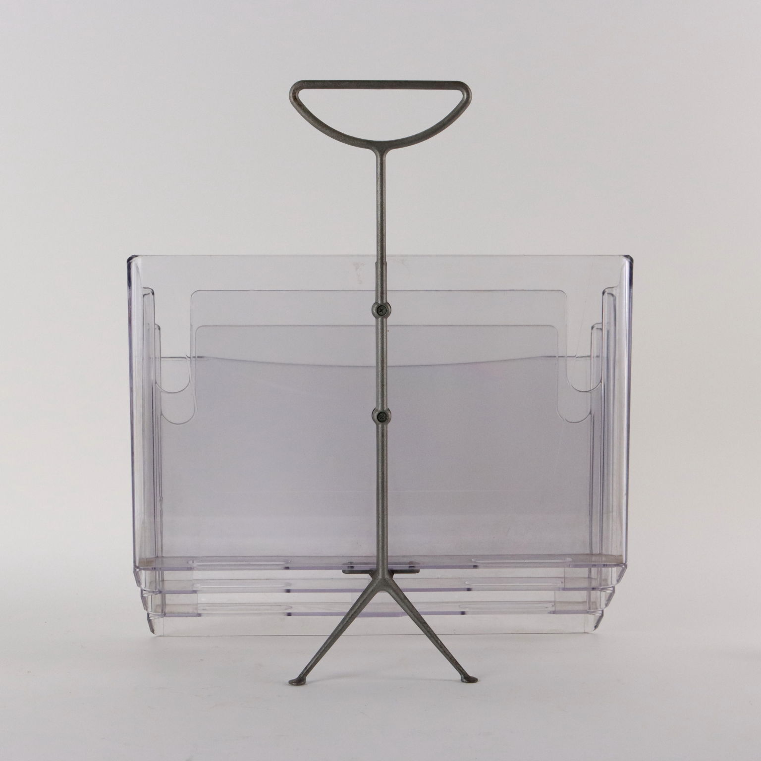 Revistero postmoderno en material plástico transparente con asa metálica.