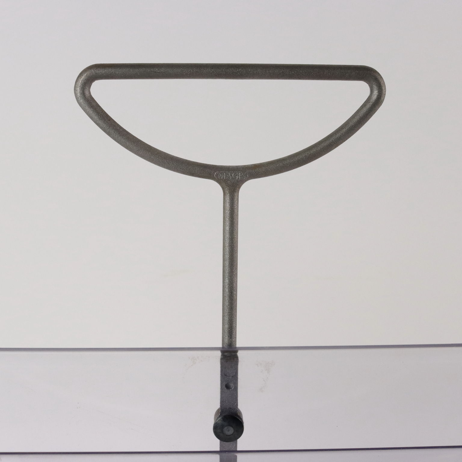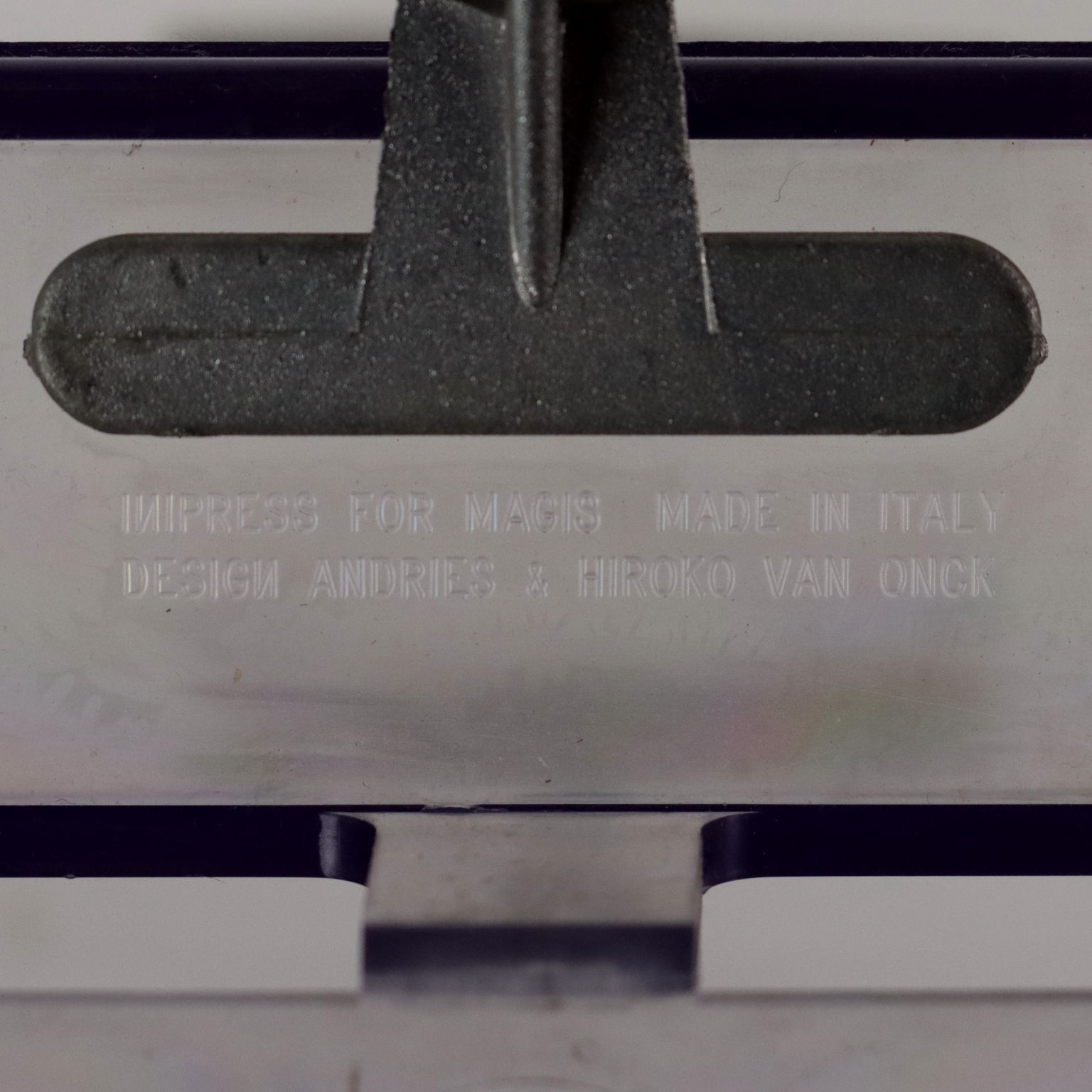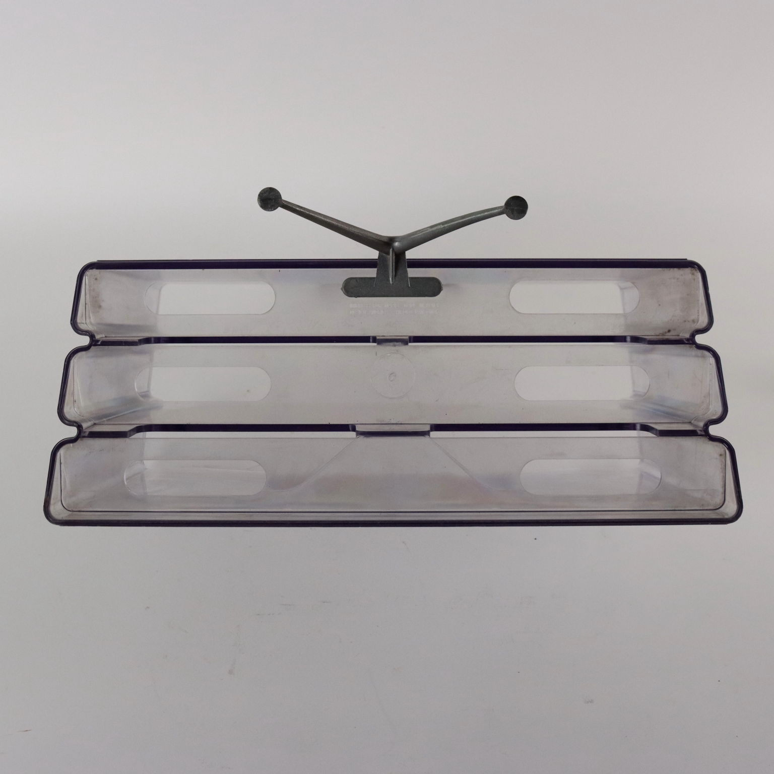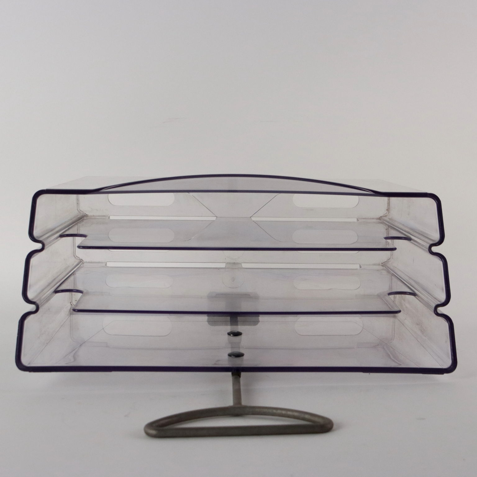 Revistero postmoderno en material plástico transparente con asa metálica.