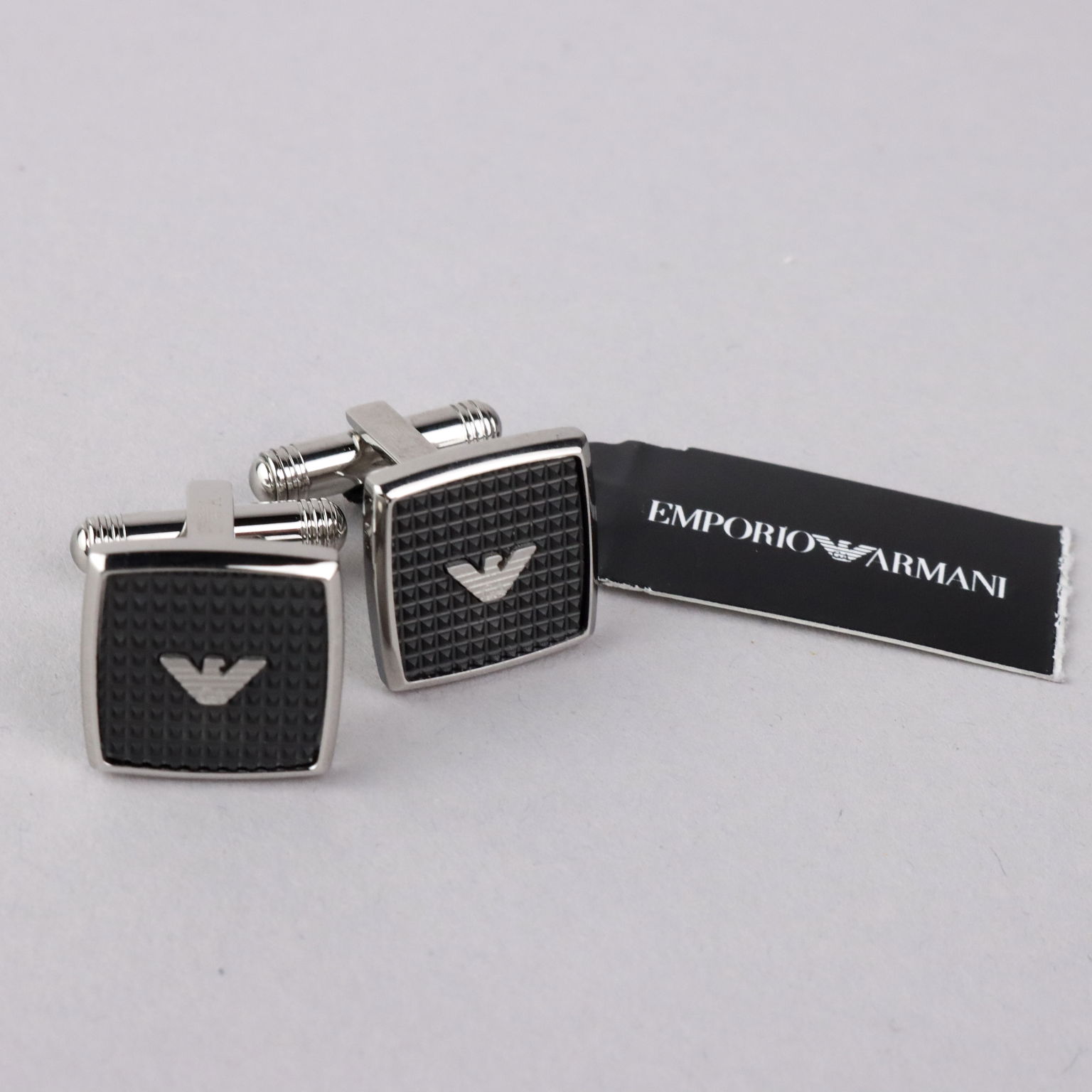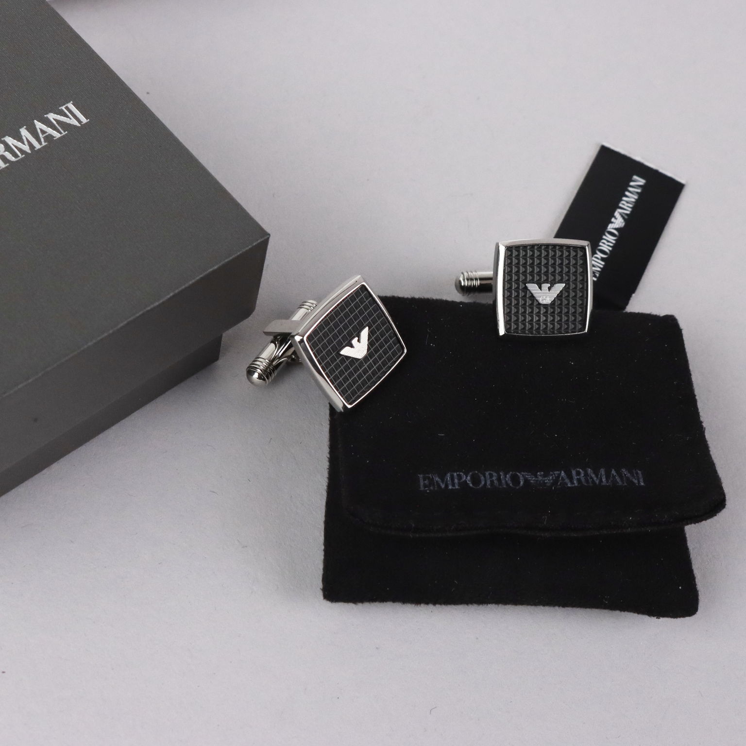 Gemelos de acero inoxidable, con fondo gris antracita y logotipo de la línea Emporio Armani. El artículo está en excelentes condiciones, nunca ha sido usado y conserva su etiqueta y embalaje originales.