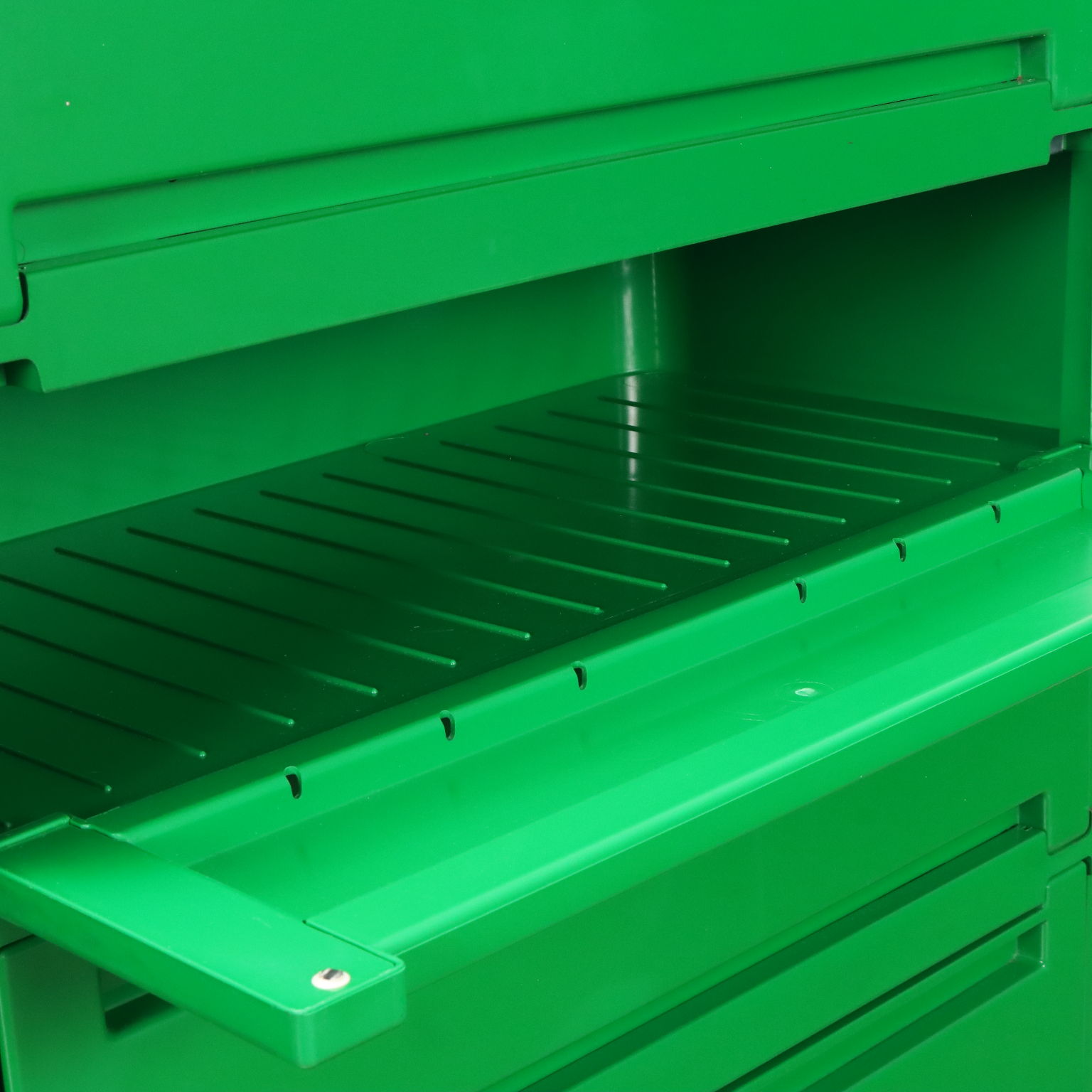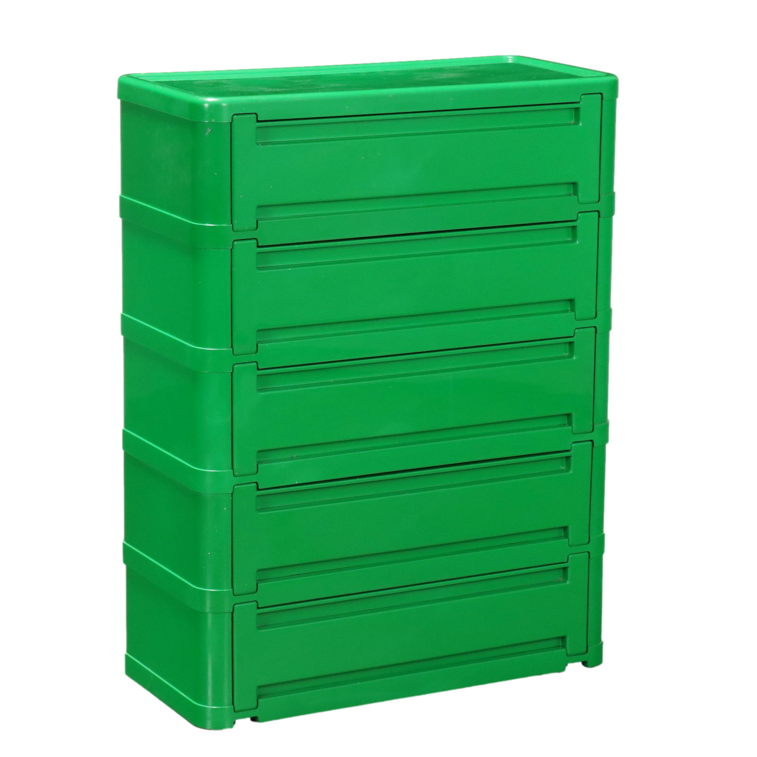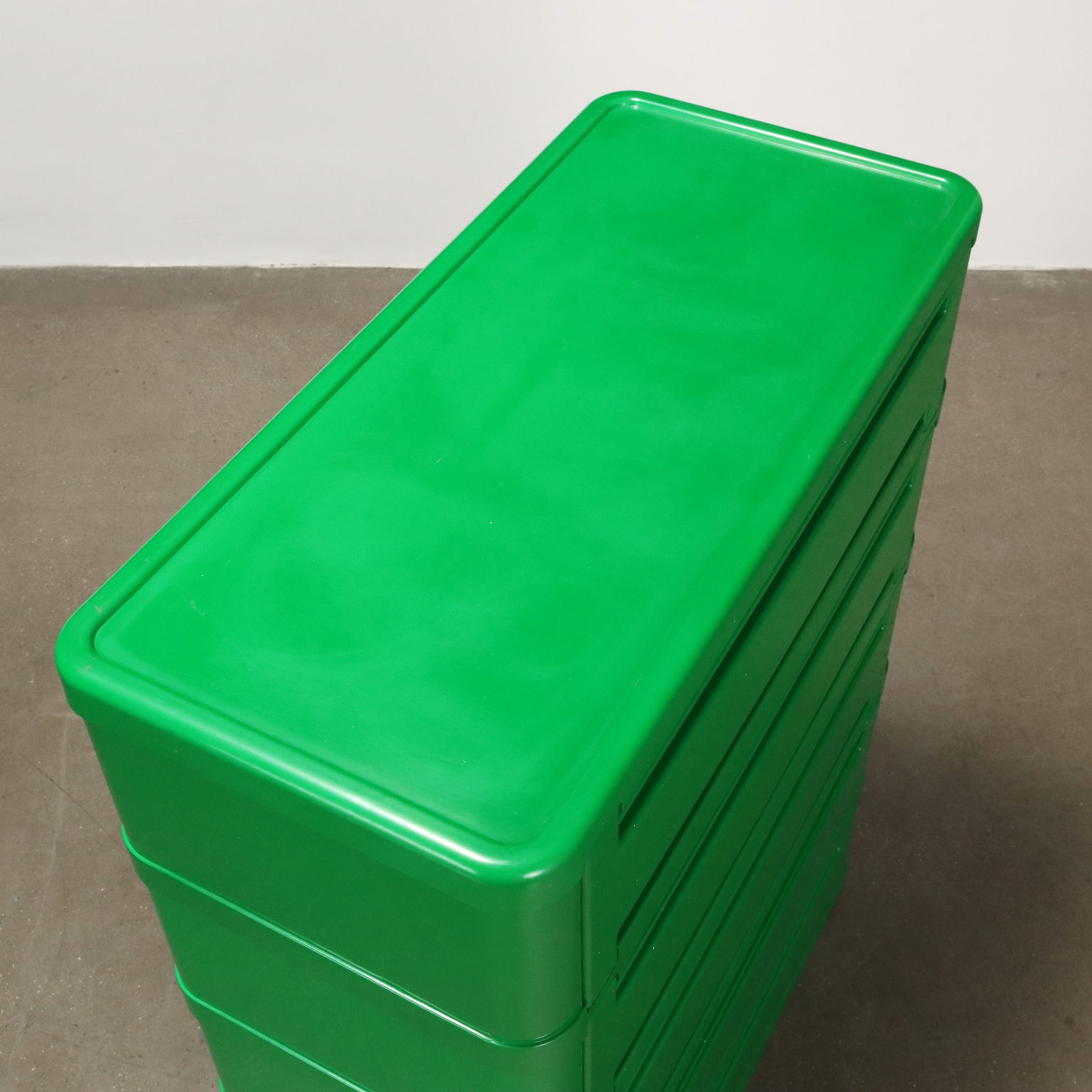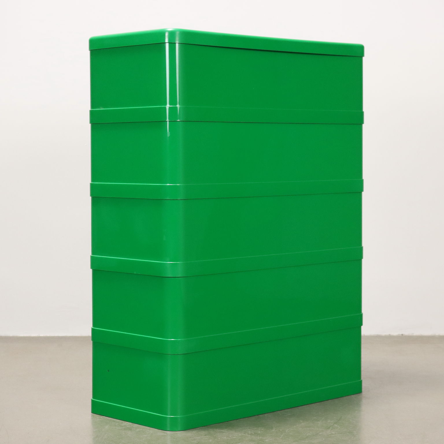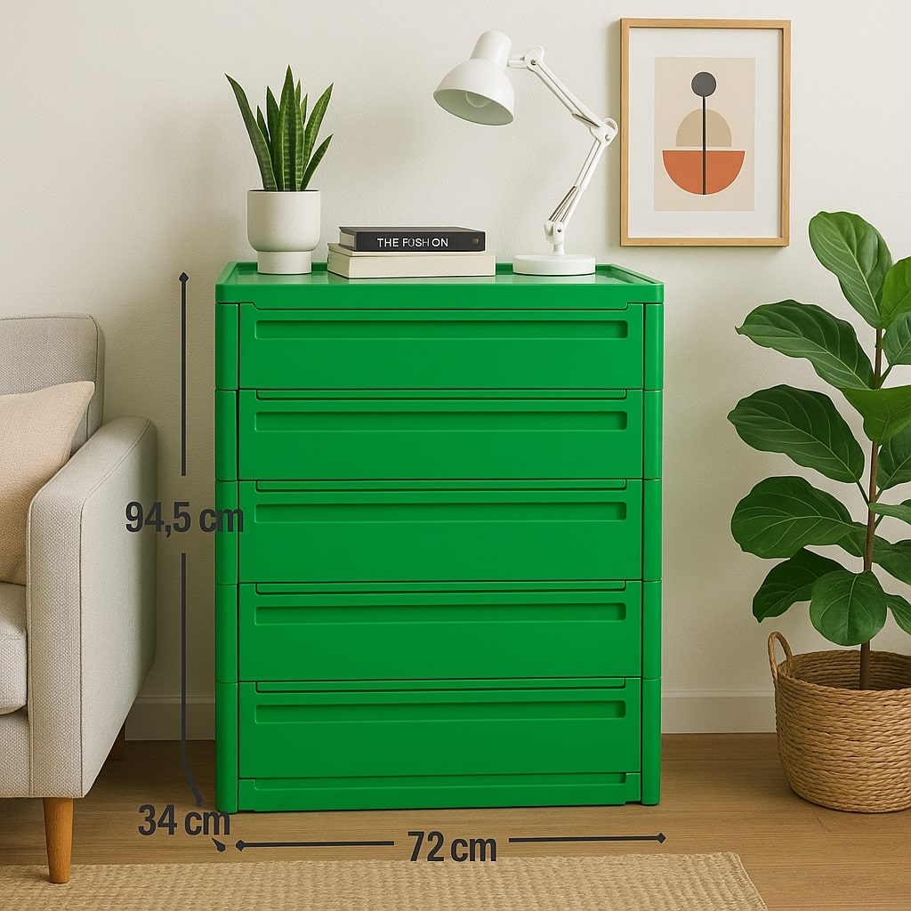 Descripción Mueble modular en material plástico verde con cinco cajones.