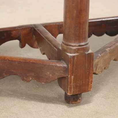 Pequeña consola barroca en nogal, tablero en forma de media luna sostenido por tres patas torneadas unidas por balaustrada y travesaños en la base. Italia, siglo XVIII.