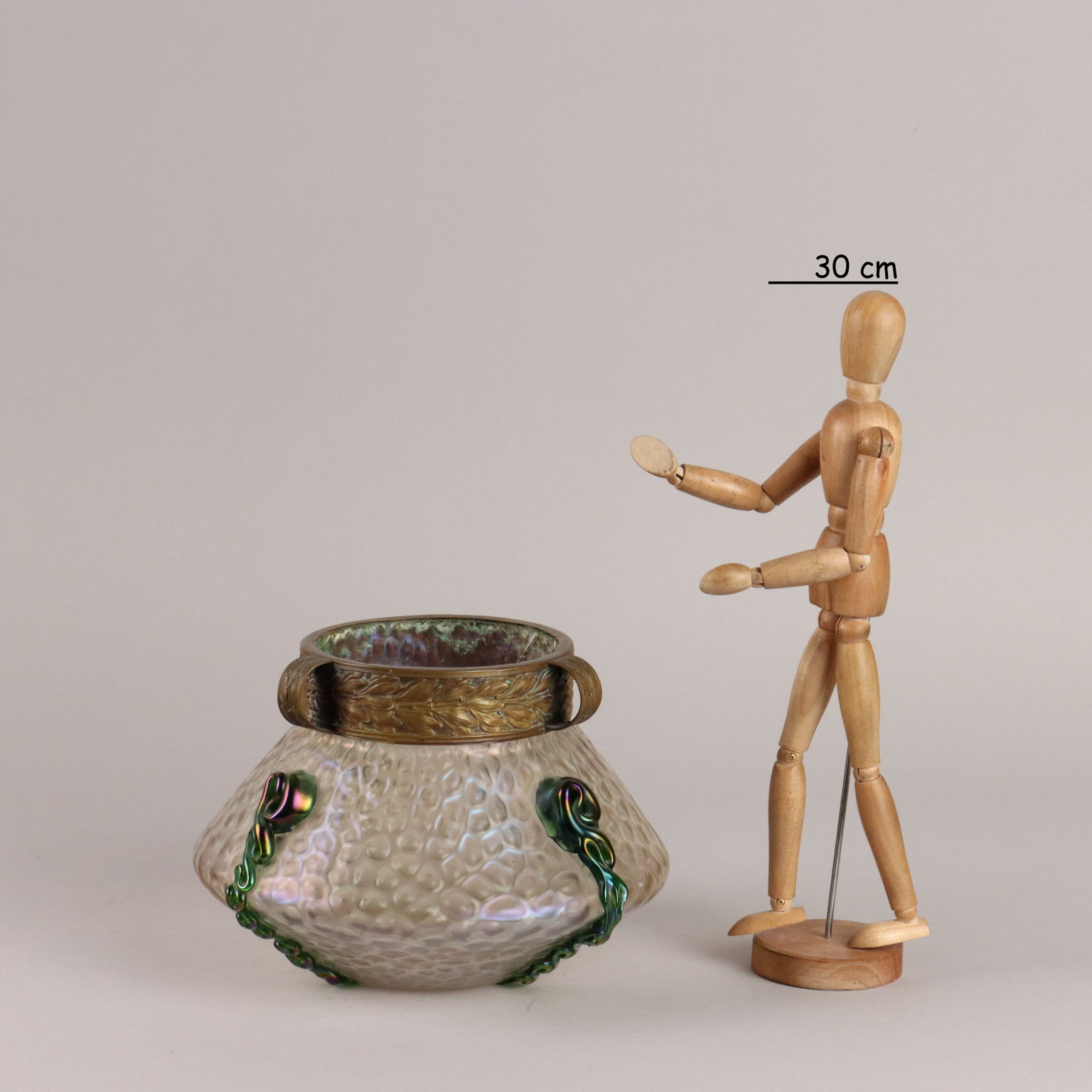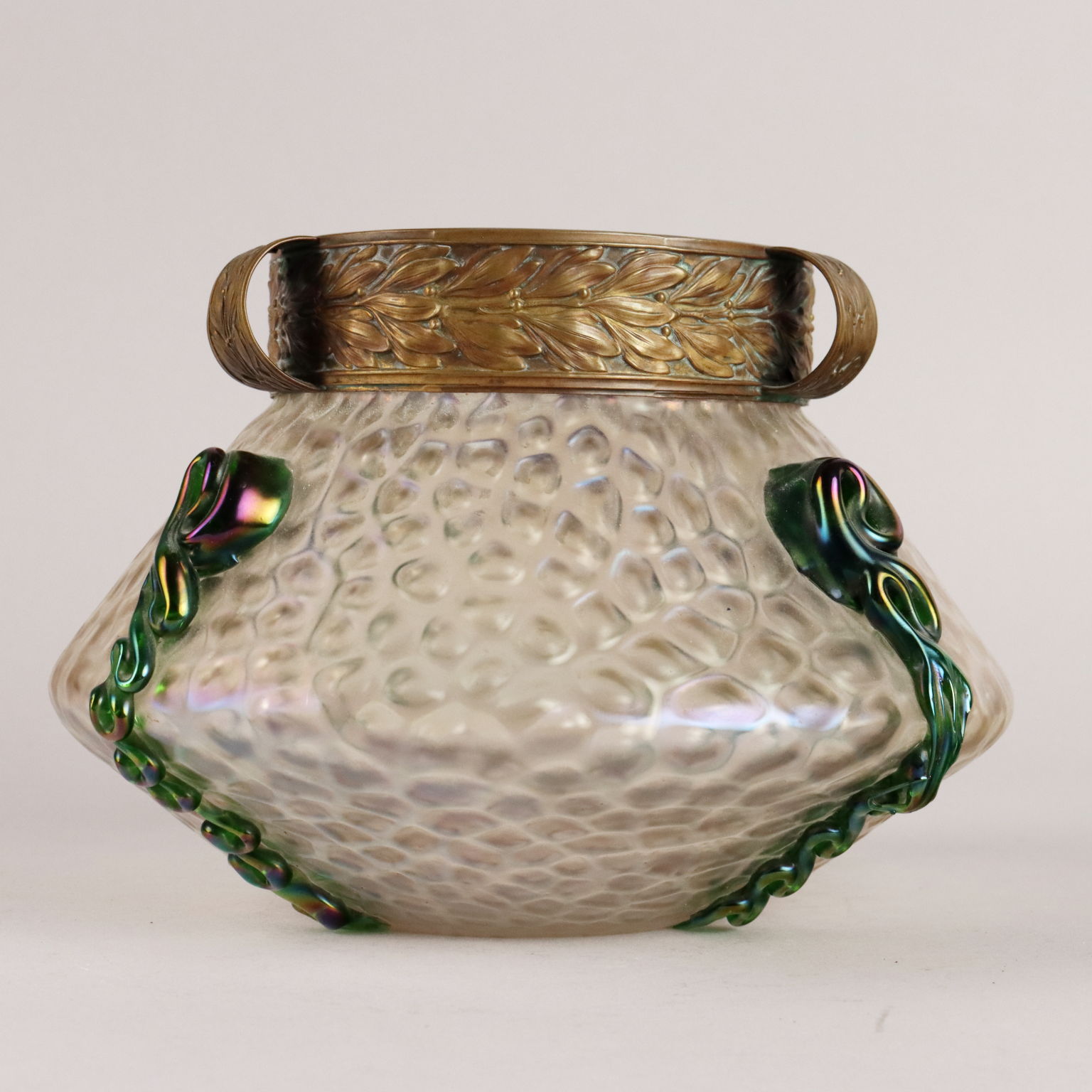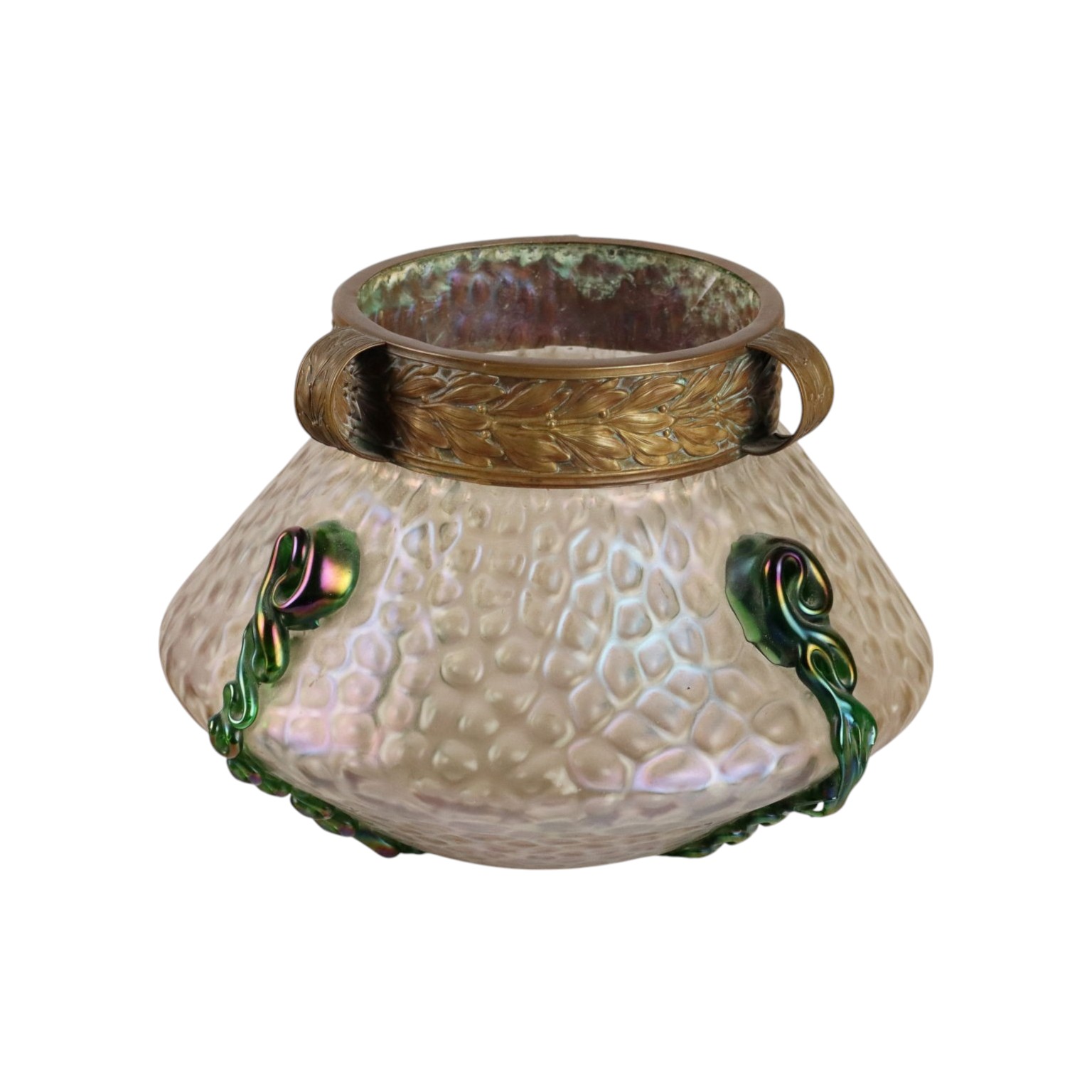 Jarrón con cuerpo bicónico en vidrio opalino trabajado con efecto martillado y aplicaciones de cintas de vidrio verde iridiscente. Cuerpo aplanado y cuello recto recubierto de un borde con asas en estaño de latón repujado, decorado con manojos de hojas y bayas.