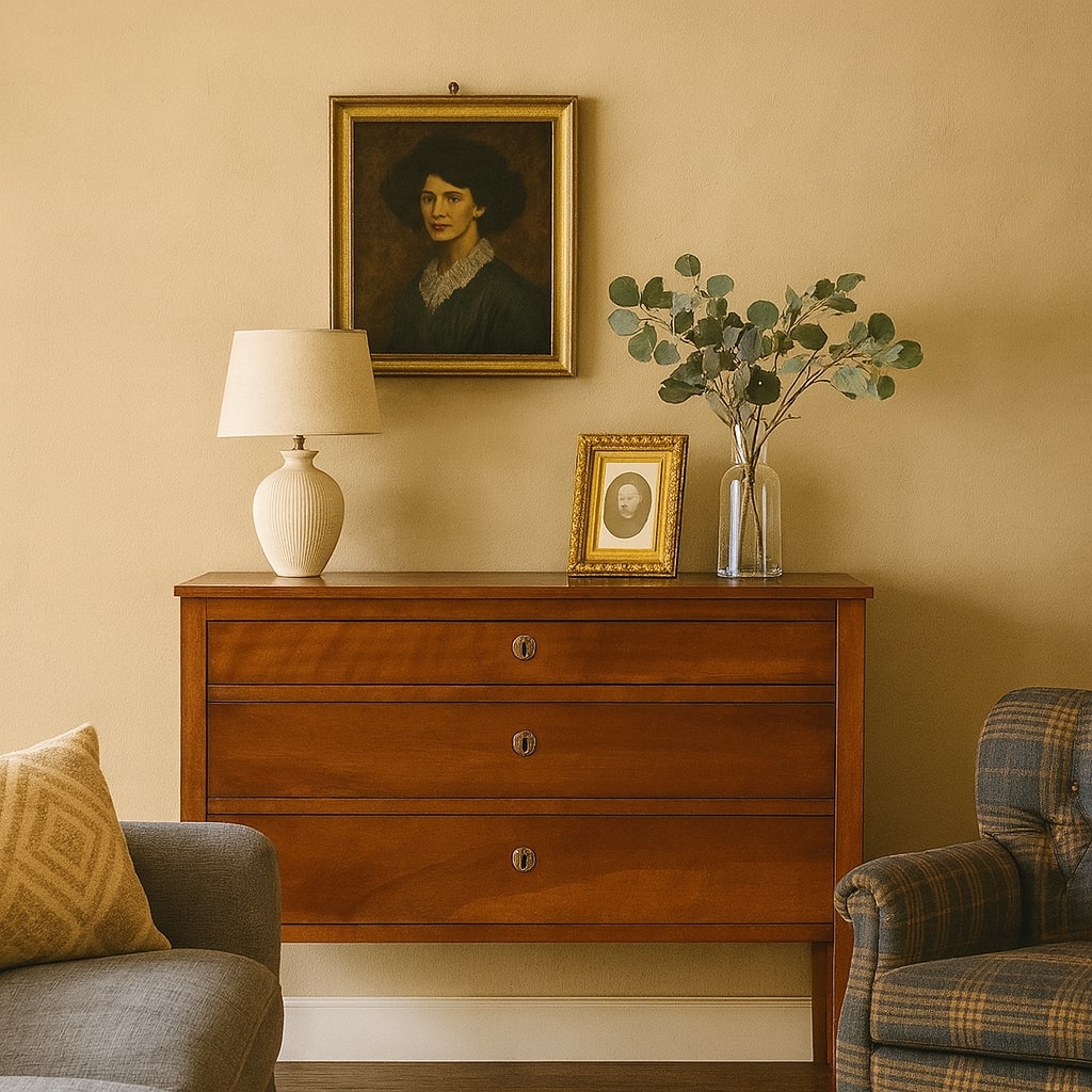 Cómoda vintage Directorio, fabricada en nogal macizo, con montantes con patas piramidales truncadas y tres cajones en el frente, el más pequeño bajo la tapa. Interior de álamo. La cómoda Directorio, con su simplicidad formal y la calidad de sus materiales, que la hacen elegante sin ser exigente, se presta a integrarse en entornos muy modernos.