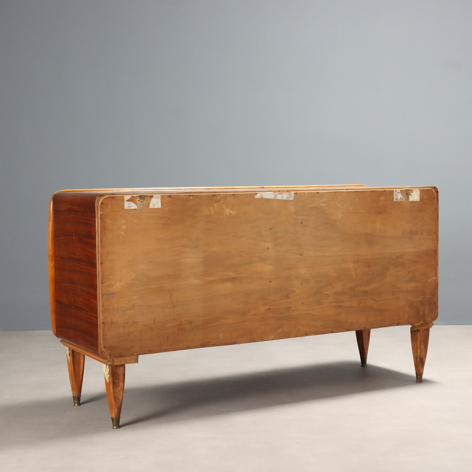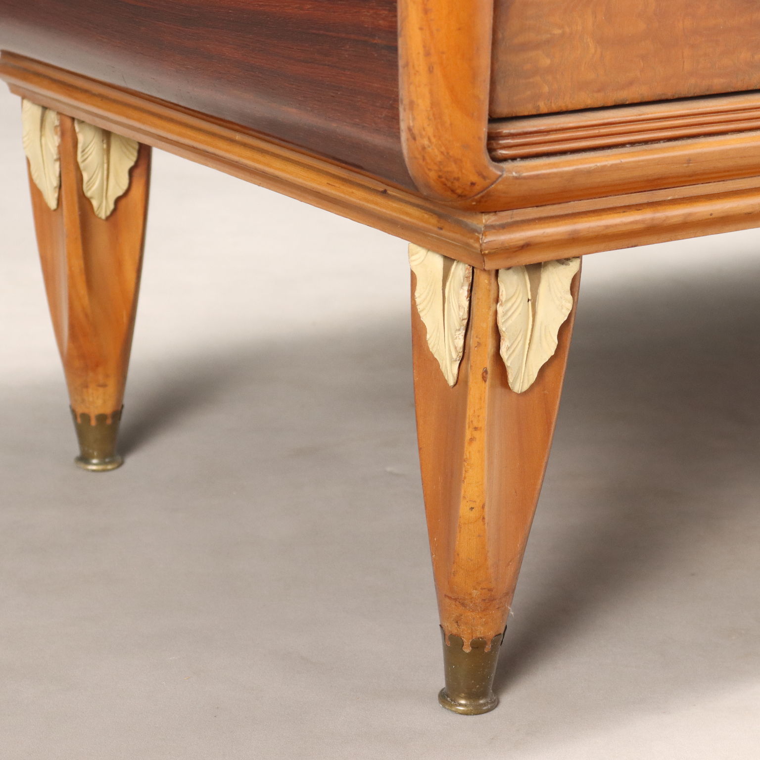 Cómoda vintage de seis cajones con chapa de madera exótica y nudosa, patas de madera teñida tallada y tiradores de latón.