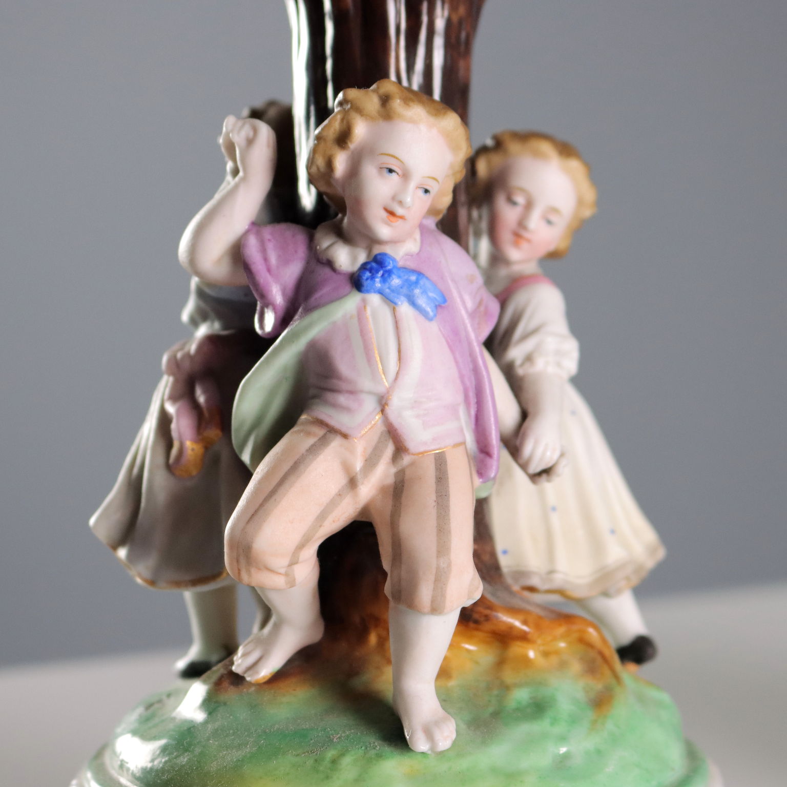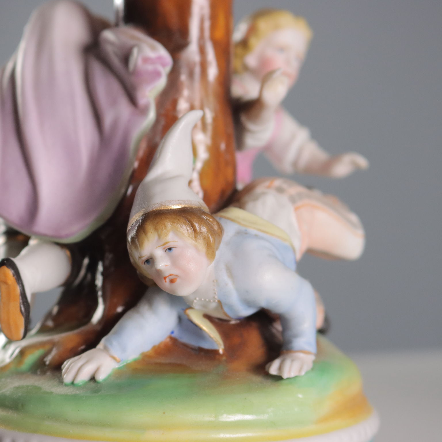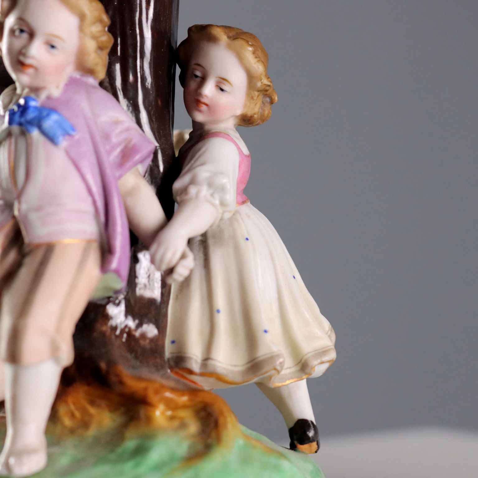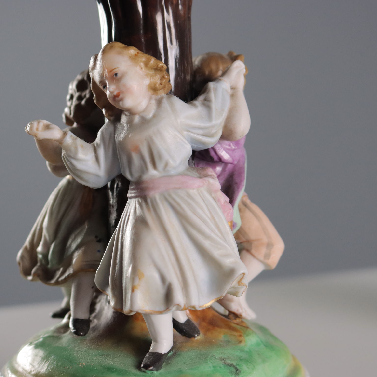 Un par de candelabros de porcelana policromada. Las escenas representan juegos de jardín alrededor de troncos de árboles.