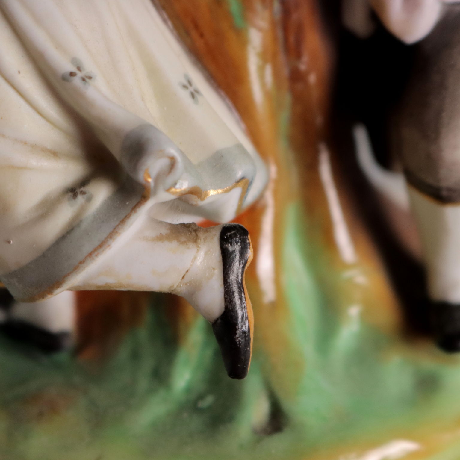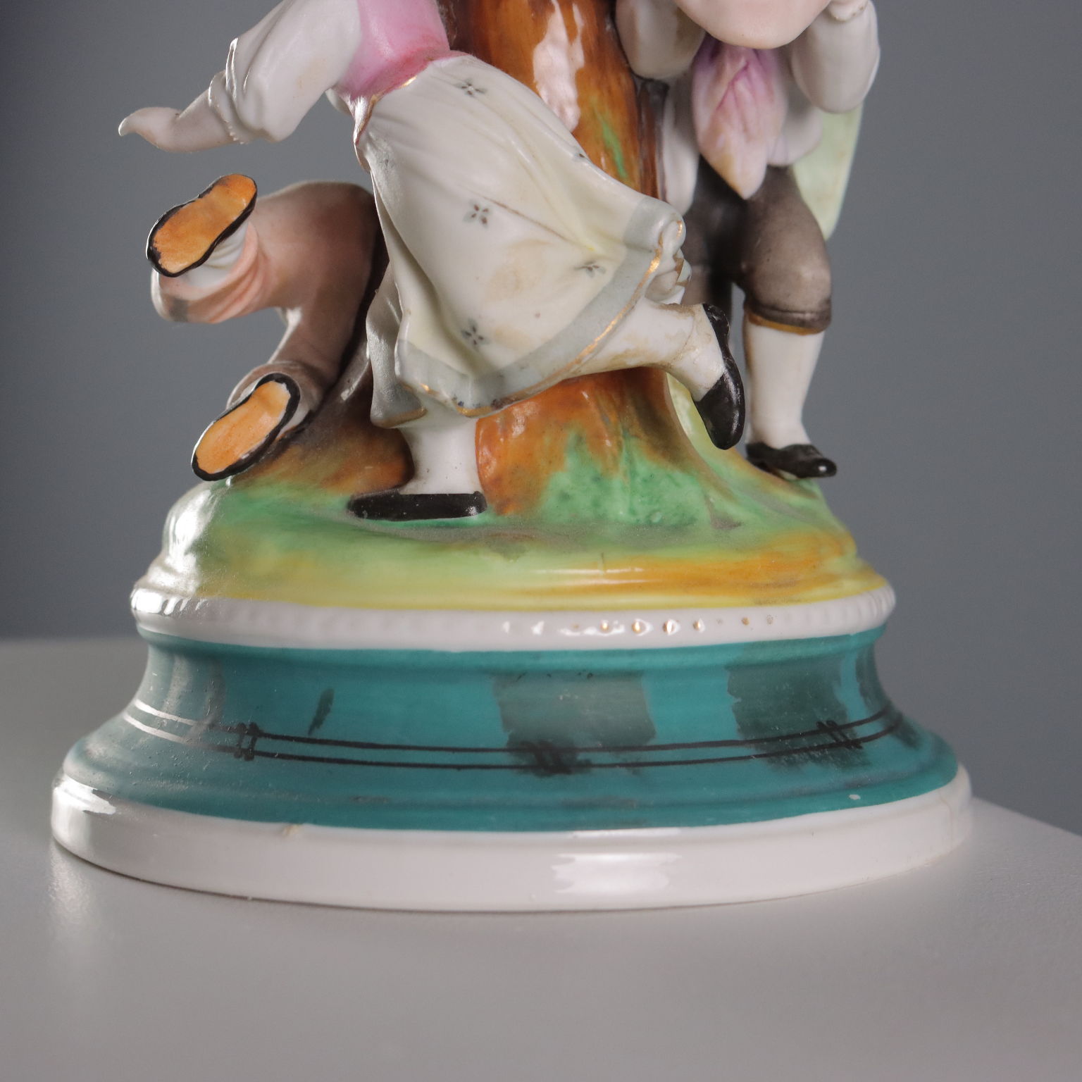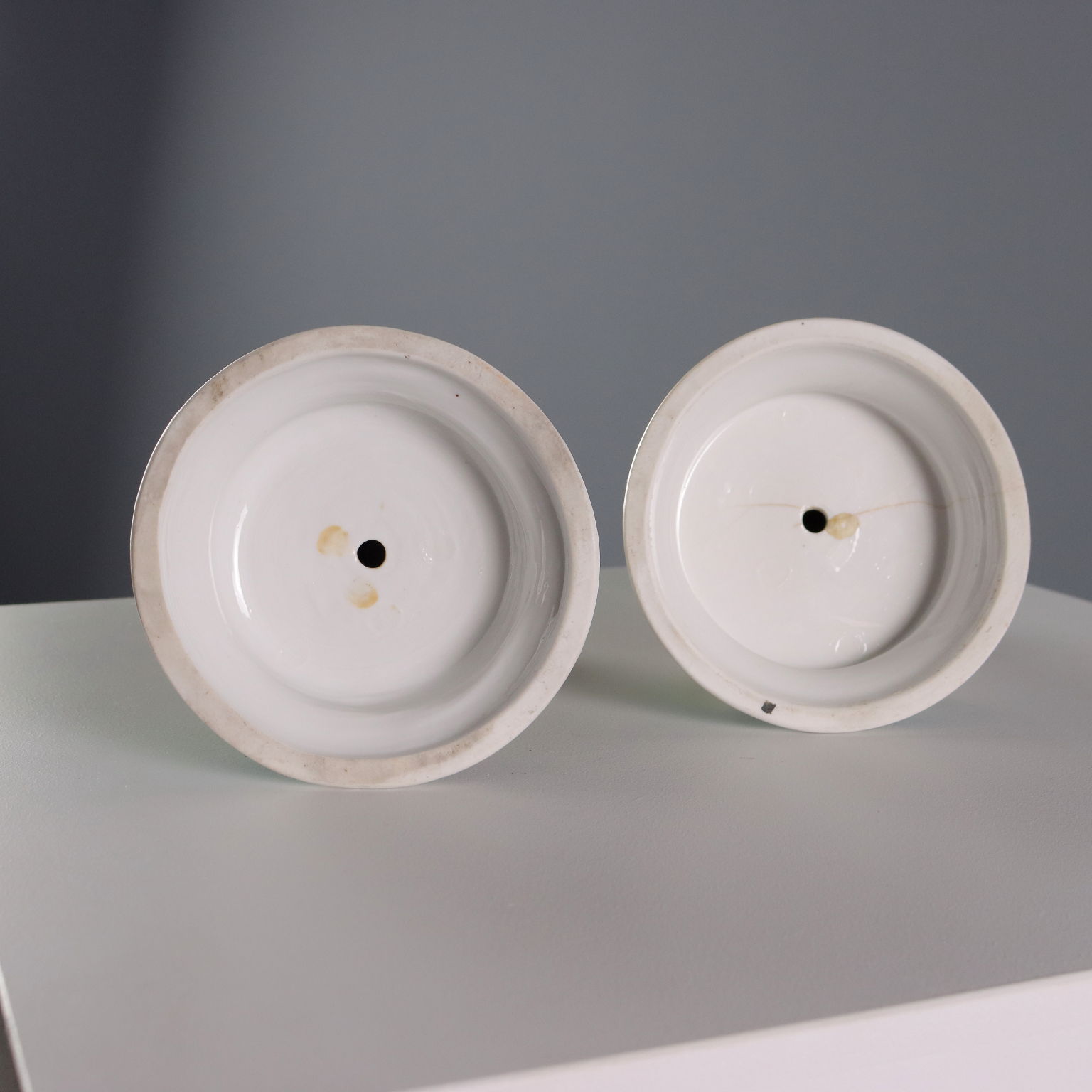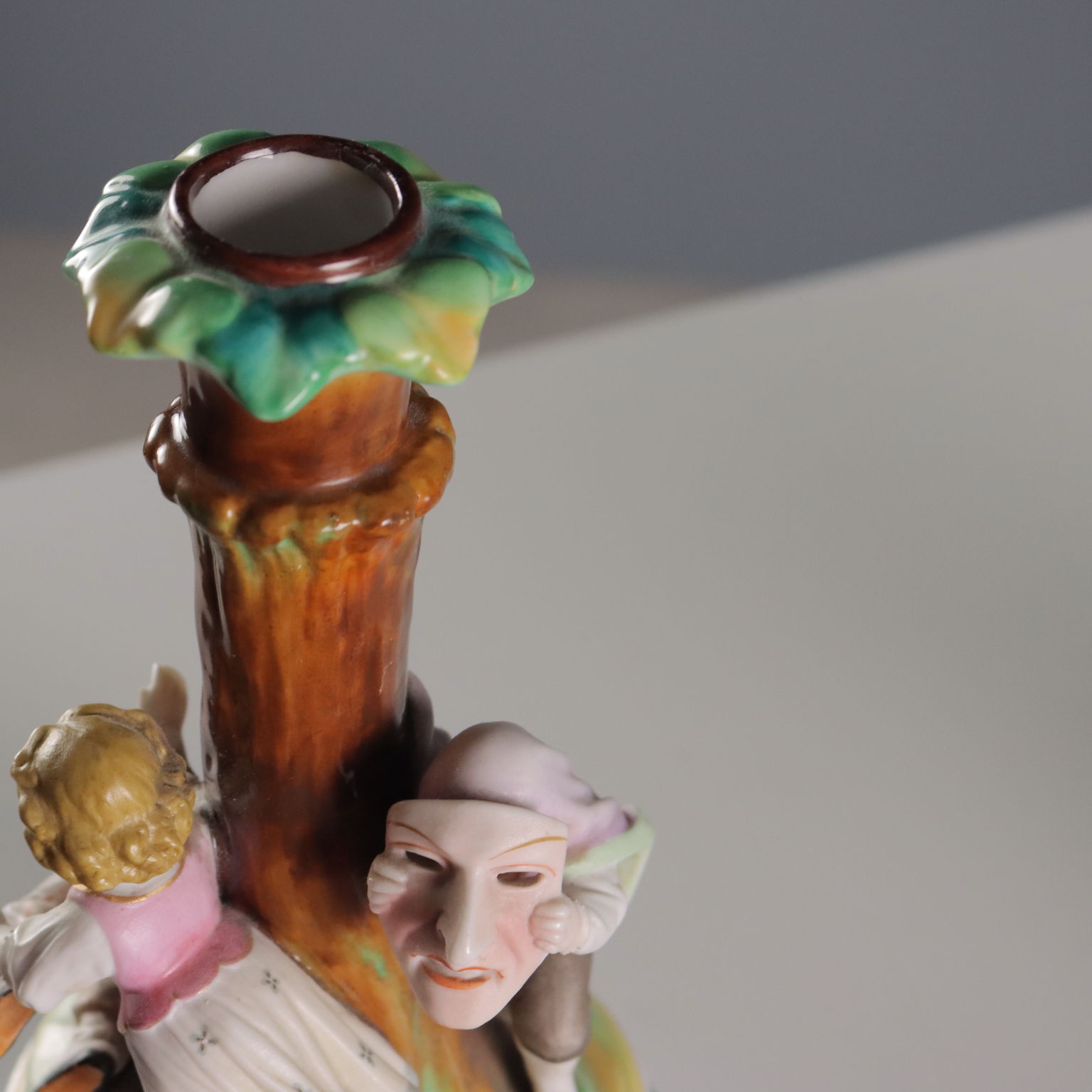 Un par de candelabros de porcelana policromada. Las escenas representan juegos de jardín alrededor de troncos de árboles.