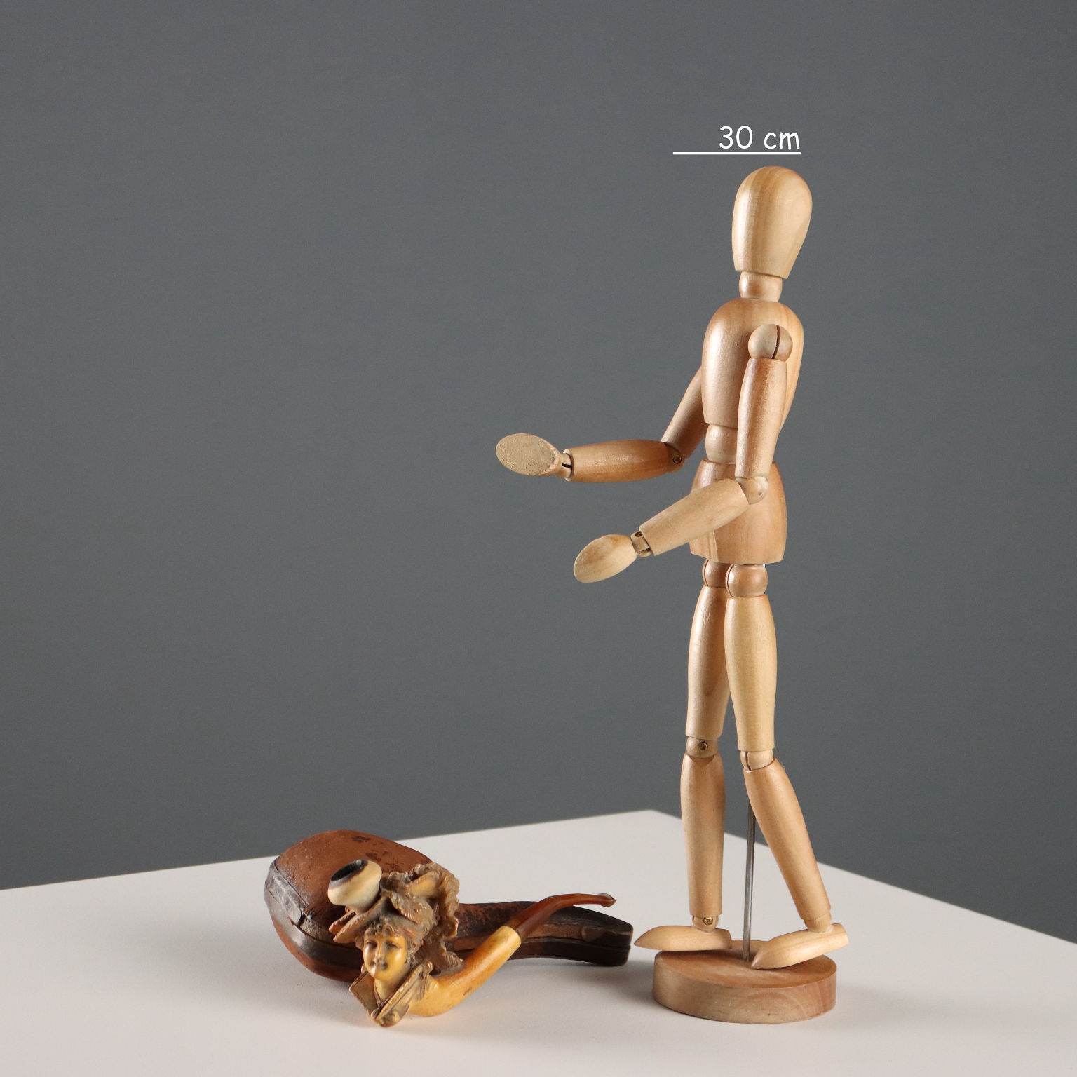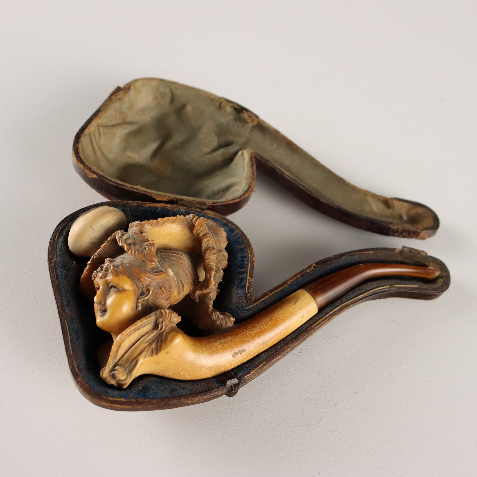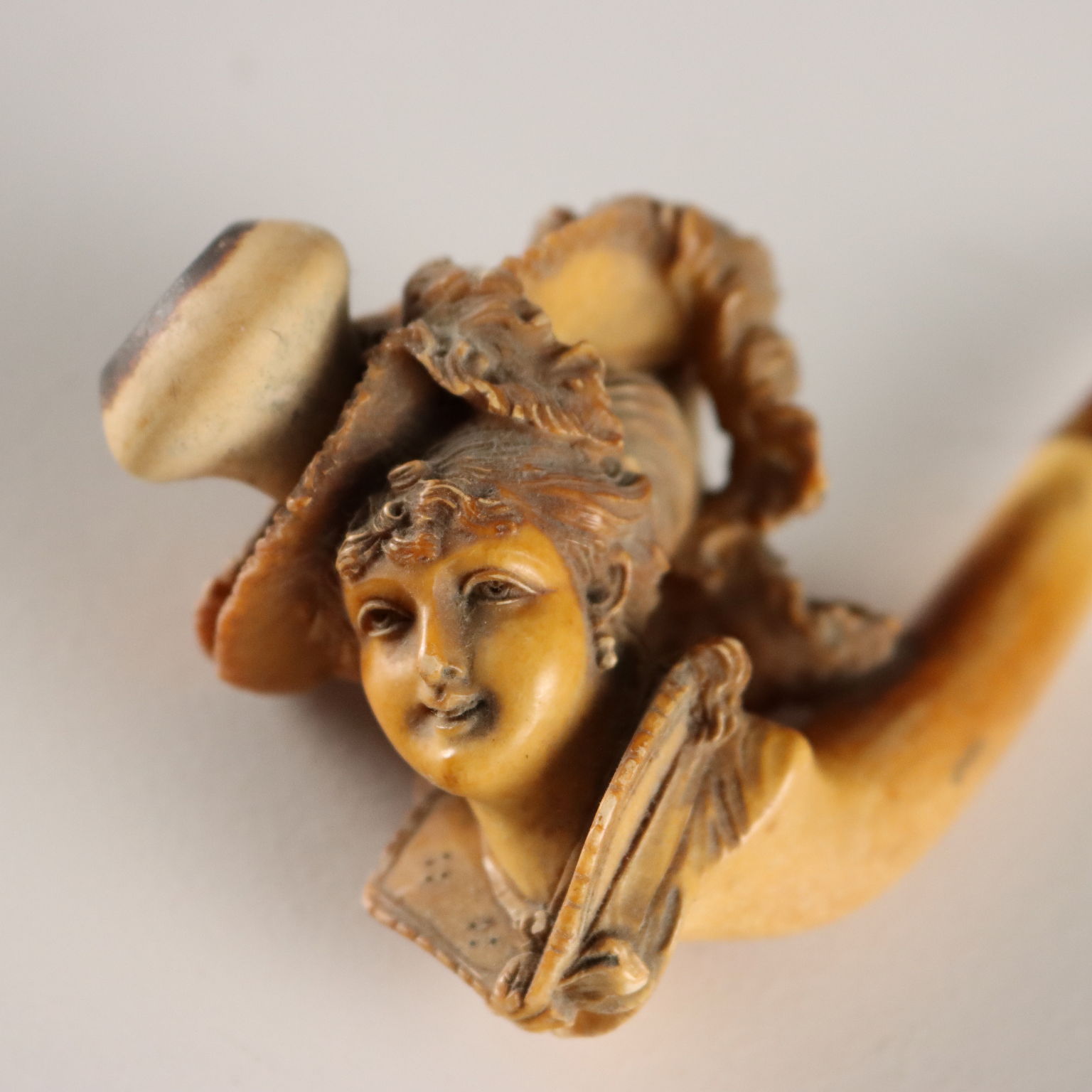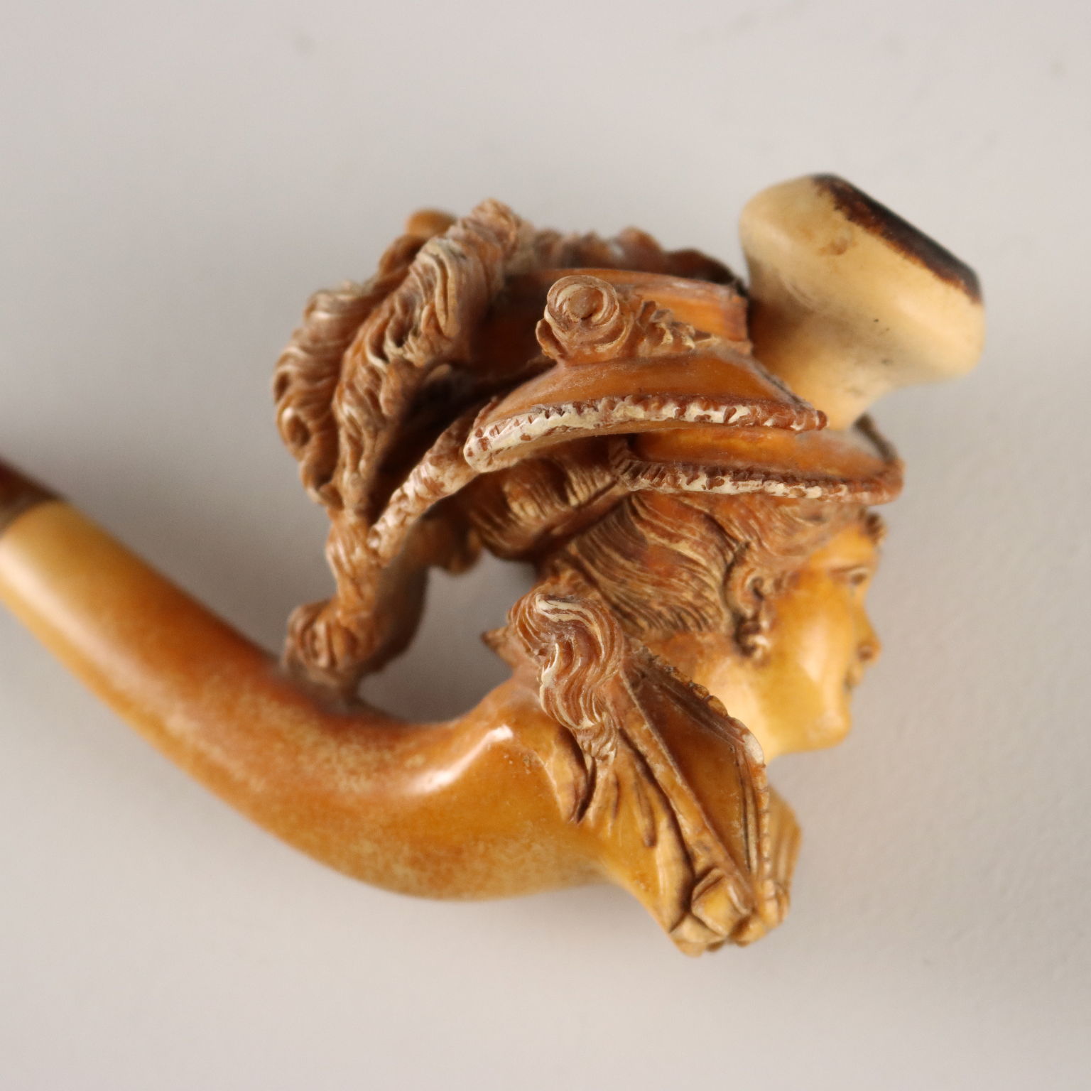 Pipa de espuma de mar con el rostro de una noble con sombrero. Boquilla de ámbar. Estuche contemporáneo.