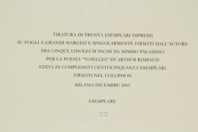 Cinco aguafuertes y linóleo color contenidas en una sola carpeta. Los pisos de linóleo fueron grabados por el artista para el poema "Vojelles" por Arthur Rimbaud. Los grabados, impresos en hojas grandes, los márgenes son todos firmados y numerados. Cada hoja tiene, en la transparencia, el logo de la tienda. La carpeta es incompleta, faltan tres hojas introductorias.