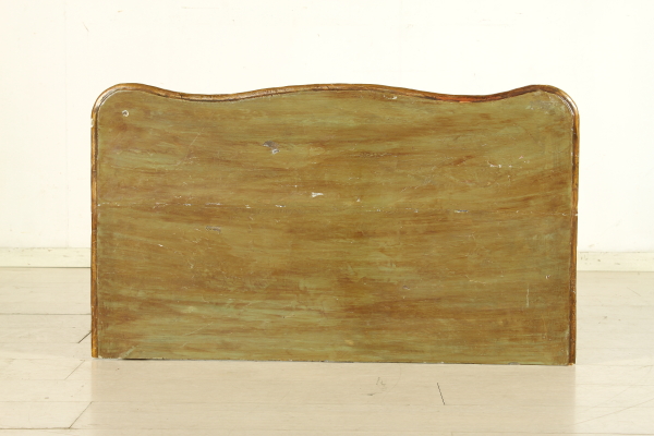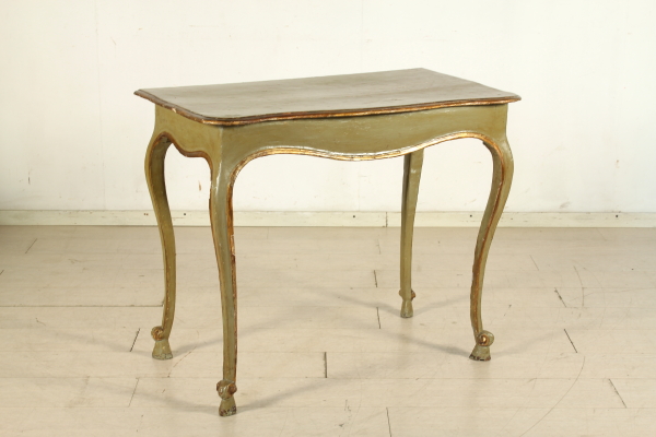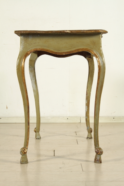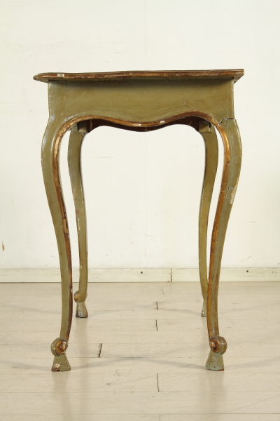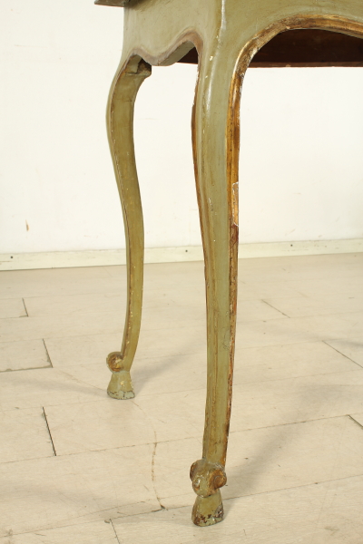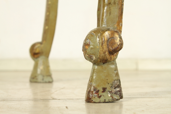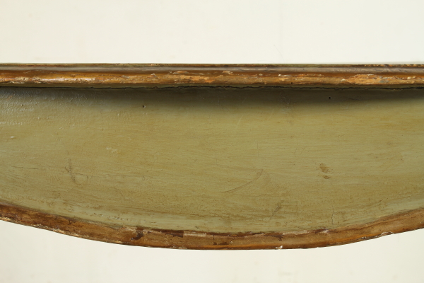 Consola de pared, verticales y talladas piernas terminando con pie de cabra presenta faja y en forma de plan. Totalmente laqueado con piezas de oro.