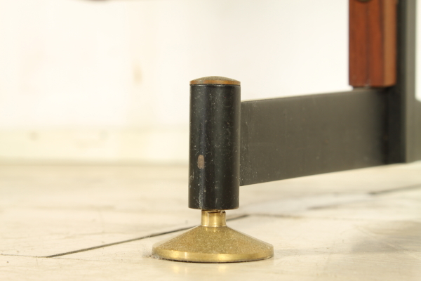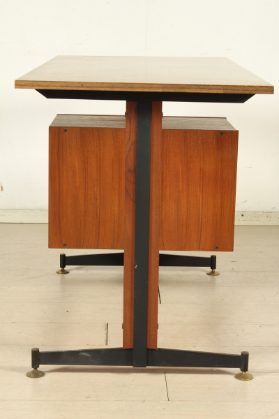 Escritorio años 50-60; chapeado de madera de teca y cubiertas de formica piso, metal, latón pintado. Buen estado, muestra poco signos de desgaste.
