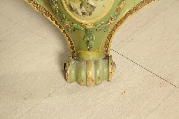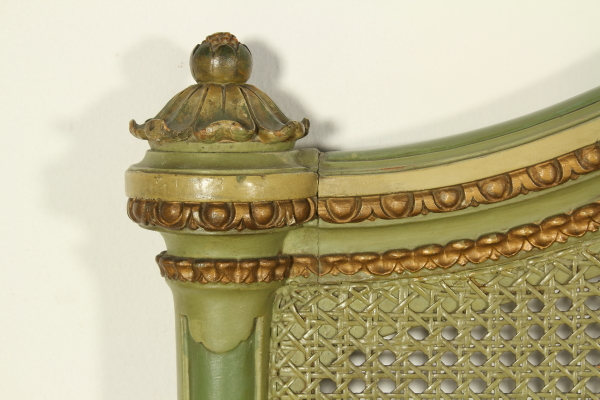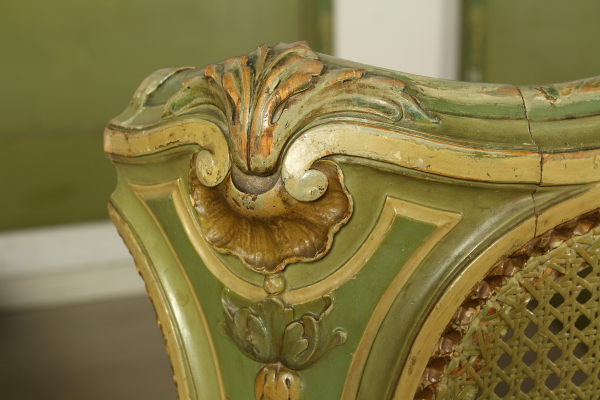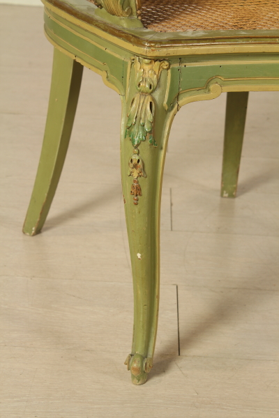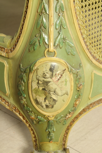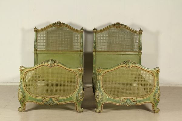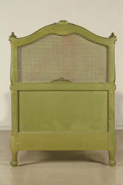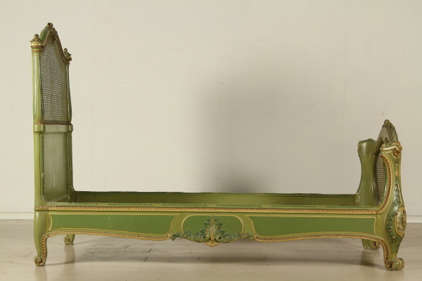 Cama y la silla de estilo barroco tardío. De madera tallada a mano y reservas de movimiento con paja de Viena. Totalmente laqueado y decorado de policromía.