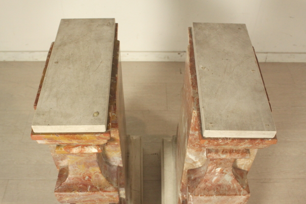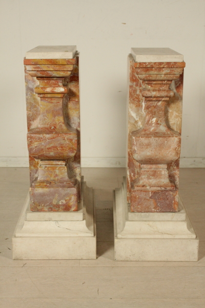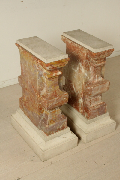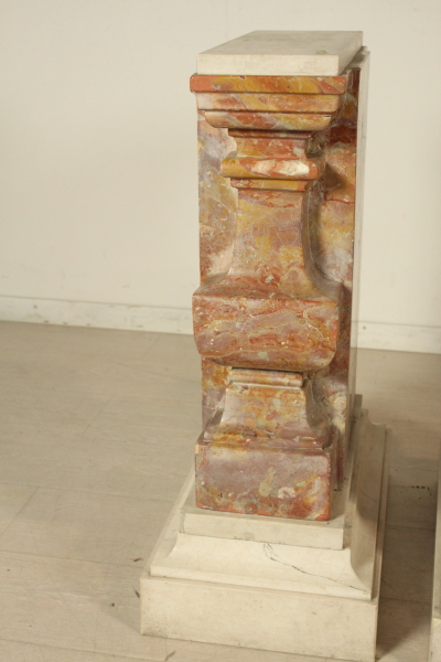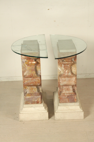 Par de consola de mármol. Consola apoyado por zapatas en mármol rosado y blanco. Consta de tres partes. Plan de un cristal de media luna.