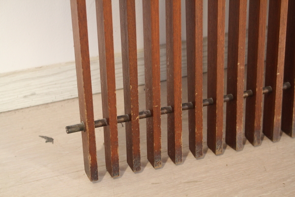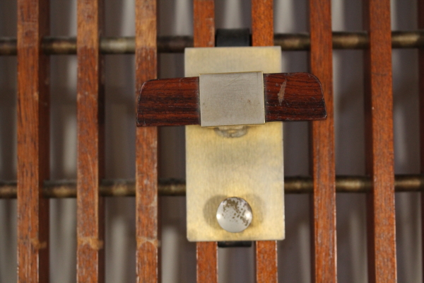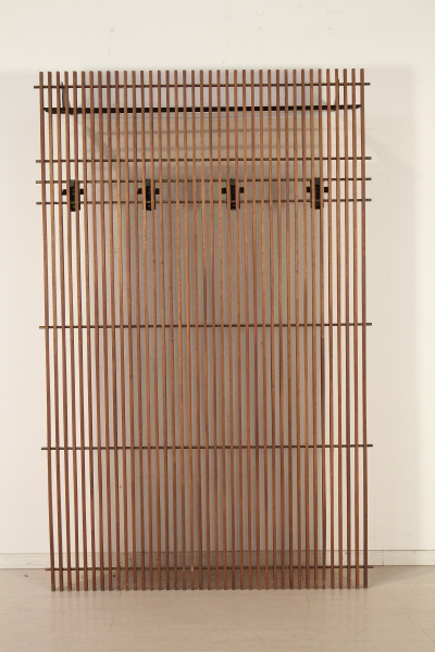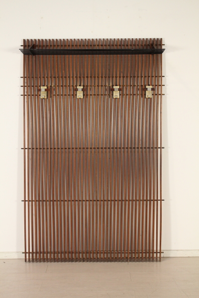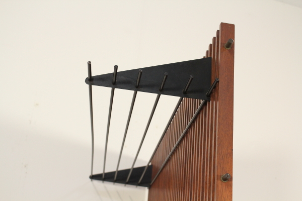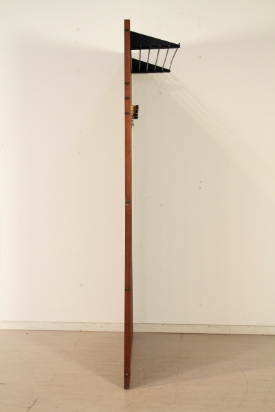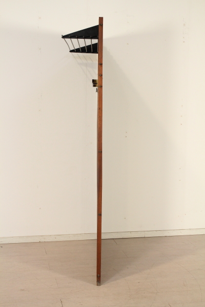 Perchero de pie de 50 años. Capa de la pared de madera de teca, latón, metal pintado. Feria de condición, tiene algunos signos de desgaste.