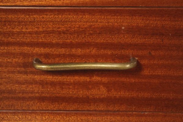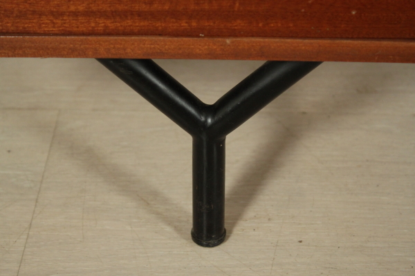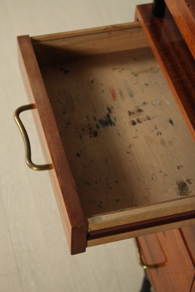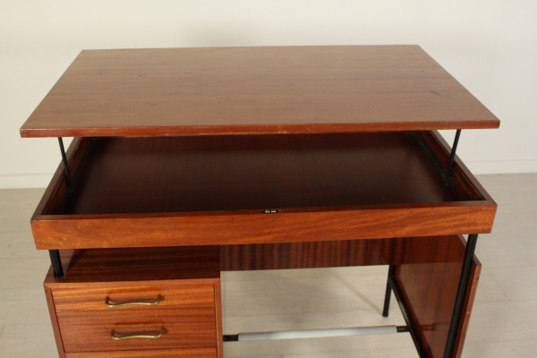 Escritorio de 50 ó 60 años. Escritorio con piso ajustable; Caoba chapada metal pintado, madera, latón. Buen estado, muestra poco signos de desgaste.