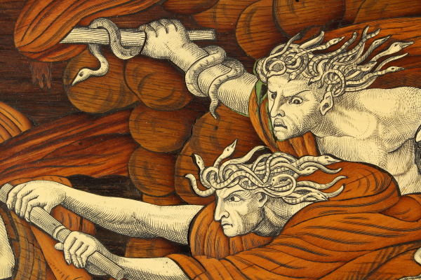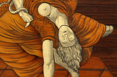 Mesa de chapa de madera de abeto con incrustaciones de palisandro y nogal, boj y marfil; grabado de buril y sombrío. Probablemente forma parte de un móvil, parece una pintura neoclásica con encanto. Oreste izquierda, acompañado por su amigo/amante Pilade Mira con horror la aparición de las Erinias, personificaciones femeninas de la venganza, lo persiguen por el asesinato de Clitemnestra, mintiendo vierte entre sus brazos.