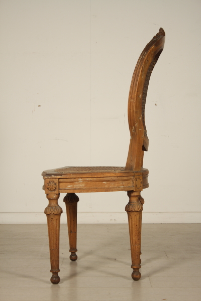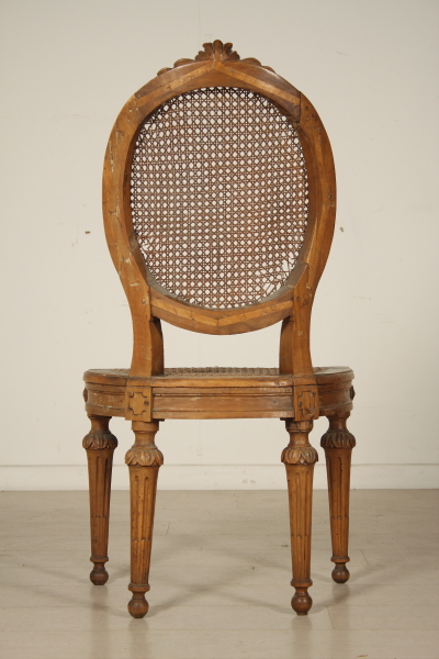 Piernas tronco cónico recto y rudentate tallada. Respaldo ovalado gama con marco tallado. Asiento y cañas.