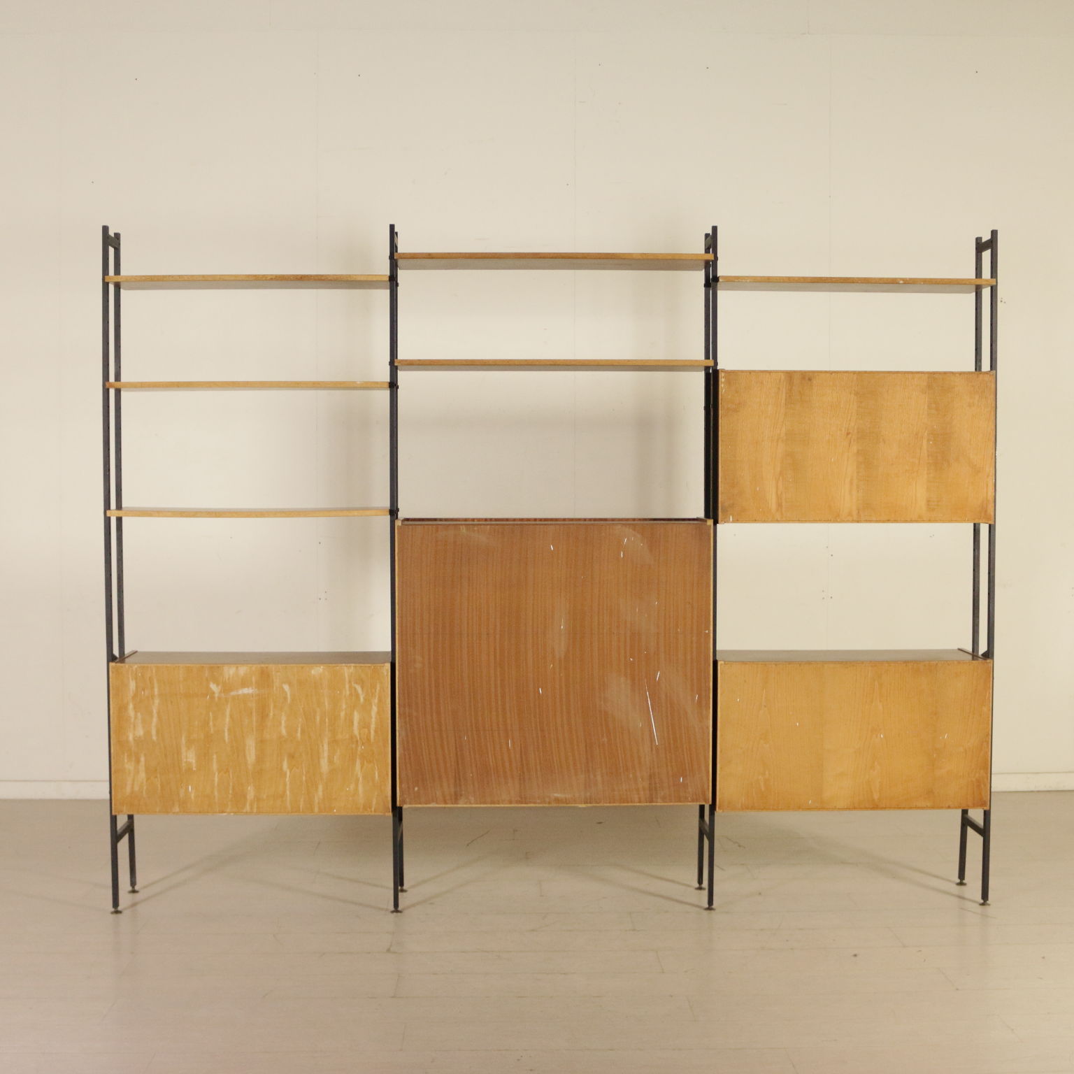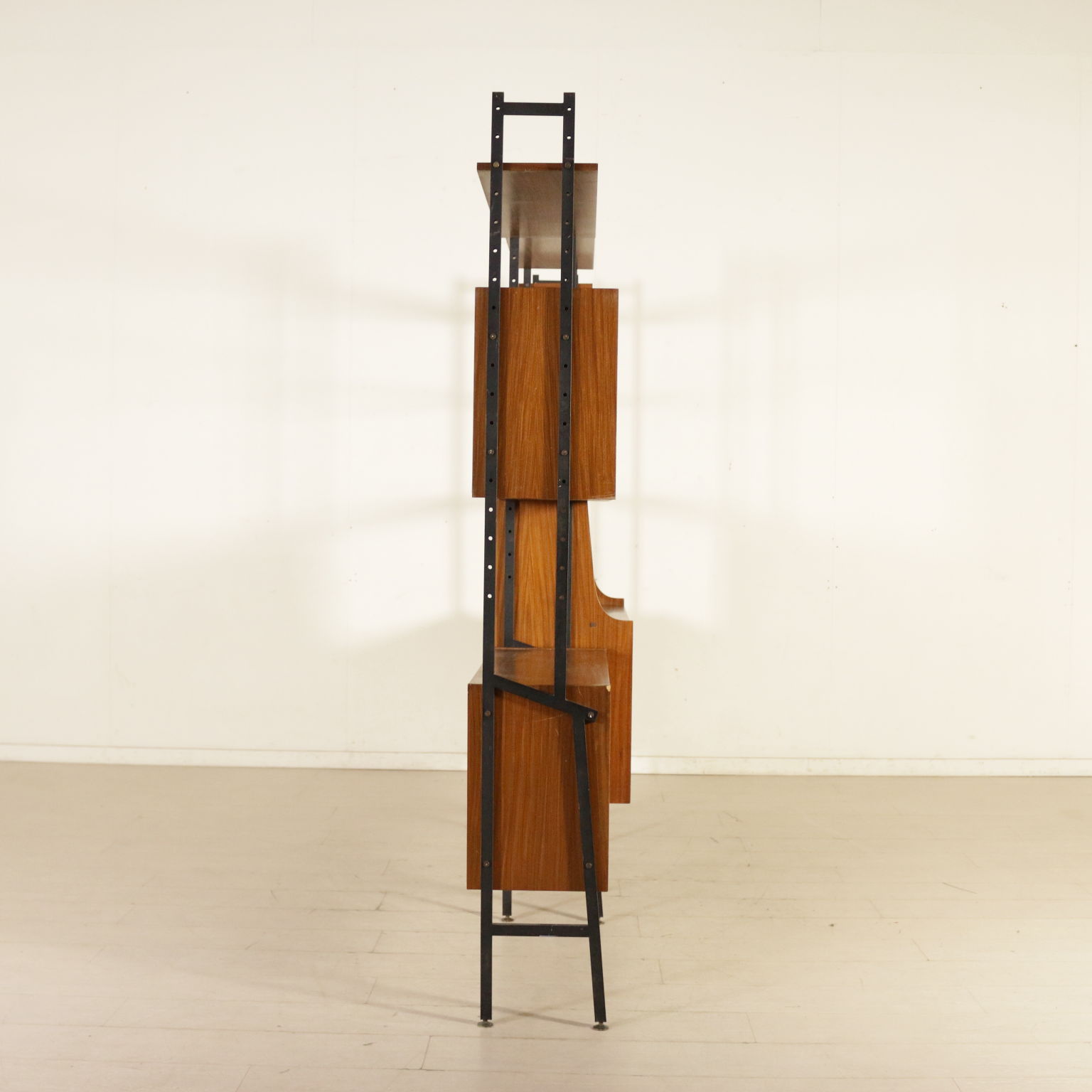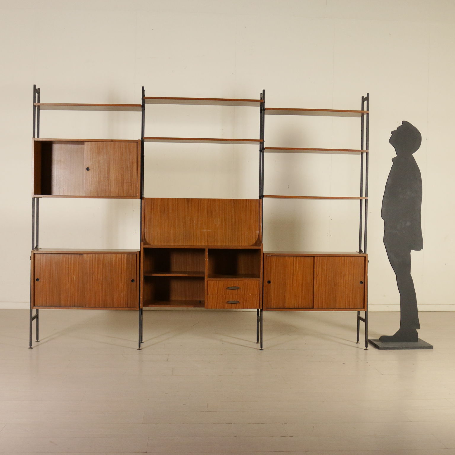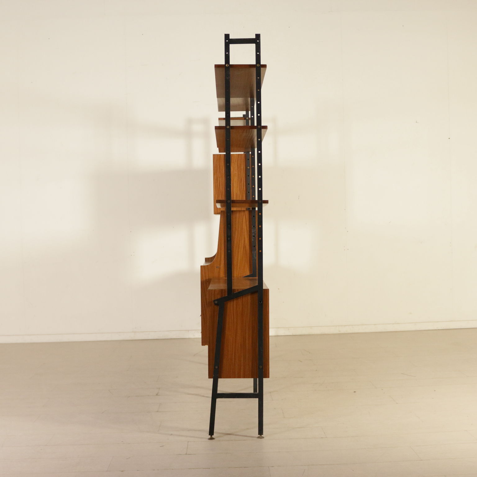 Libreria ad elementi a posizione regolabile; legno impiallacciato mogano, montanti in metallo.