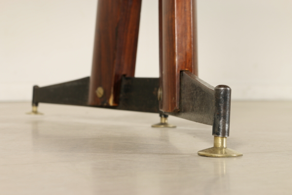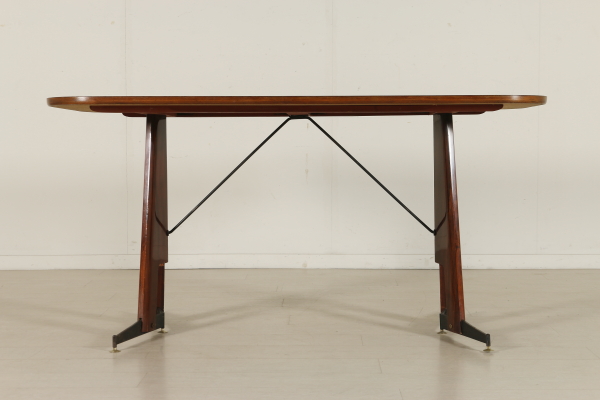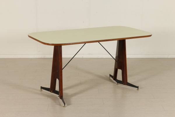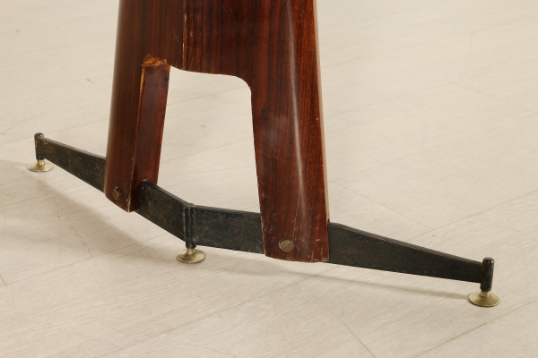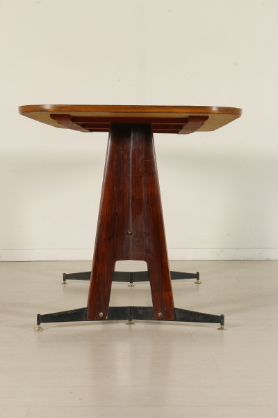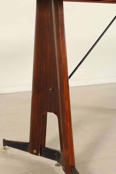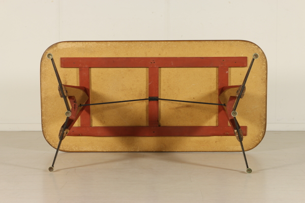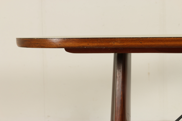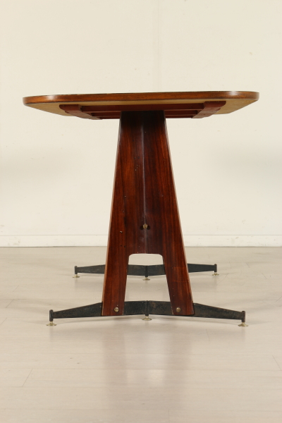 Tabla; de madera cubierta en palisandro, la formica y el metal. Buen estado, muestra pequeñas señales de desgaste.