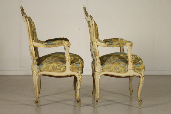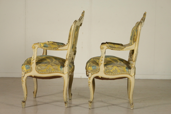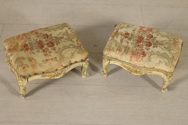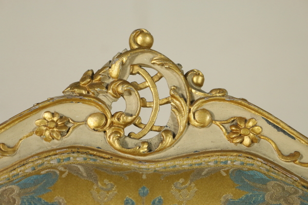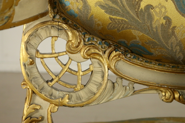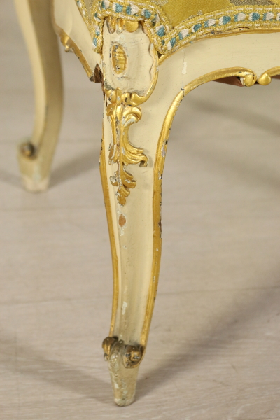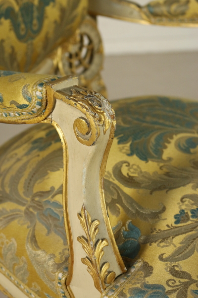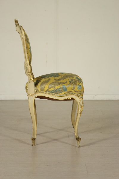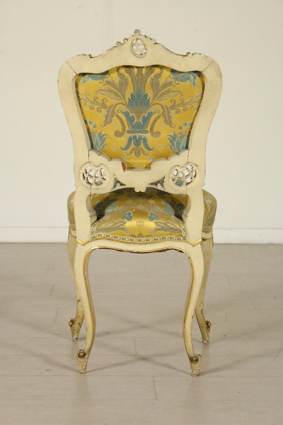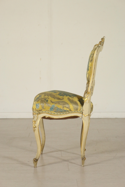 Desde la línea de movimiento y grabado. Asiento y respaldo tapizado. Tallas en dorado.