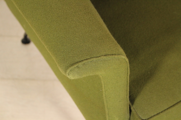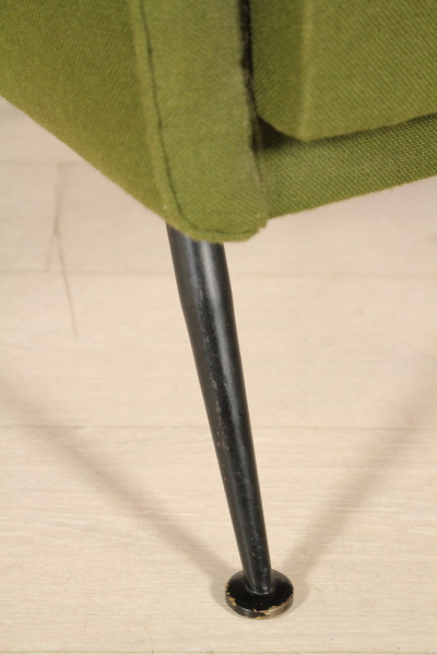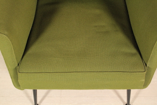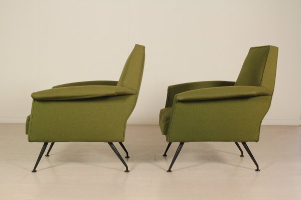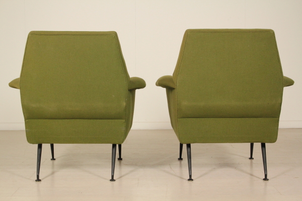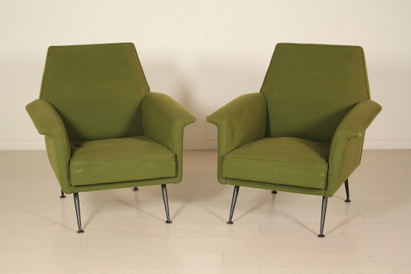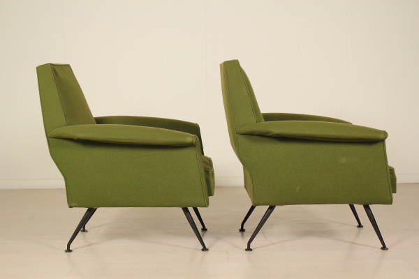 Par de sillones; tela superior, suave, piernas del metal. Buen estado, muestran algunos signos de desgaste.